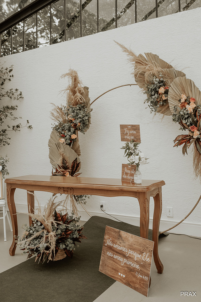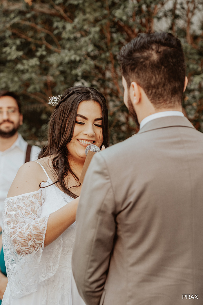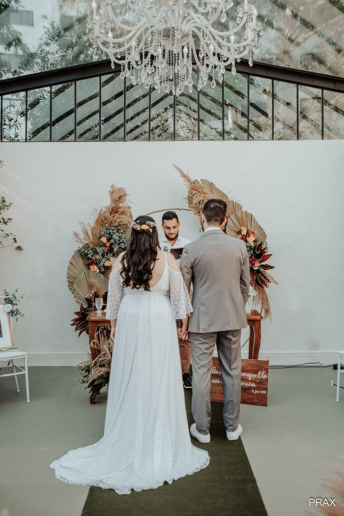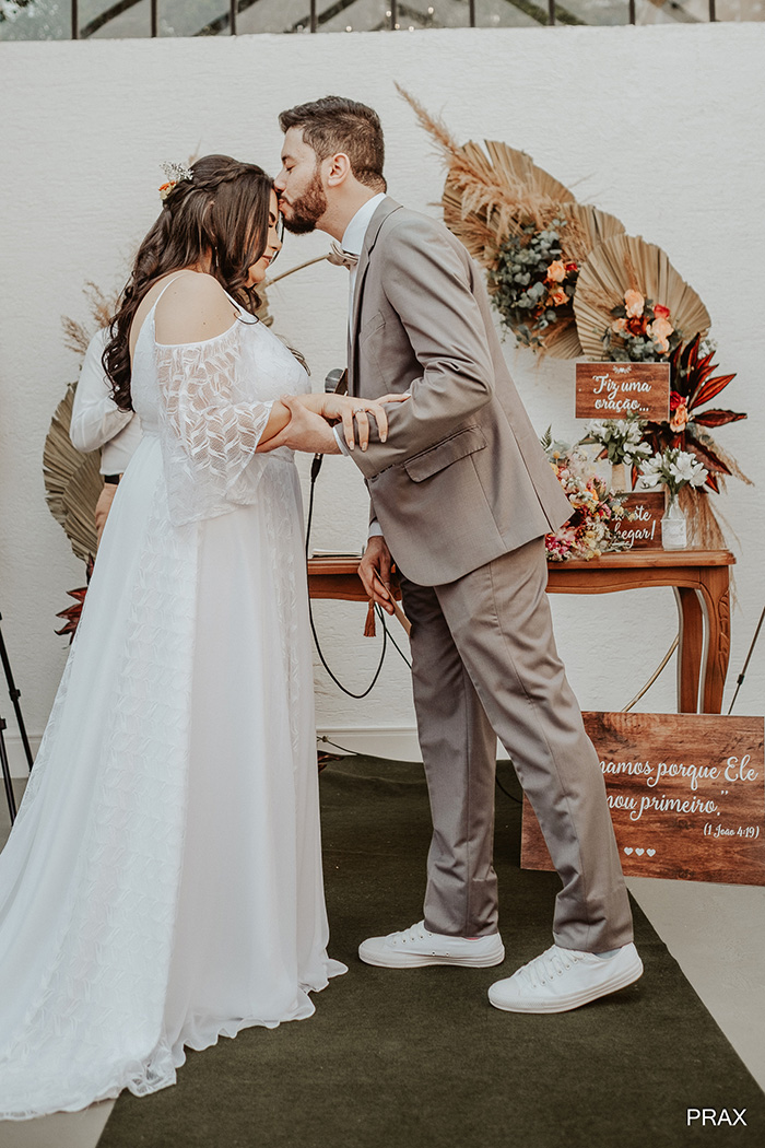 A cerimônia foi pura emoção! A noiva conta que: “Ver nossas mães emocionadas, ao escrever os votos e a entrada da noiva, além de um momento em que pastor trouxe na cerimônia um objeto que representasse nossa relação, e tirou do bolso uma concha. Estamos nos mudando do Brasil novamente e ele fez uma analogia sobre a concha ser um lugar que representasse casa, nosso lar, lugar de conforto um no outro”.