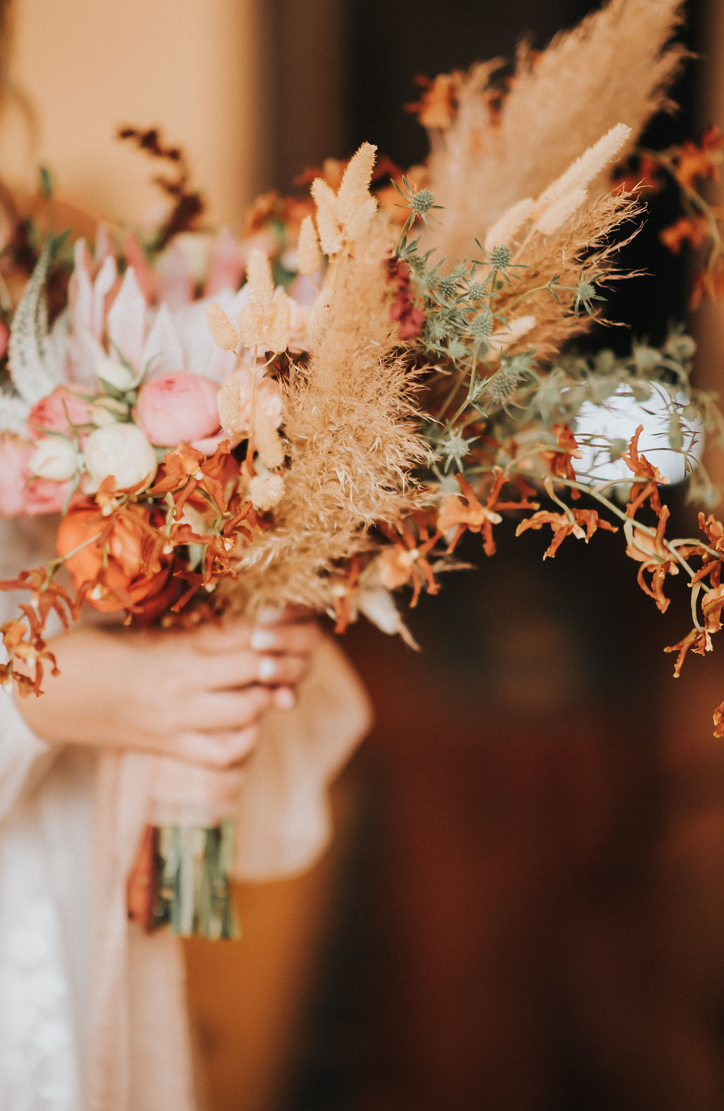 - Nuvens aéreas de capim dos pampas em cima das mesas dos convidados, na placa de bem vindo, nos arranjos de mesa dos convidados, na nave e altar da cerimônia e no buquê da noiva;