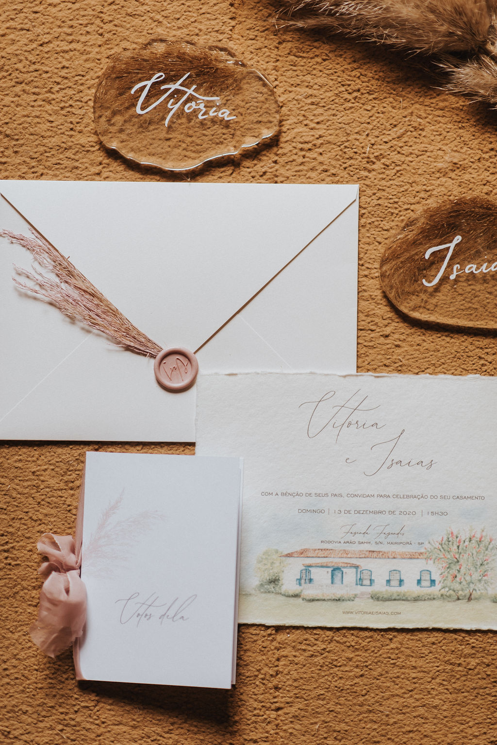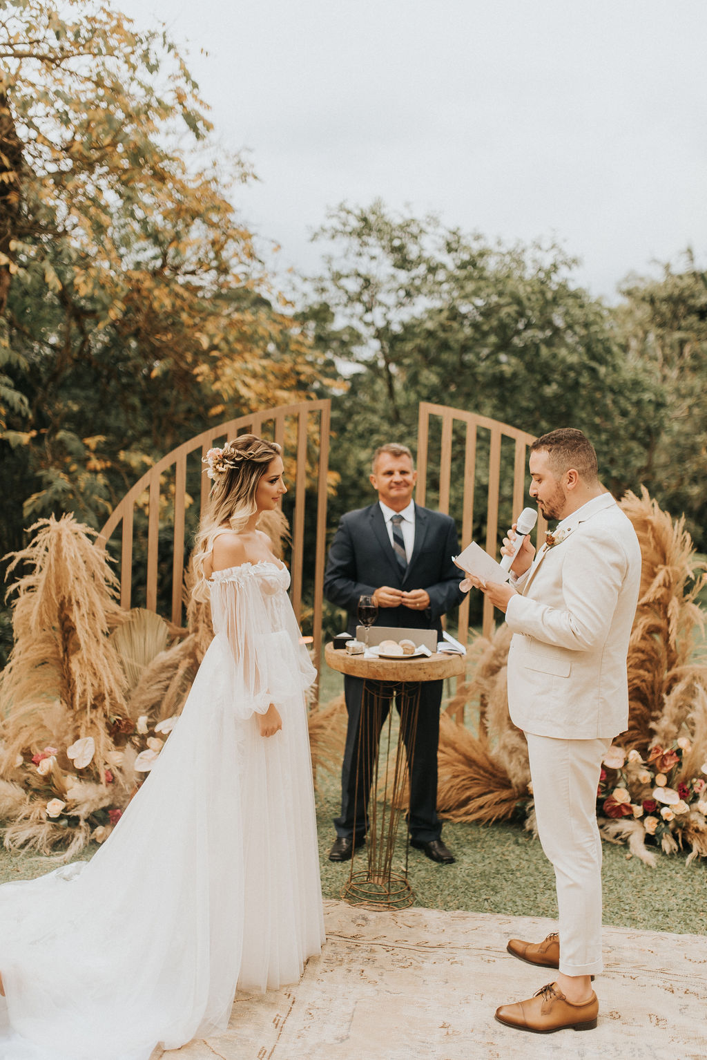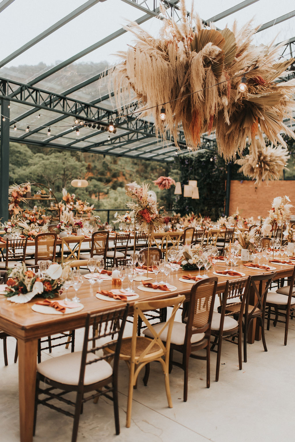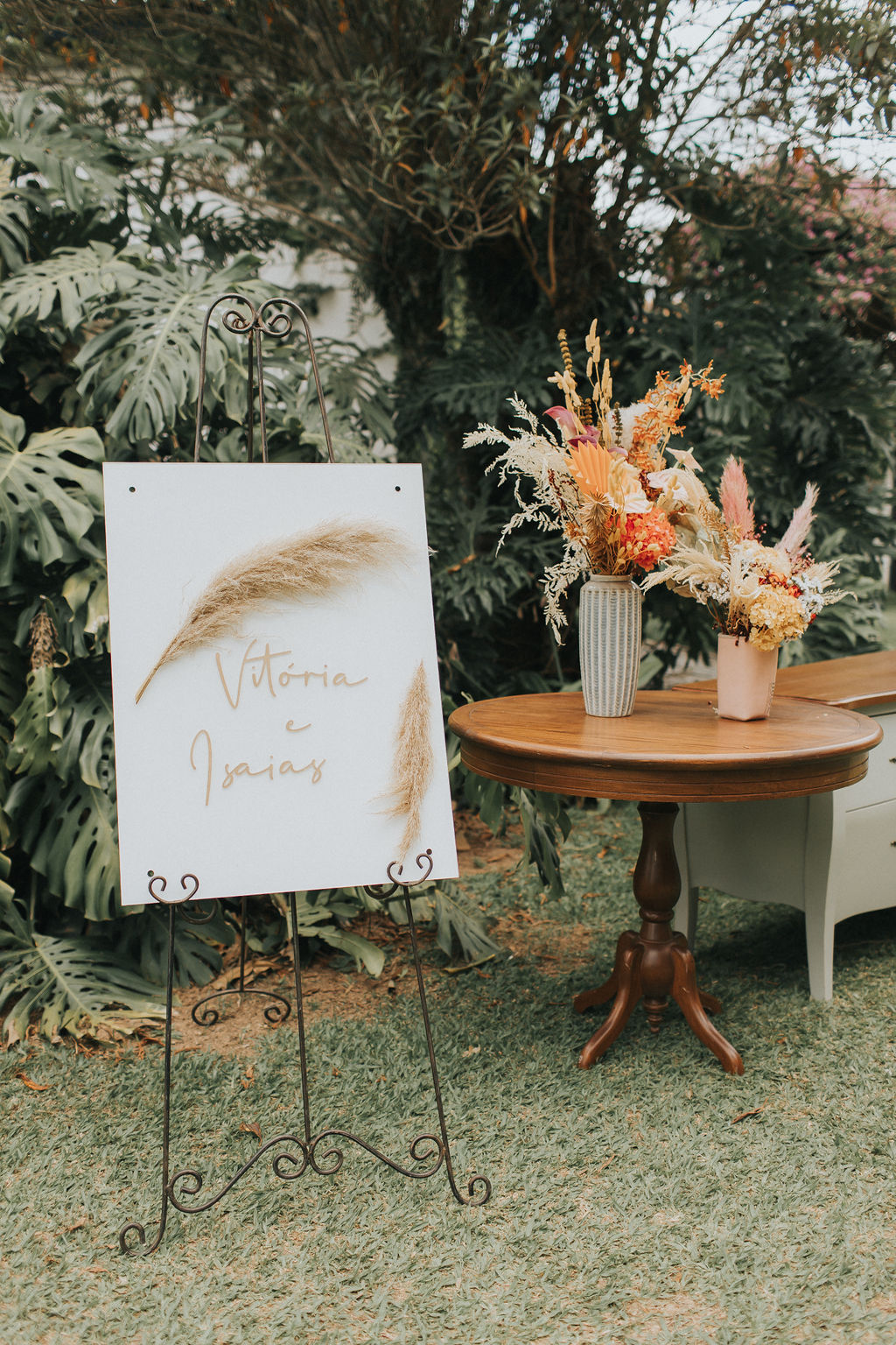 O casamento seguiu uma proposta de estilo boho chic com um toque de ousadia e originalidade! A Vitória e o Isaias queriam muito criar algo único e diferente. “Incluímos a geometria na decoração para trazer o toque original, presente na estrutura do altar, nas estruturas dos arranjos das mesas dos convidados, no painel instagramável, no menu, etc.” A paixão da Vitória era o capim dos pampas, por isso eles estavam desde a papelaria até todos os cantinhos da festa.