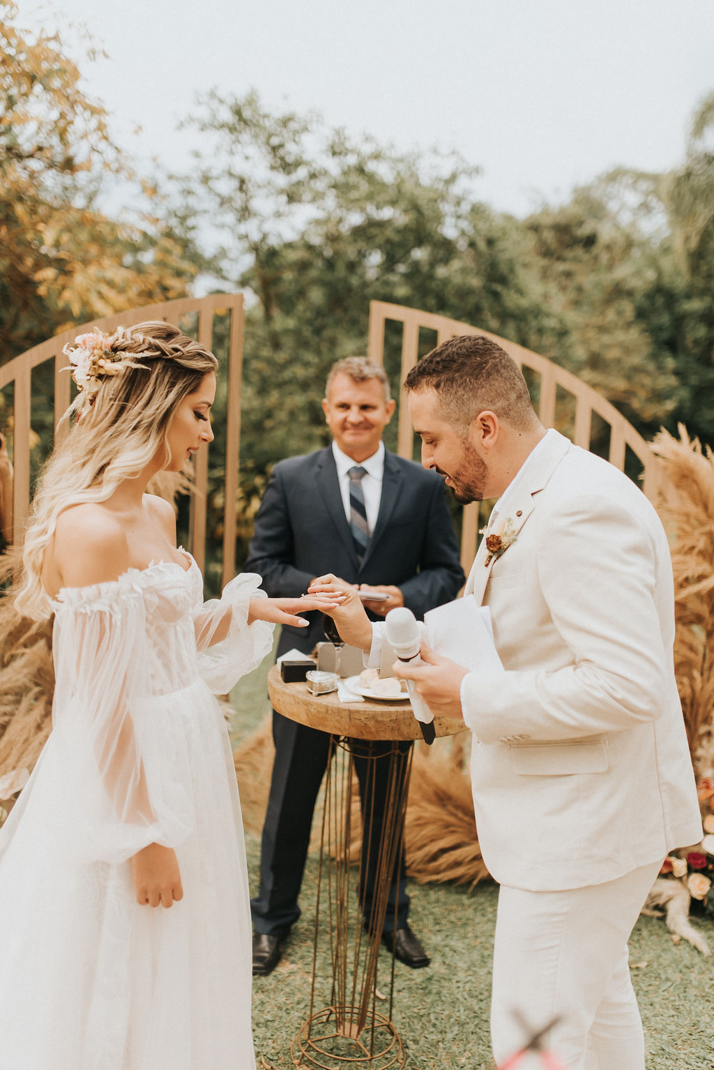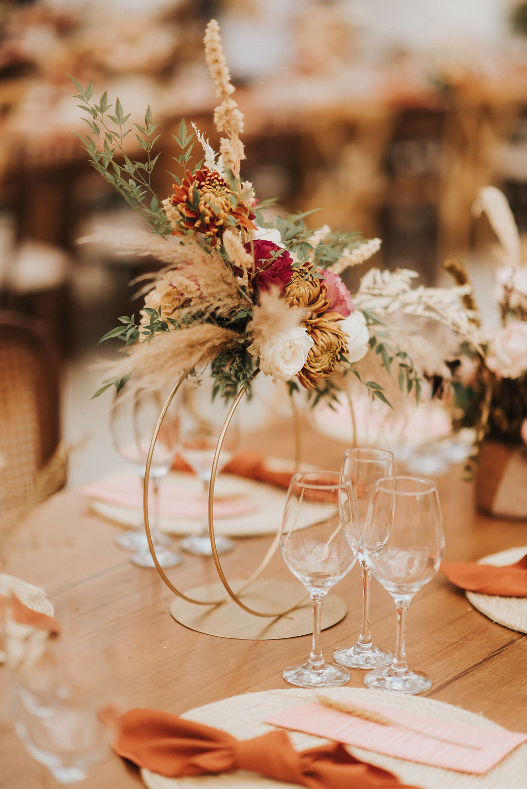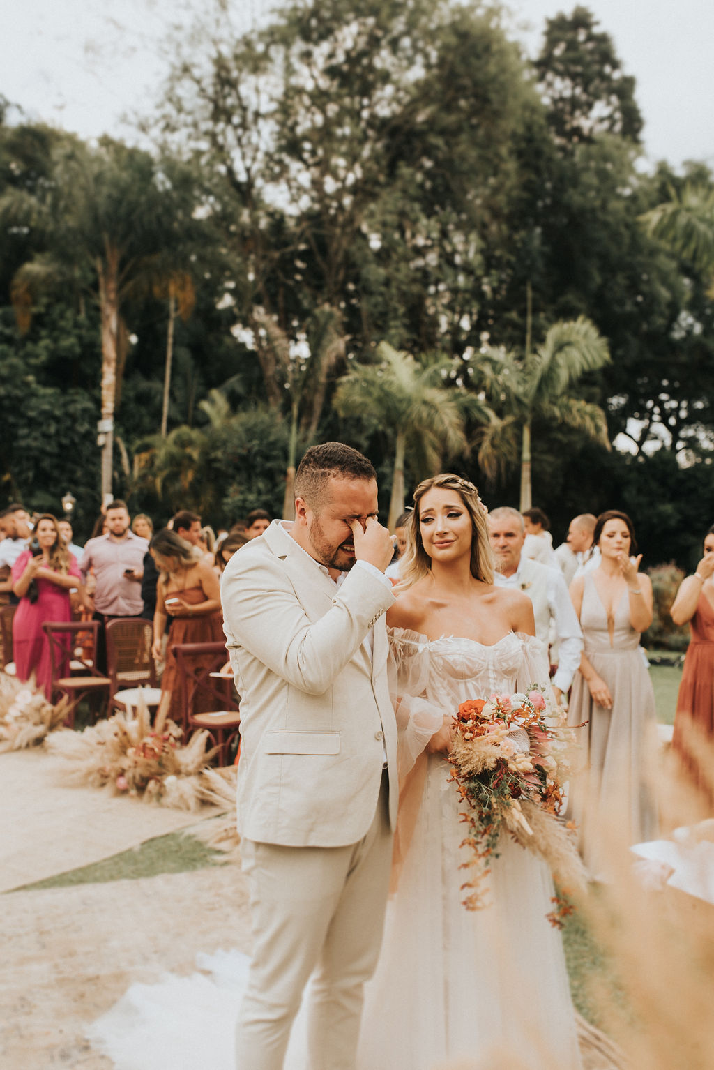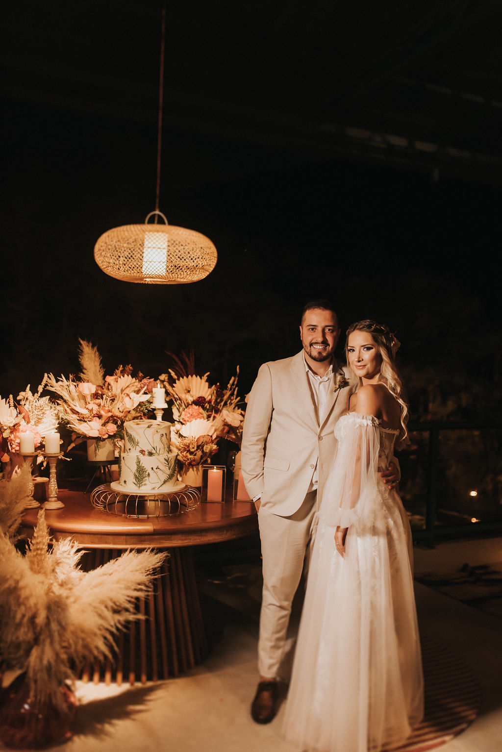 O casamento seguiu uma proposta de estilo boho chic com um toque de ousadia e originalidade! A Vitória e o Isaias queriam muito criar algo único e diferente. “Incluímos a geometria na decoração para trazer o toque original, presente na estrutura do altar, nas estruturas dos arranjos das mesas dos convidados, no painel instagramável, no menu, etc.” A paixão da Vitória era o capim dos pampas, por isso eles estavam desde a papelaria até todos os cantinhos da festa.