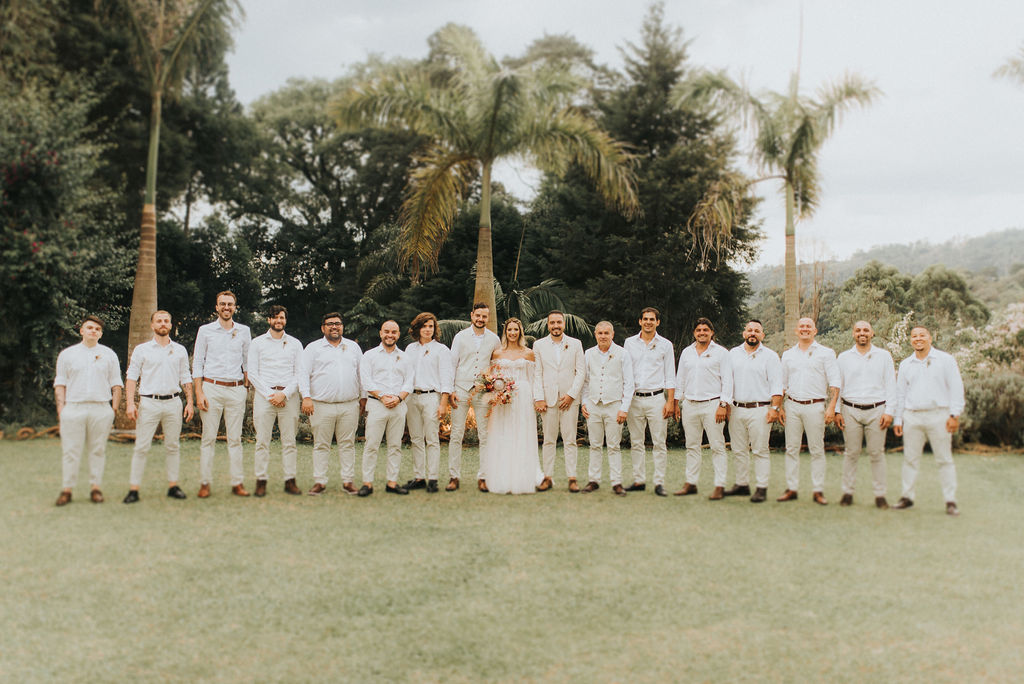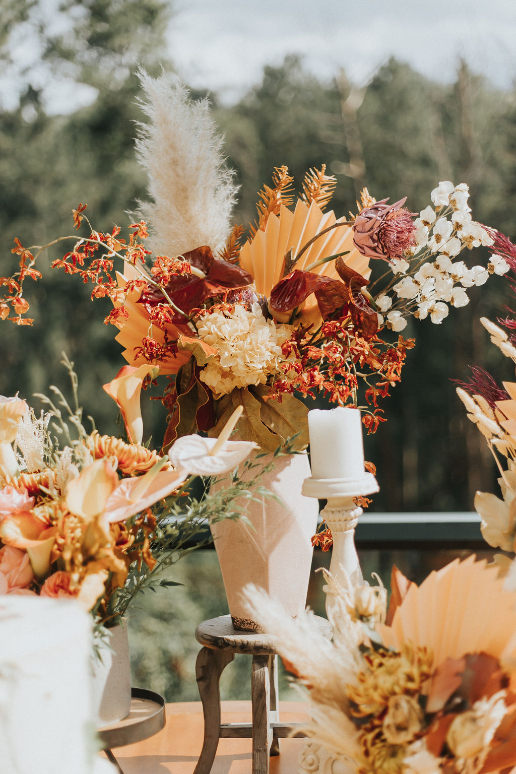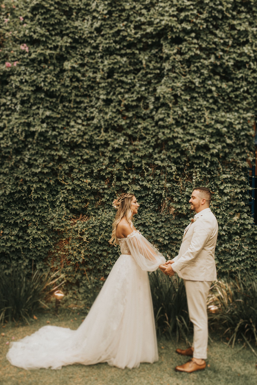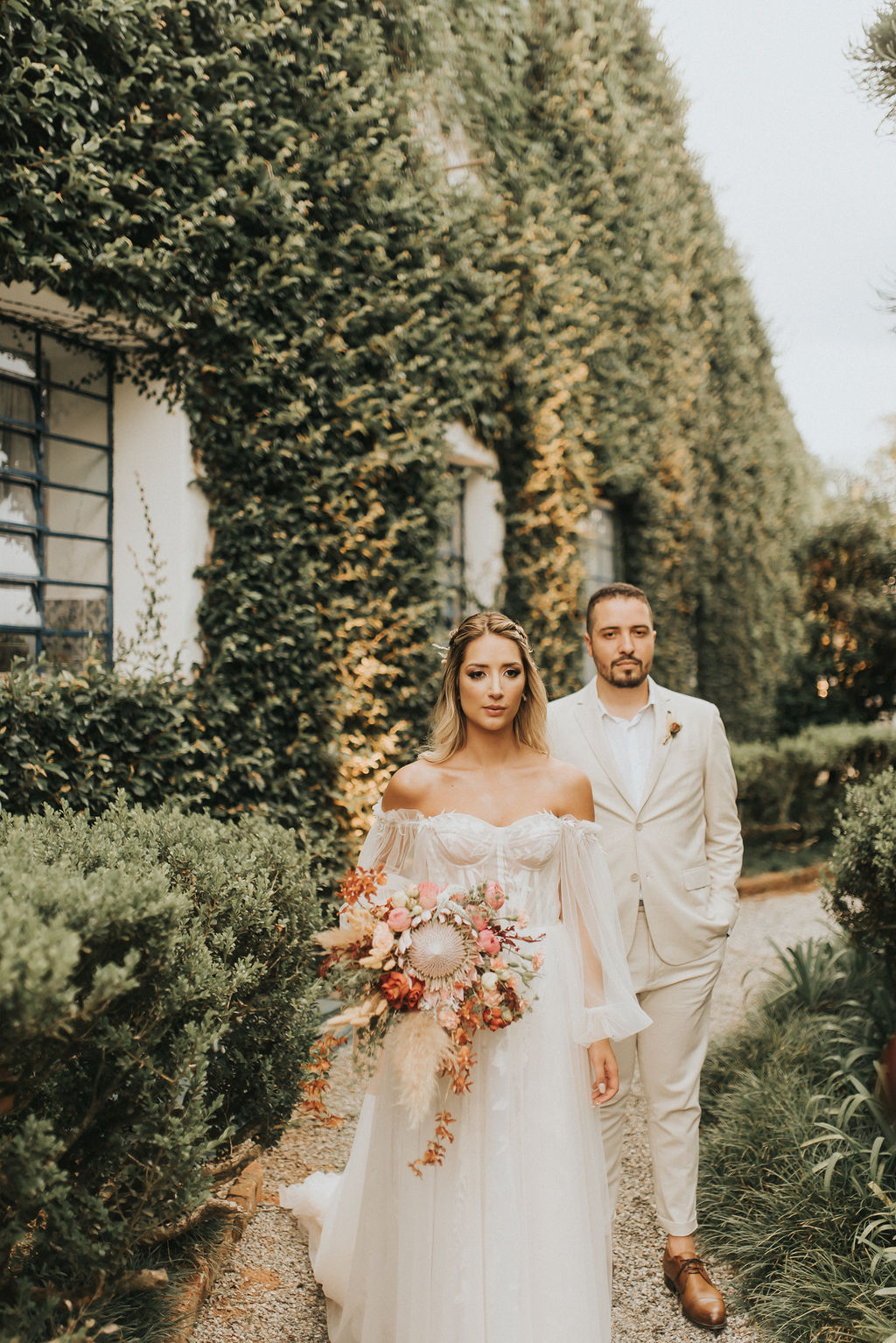 O casamento seguiu uma proposta de estilo boho chic com um toque de ousadia e originalidade! A Vitória e o Isaias queriam muito criar algo único e diferente. “Incluímos a geometria na decoração para trazer o toque original, presente na estrutura do altar, nas estruturas dos arranjos das mesas dos convidados, no painel instagramável, no menu, etc.” A paixão da Vitória era o capim dos pampas, por isso eles estavam desde a papelaria até todos os cantinhos da festa.
