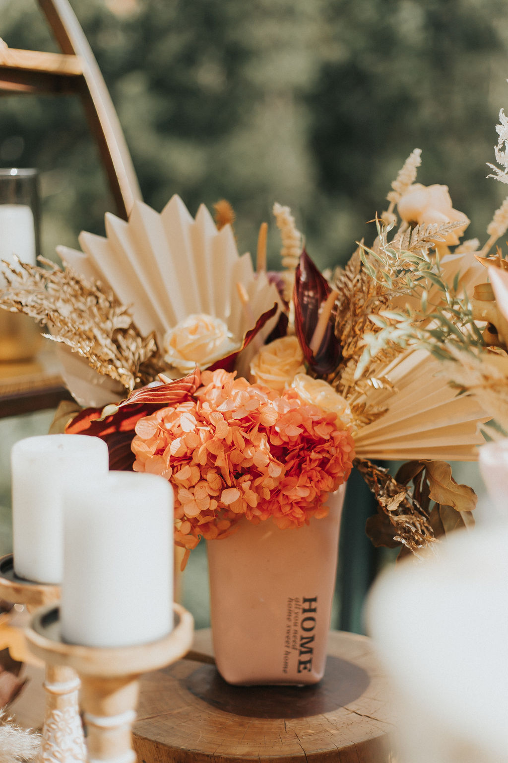 Do altar geométrico ao aconchego dos lounges e backdrop com letreiro de neon, os ambientes eram cheios de personalidade e com detalhes fofos que amamos! A decoração explorou não só o capim dos pampas, mas também as muitas folhagens secas e toques boho.