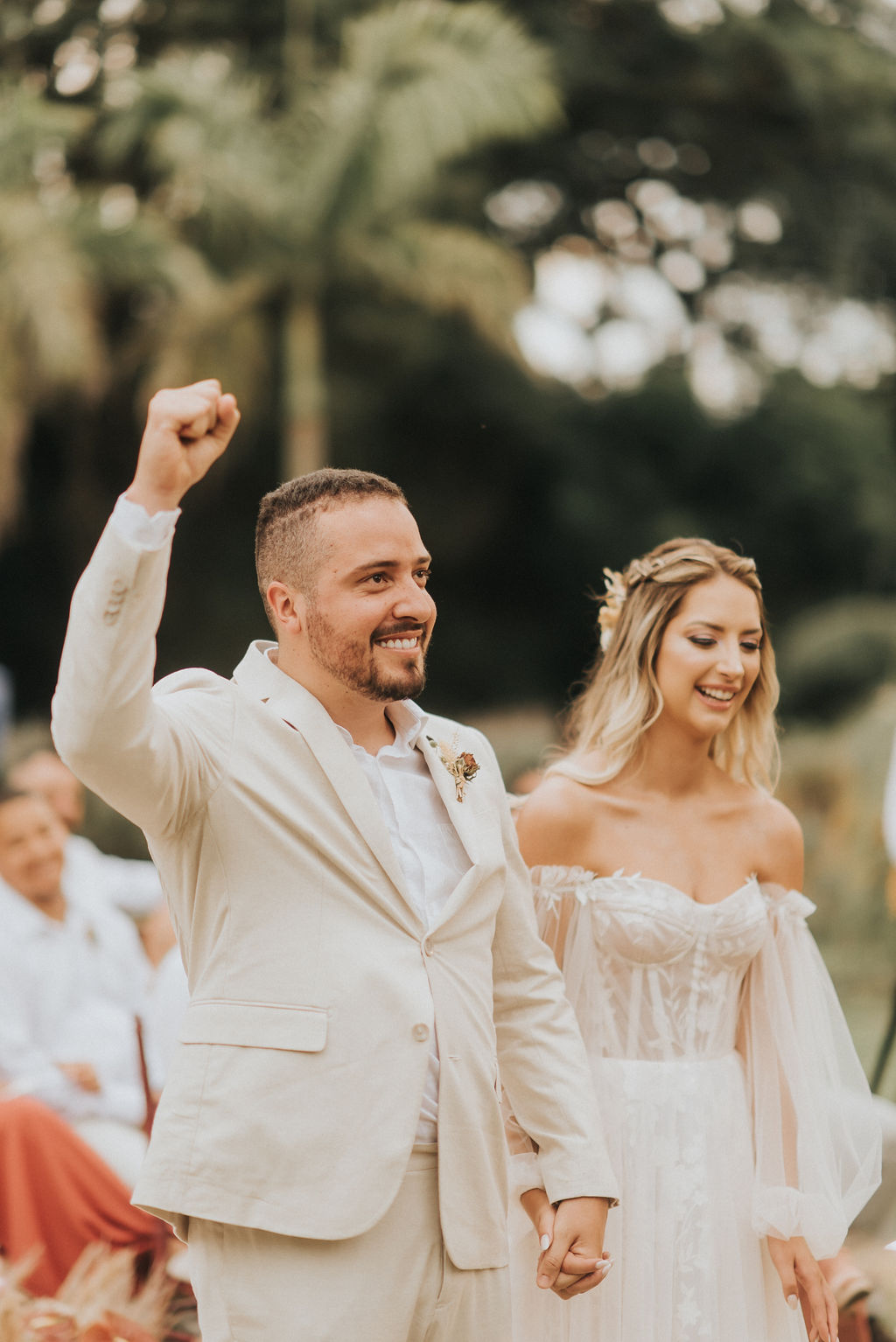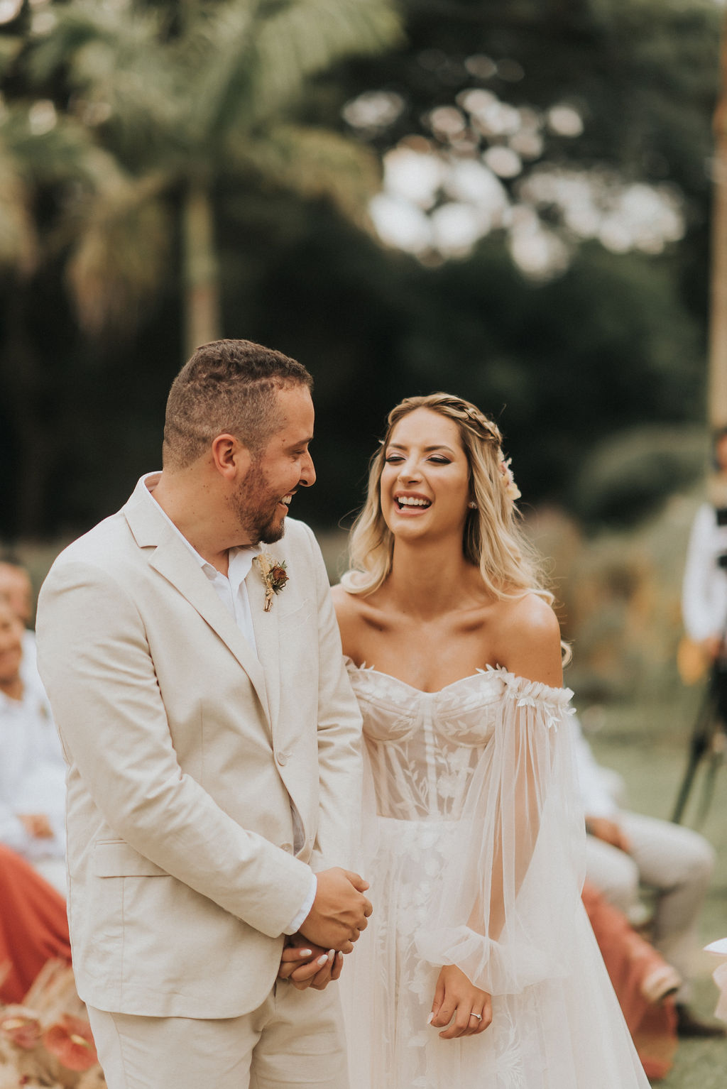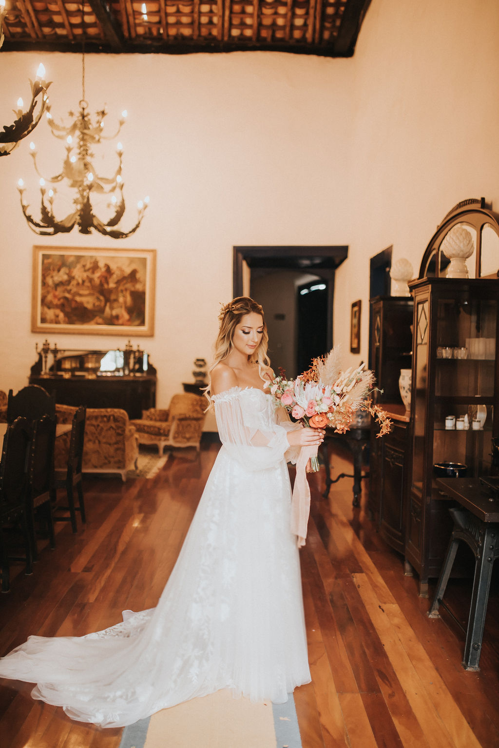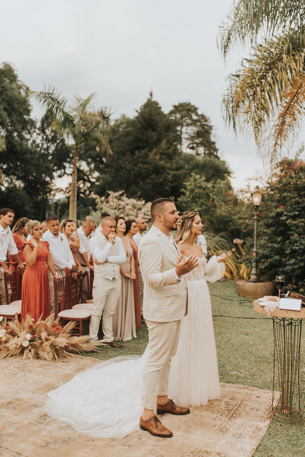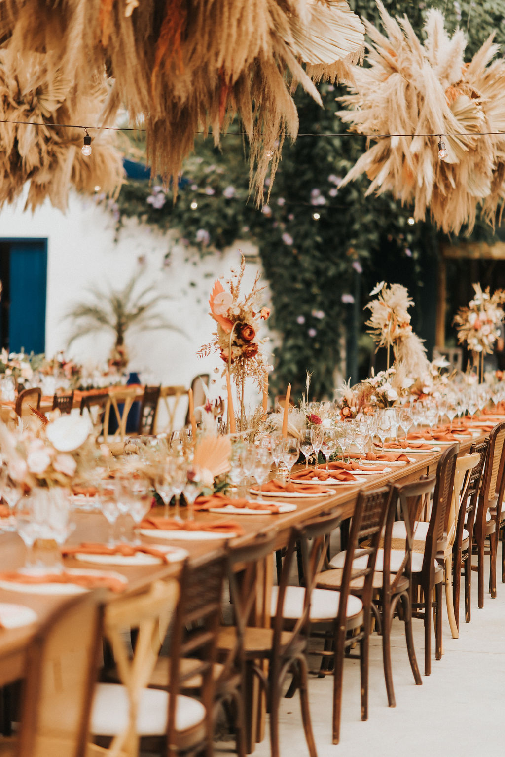 O casamento seguiu uma proposta de estilo boho chic com um toque de ousadia e originalidade! A Vitória e o Isaias queriam muito criar algo único e diferente. “Incluímos a geometria na decoração para trazer o toque original, presente na estrutura do altar, nas estruturas dos arranjos das mesas dos convidados, no painel instagramável, no menu, etc.” A paixão da Vitória era o capim dos pampas, por isso eles estavam desde a papelaria até todos os cantinhos da festa.
