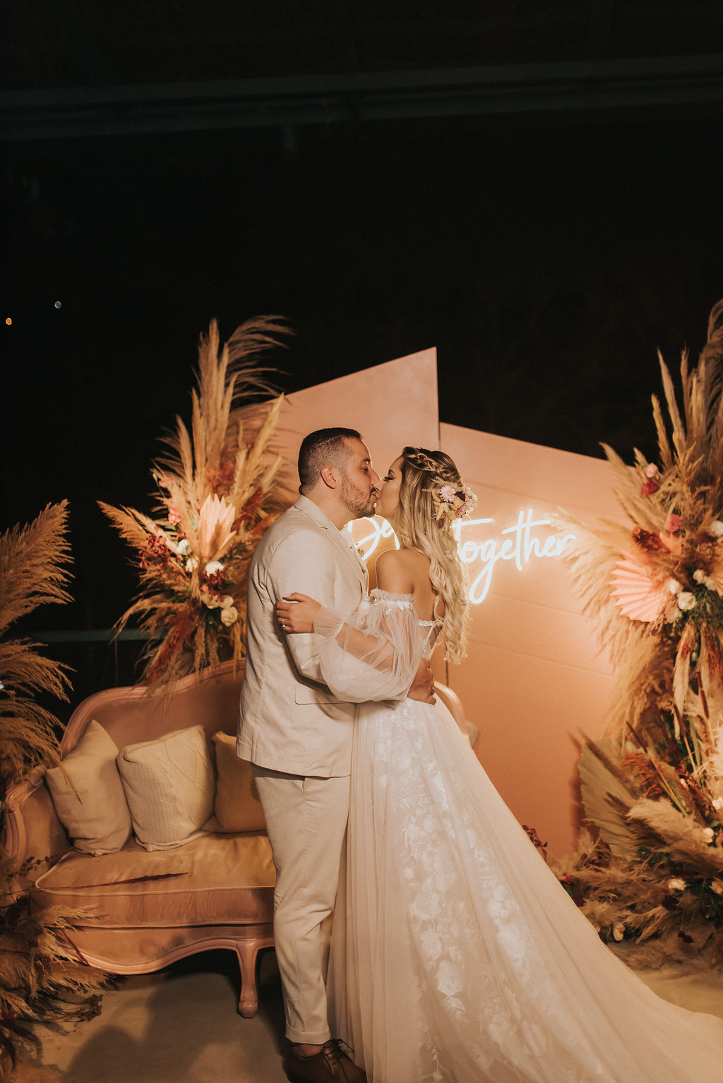 Do altar geométrico ao aconchego dos lounges e backdrop com letreiro de neon, os ambientes eram cheios de personalidade e com detalhes fofos que amamos! A decoração explorou não só o capim dos pampas, mas também as muitas folhagens secas e toques boho.