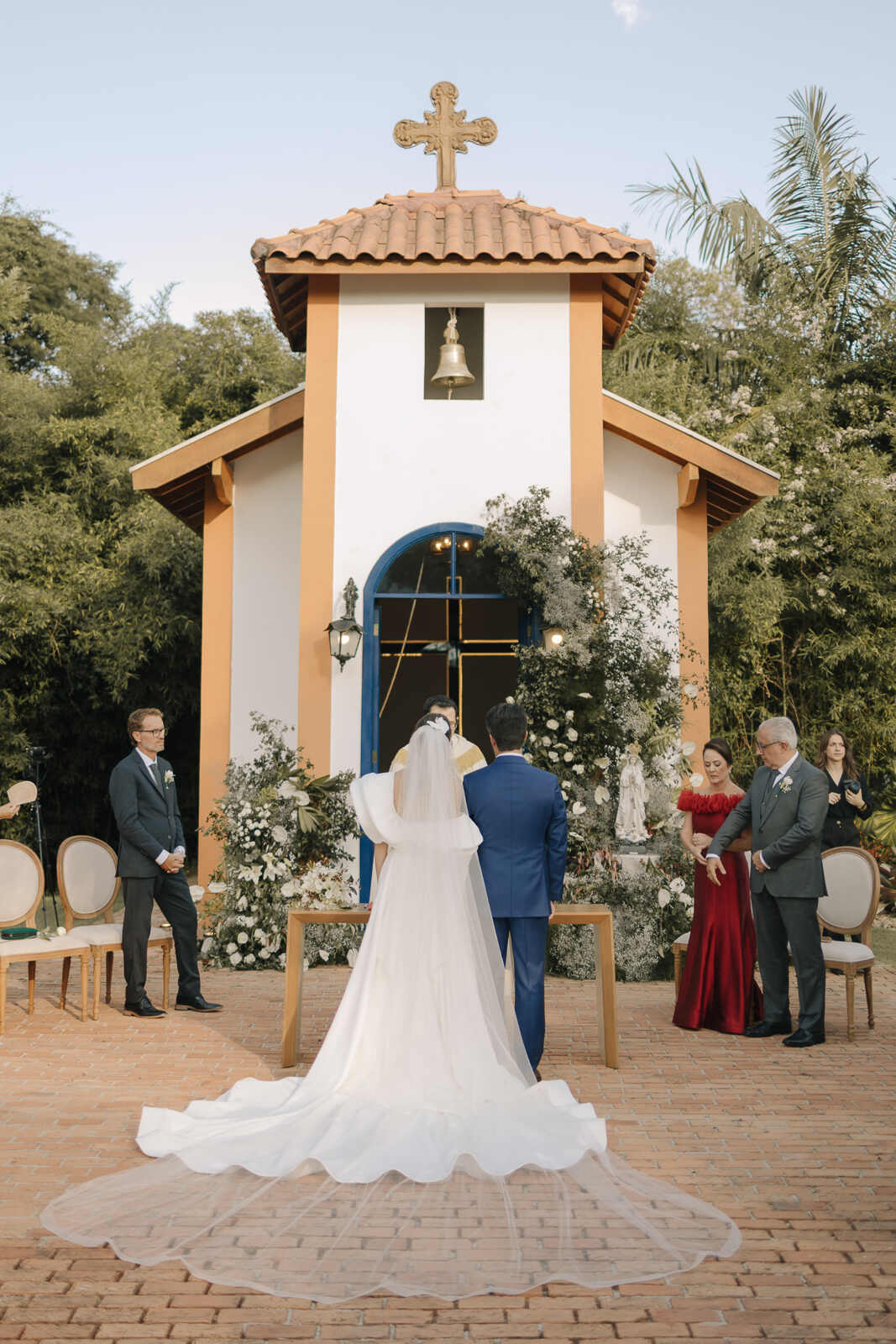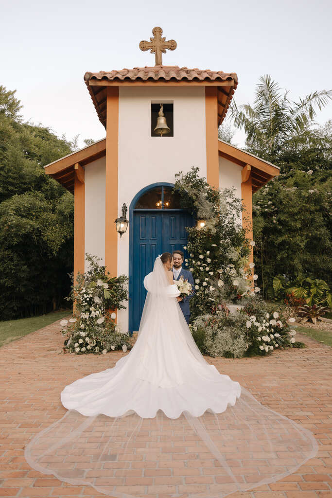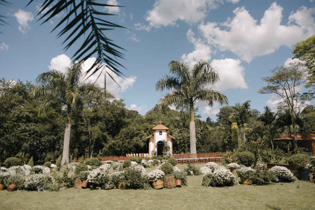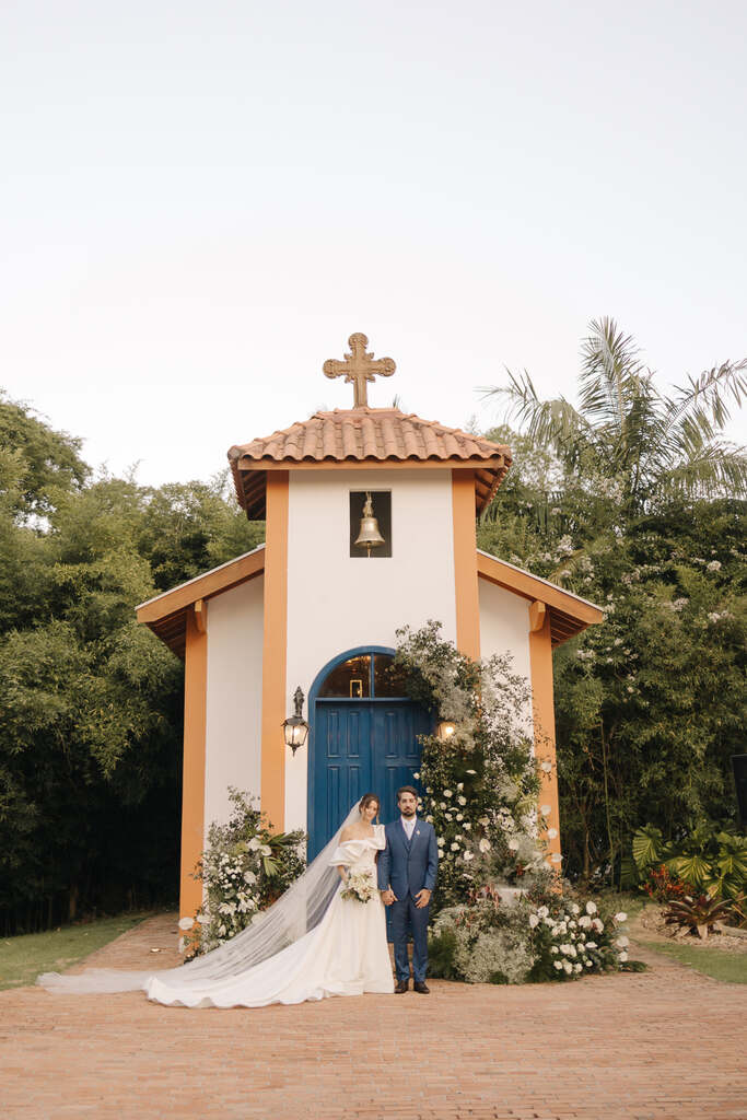 Ana Laura e Victor decidiram que o seu grande dia aconteceria no jardim em frente a uma capela.