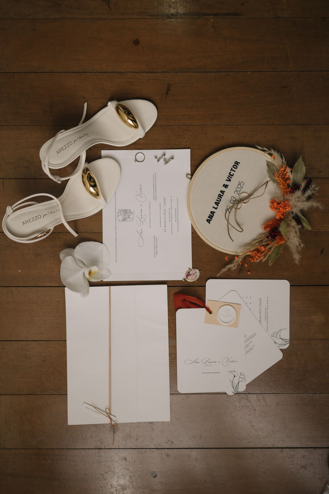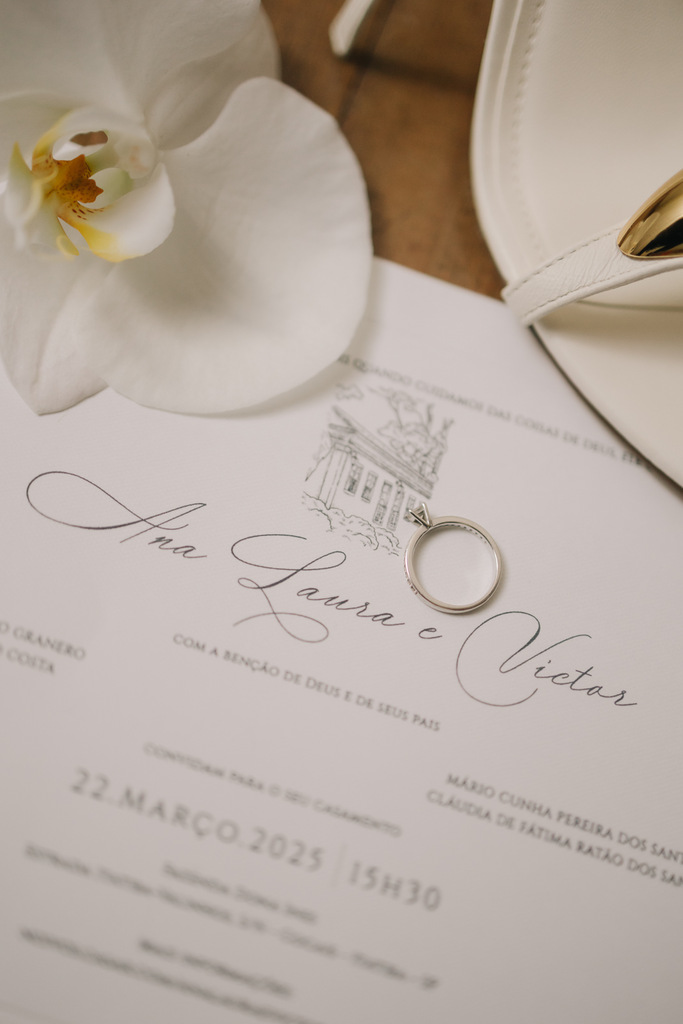 Sendo assim, o casal optou por um convite minimalista, já que a festa foi decorada em duas partes: a colorida e a verde e branca.