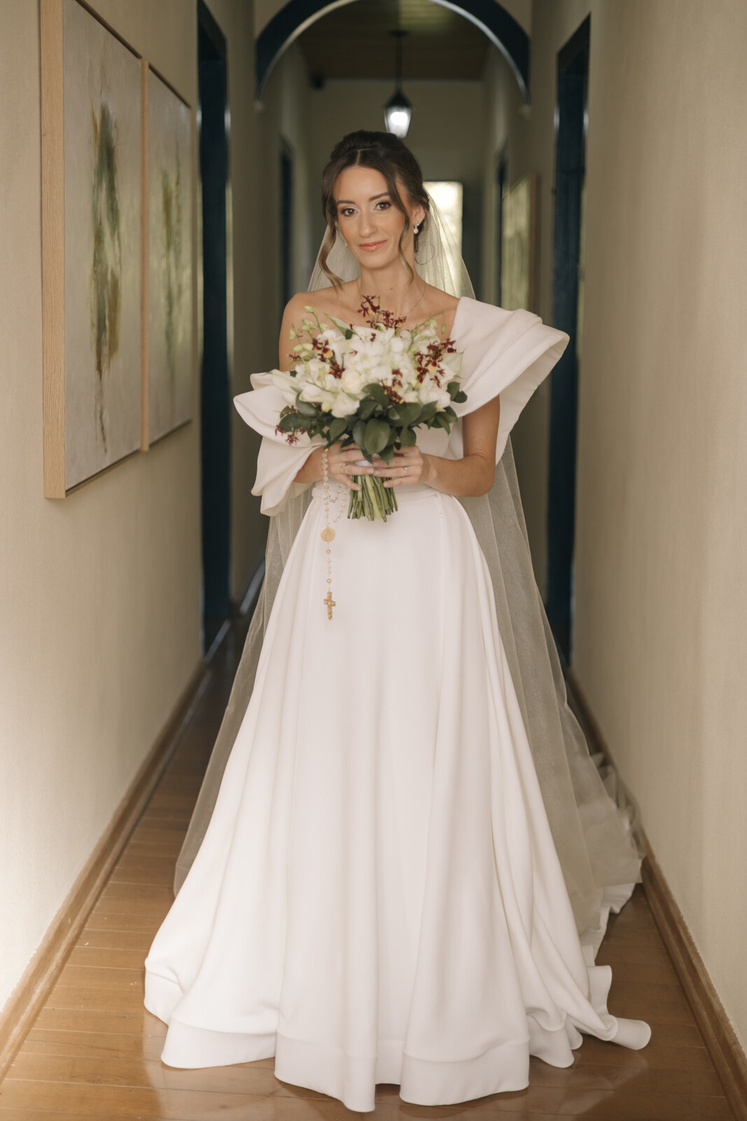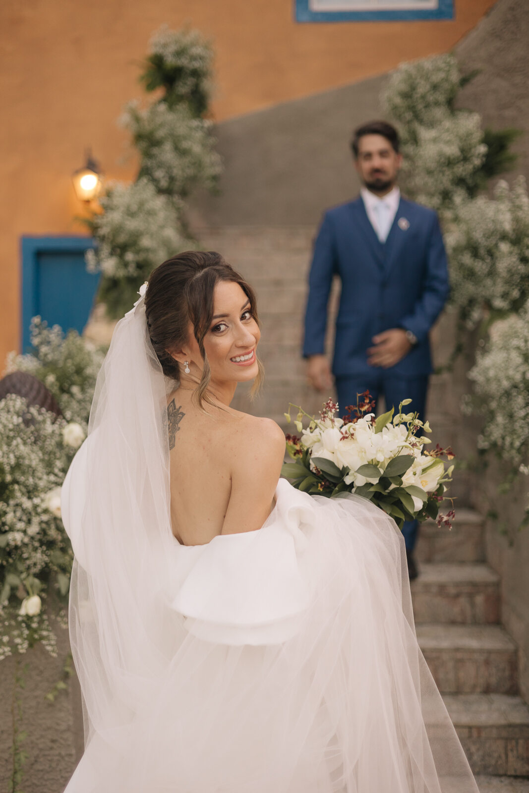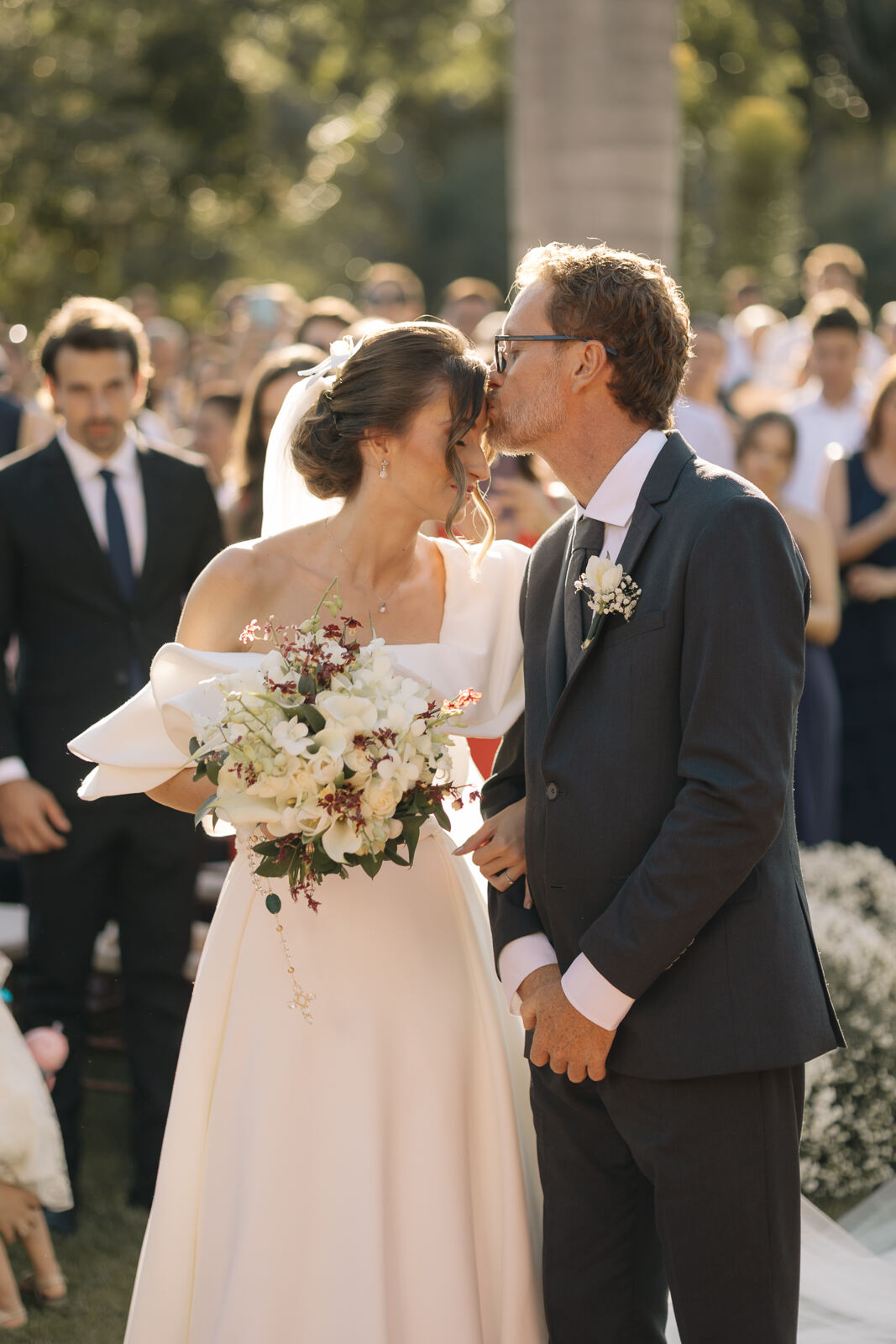 O noivo seguiu o visual mais clássico com um traje de três peças. Enquanto a noiva preferiu um vestido minimalista, mas cheio de personalidade.