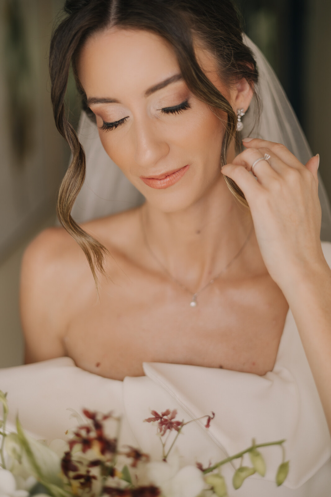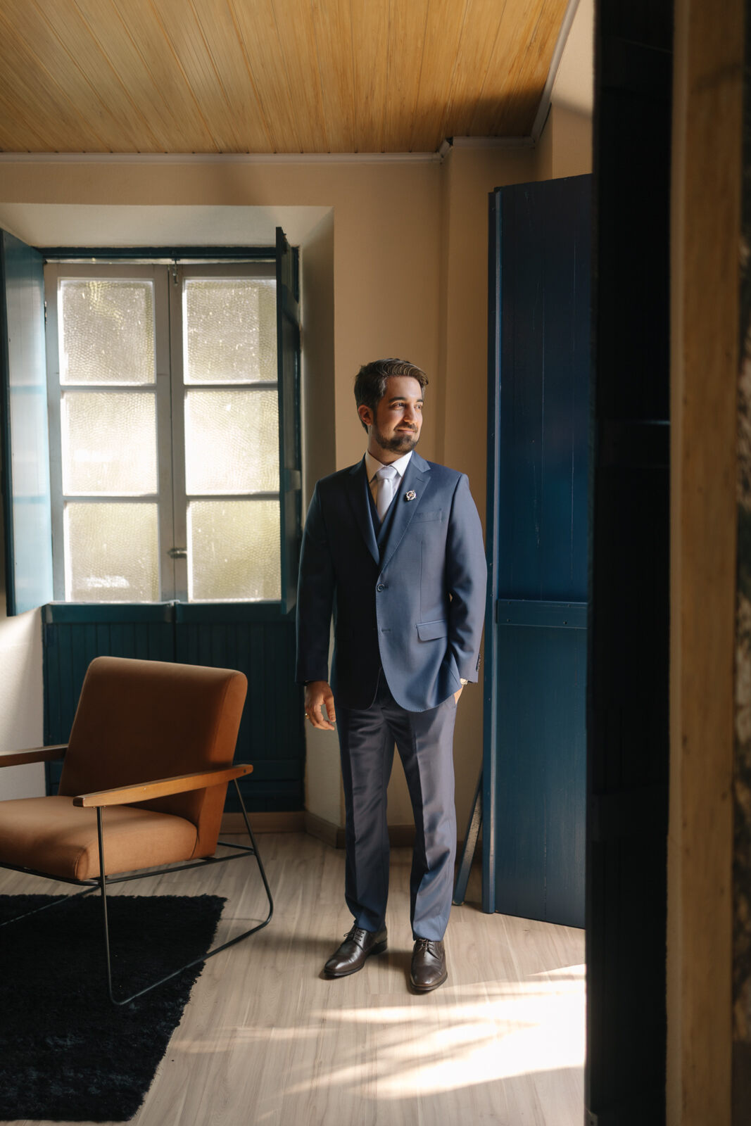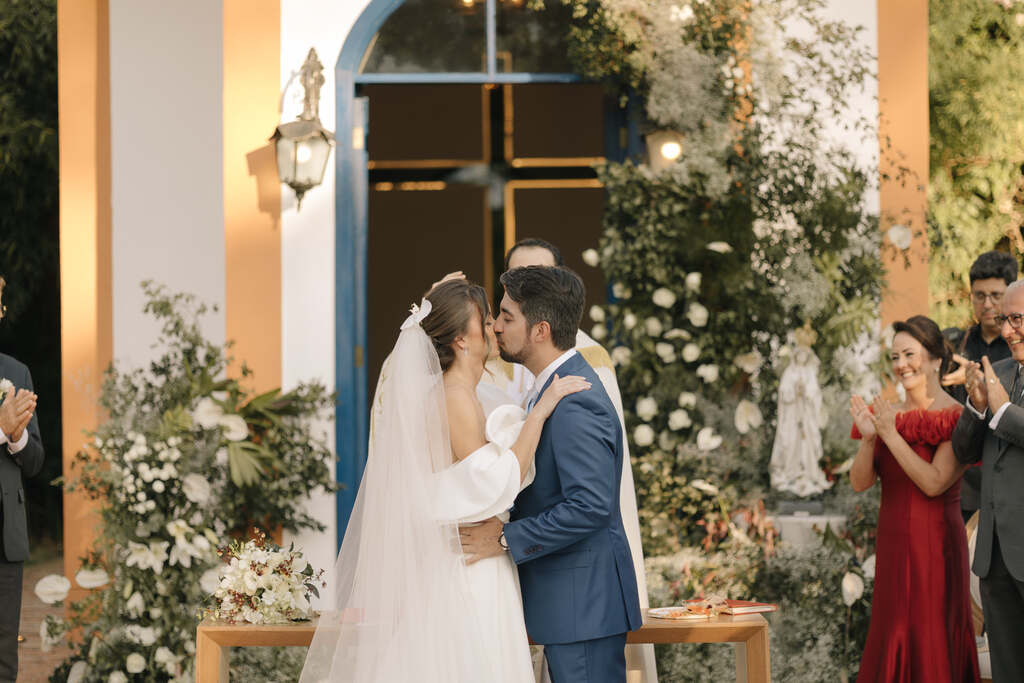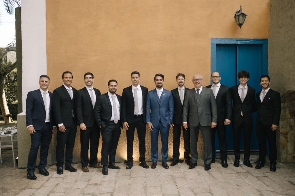 O noivo seguiu o visual mais clássico com um traje de três peças. Enquanto a noiva preferiu um vestido minimalista, mas cheio de personalidade.