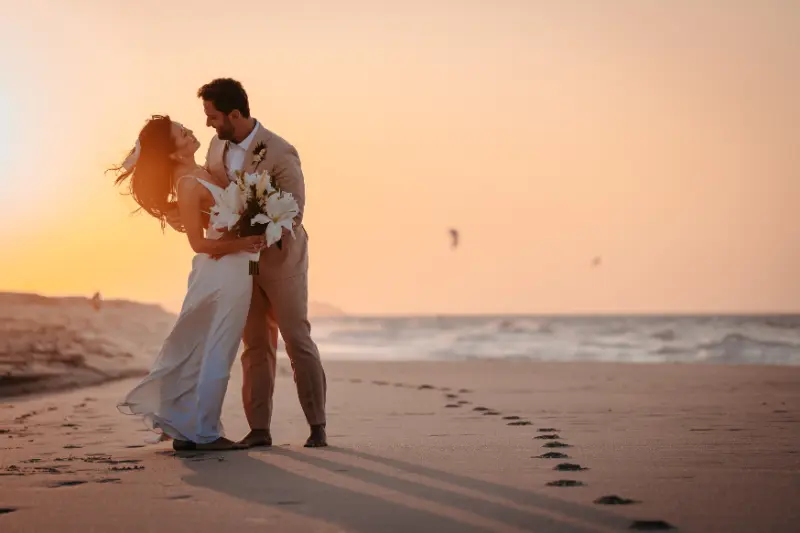 noivos se abraçando na praia