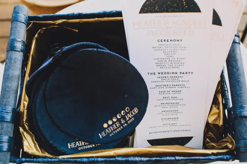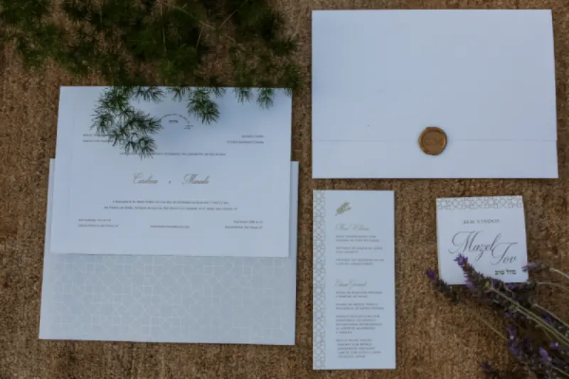 Geralmente o convite de casamento judaico é mais tradicional tanto na papelaria, quanto no texto. Há casais que optam por inserir a Estrela de David. As cores do convite de casamento são as da paleta do evento.