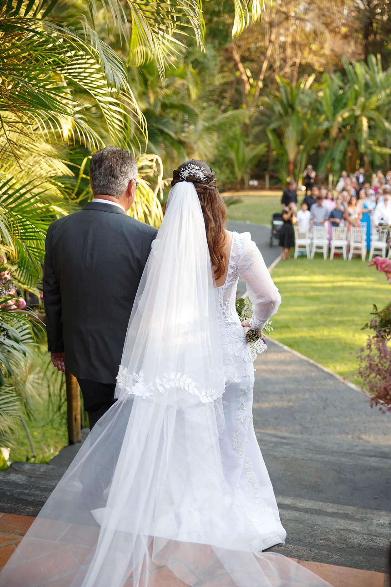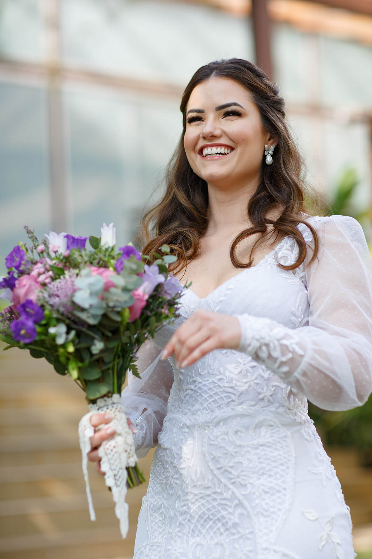 Enquanto o véu na sua versão mais longa (chamado de catedral) compõe um visual mais tradicional, as transparências do vestido contrastam com um ar de leveza e modernidade.