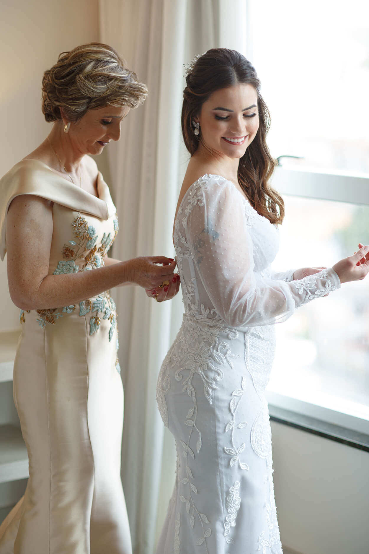Olha esse vestido! Fica até difícil decidir o que elogiar primeiro! Vamos por partes. O bordado conferiu essa sensação de volume, ao mesmo tempo que esculpiu a silhueta da noiva.