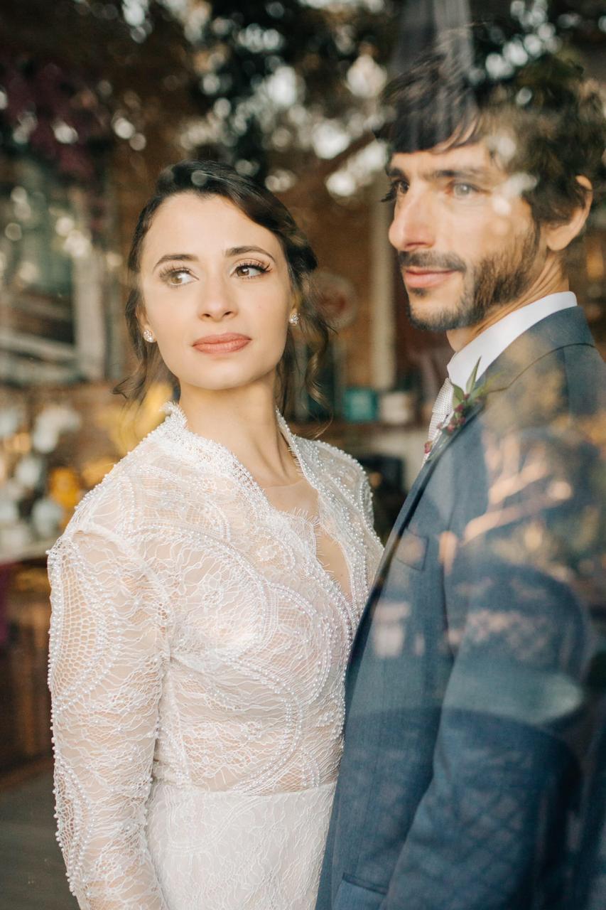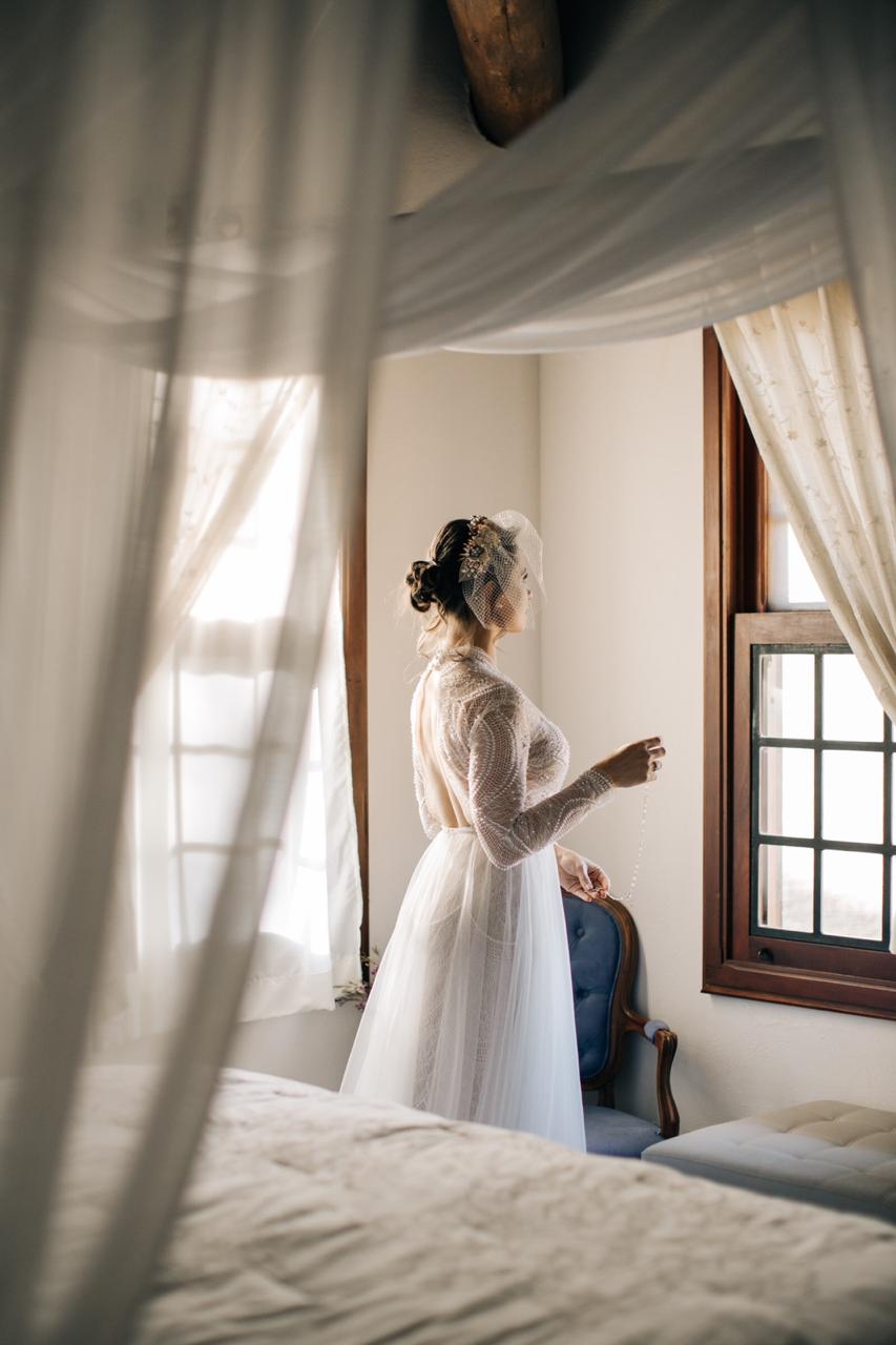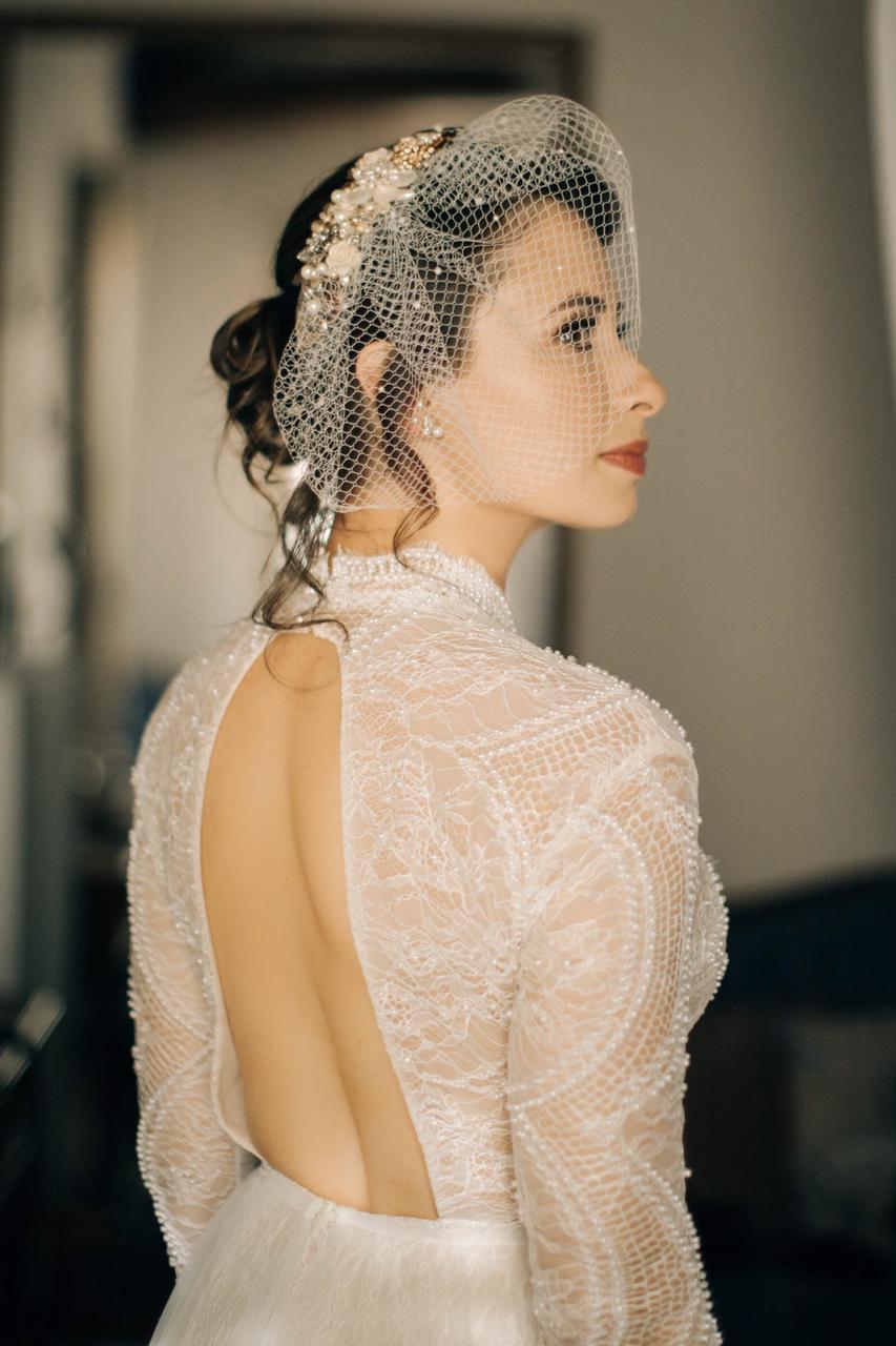 Vamos ter que dar uma paradinha agora porque estamos babando com a escolha da Karina para seu look: um vestido fluido, todo bordado e com as costas abertas e um voillete para complementar seu penteado. Uau!