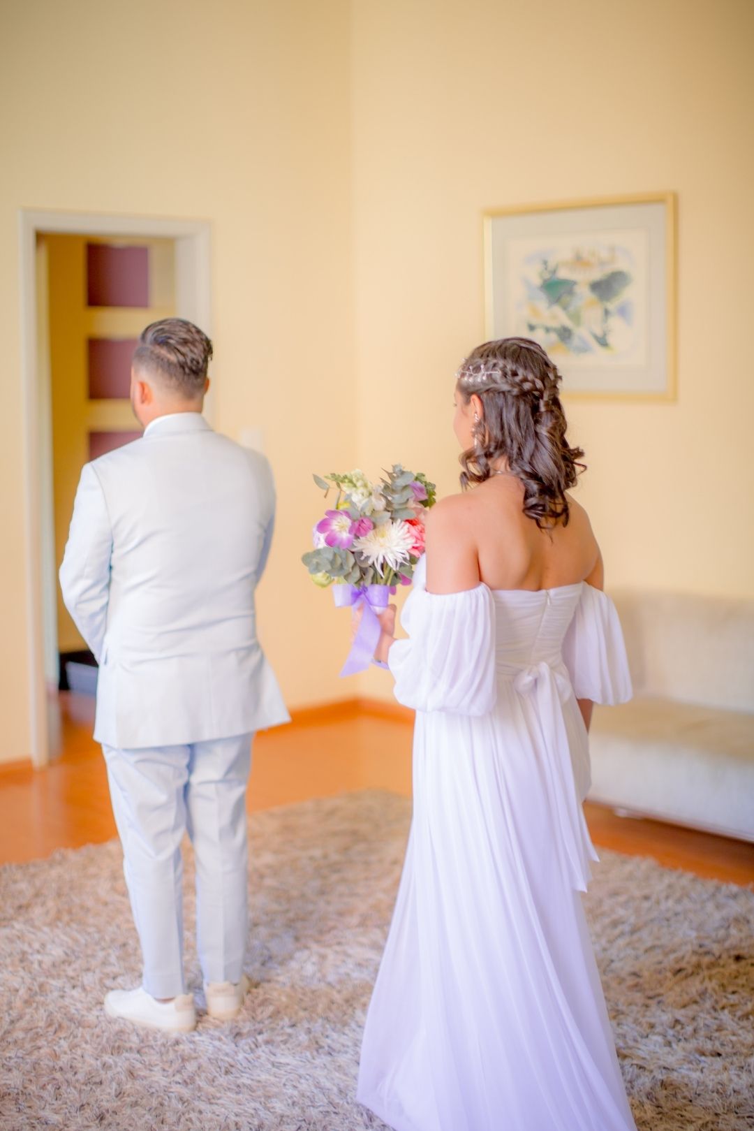 A Rafa e o Bruno escolheram fazer um First Look, que foi ótimo para curtir um momento, e a beleza um do outro, em particular e ainda ajudou o noivo a perder o nervosismo.