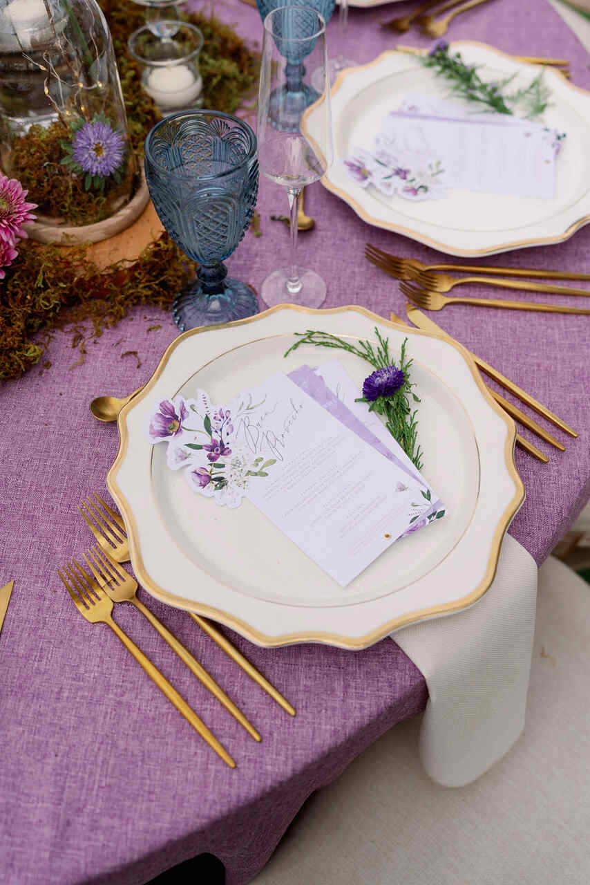 Além do convite, a papelaria do casamento pode seguir essa mesma linha de harmonia com a cor lilás. Os menus, plaquinhas, tags das lembrancinhas, cartões de agradecimento, enfim, esses pequenos detalhes têm o poder de transformar a atmosfera do evento.
