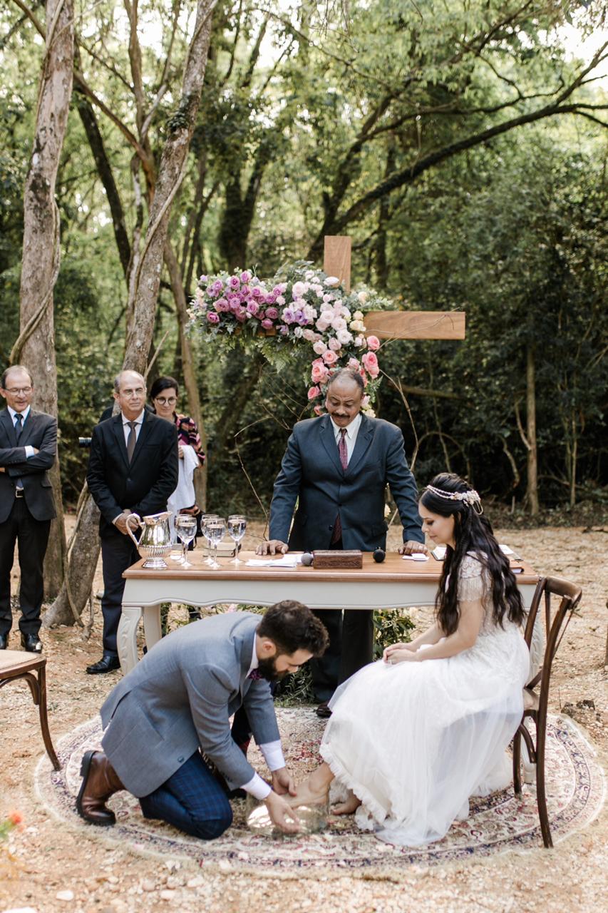 O lava-pés foi um desejo muito forte do Samuel, pois ele queria o pai dele junto nessa hora para homenageá-lo, e assim foi. Foi um momento muito familiar e com muito significado. A troca das alianças de noivado, que eram da Reitman, pelas alianças de casamento, de autoria do Brazil & Murgel, foi um momento leve e delicado, cercado de muito amor e sorrisos largos dos convidados.  A cerimônia acabou de forma muito alegre, com muita música e felicidade no ar. Do jeitinho que a noiva gosta!