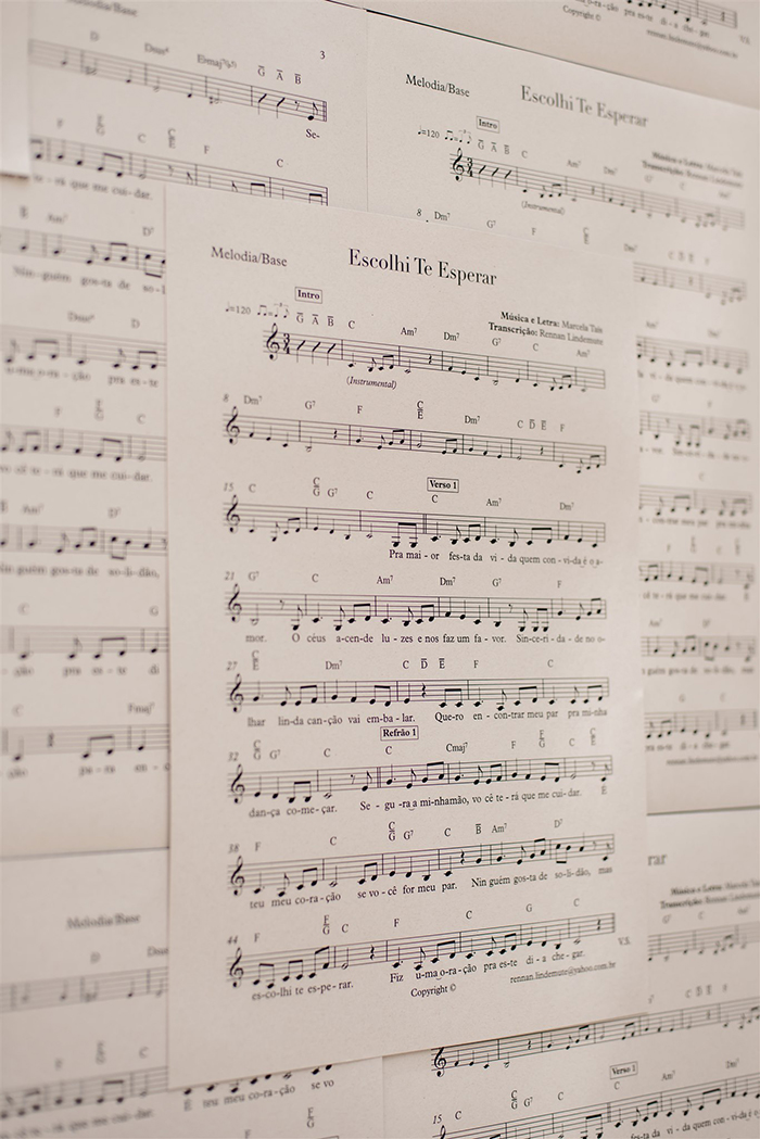 É quando os convidados recebem o convite de casamento que eles entendem qual vai ser a vibe do dia. Nem precisamos dizer que a papelaria e identidade visual estão de chorar de lindos! O convite, menu e poemas que foram colocados no espaço para complementar a decoração foram todos impressos em papel rústico. O caderno de votos era em camurça e o Estúdio Pinus usou a história que a Marcela e o Samuel tem com a música para fazer, com a partitura de uma das músicas da Marcela “Escolhi te esperar”, os cones para que os convidados jogassem pétalas e folhinhas secas perfumadas na saída dos noivos. Para terminar, o Estúdio Pinus ainda ficou encarregado dos cactos que eram lembrancinhas. Complementando a historia dos noivos, e para informar e registrar todos os detalhes até a chegada do grande dia, os dois fizeram um site no iCasei.