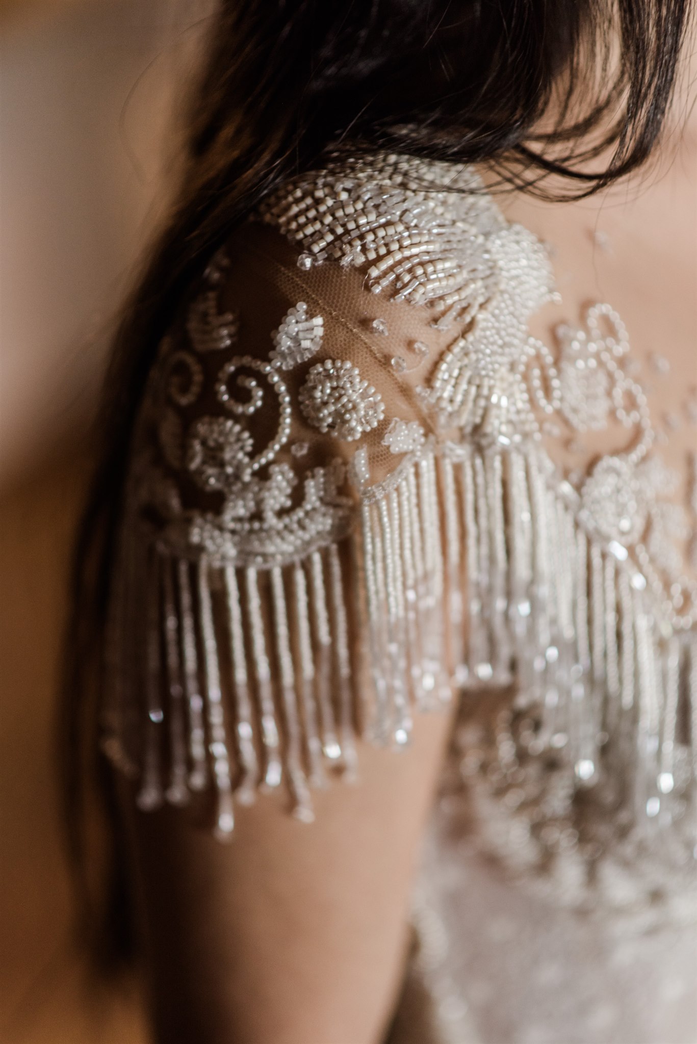 Além do vestido  criado pela NatKat Bridal ser lindo, com franjas que a gente ama e camadas de tule na saia com poás e babados, ele foi bordado com um motivo cheio de significado para a Marcela: dois passarinhos. Um detalhe: o vestido levou vinte dias para ser bordado!