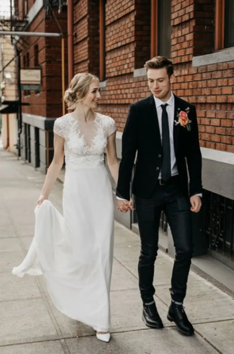 Na hora de escolher o vestido de noiva ou o terno do noivo, você pode optar por estilos com linhas clean, sem muito brilho, adereços e uma silhueta mais estruturada.