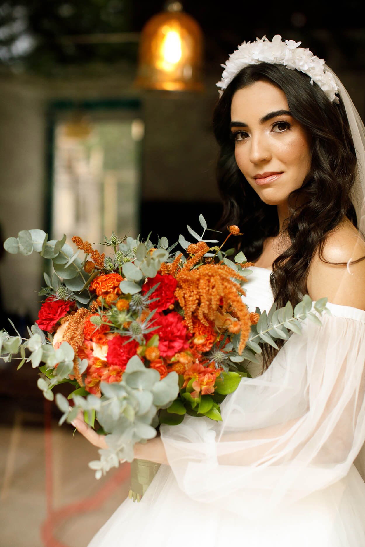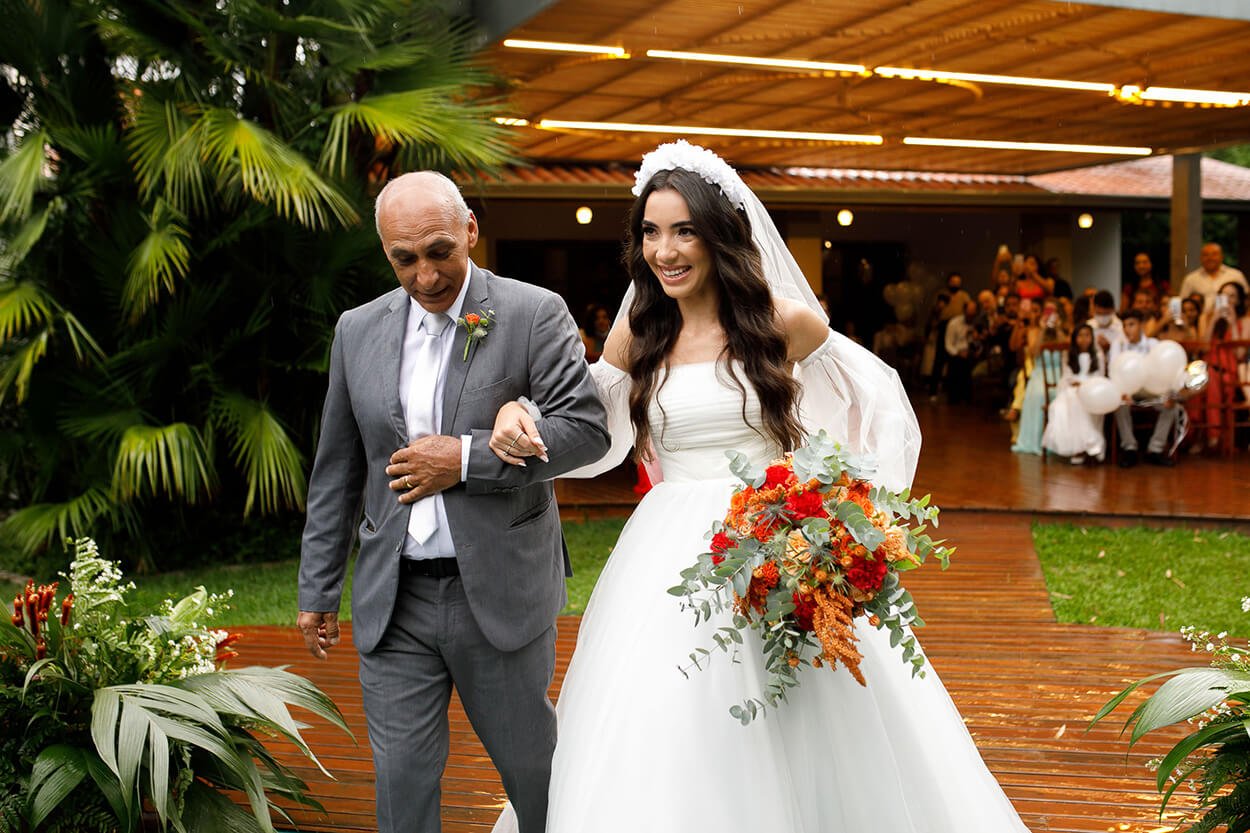 Somos suspeitas para falar, mas adoramos uma noiva cheia de personalidade! O buquê assimétrico é o primeiro elemento a chamar nossa atenção. Além disso, Mare investiu em um vestido de noiva com corte evasê sem medo de ser feliz. As mangas bufantes removíveis, a tiara volumosa e o véu arremataram o visual maxi.