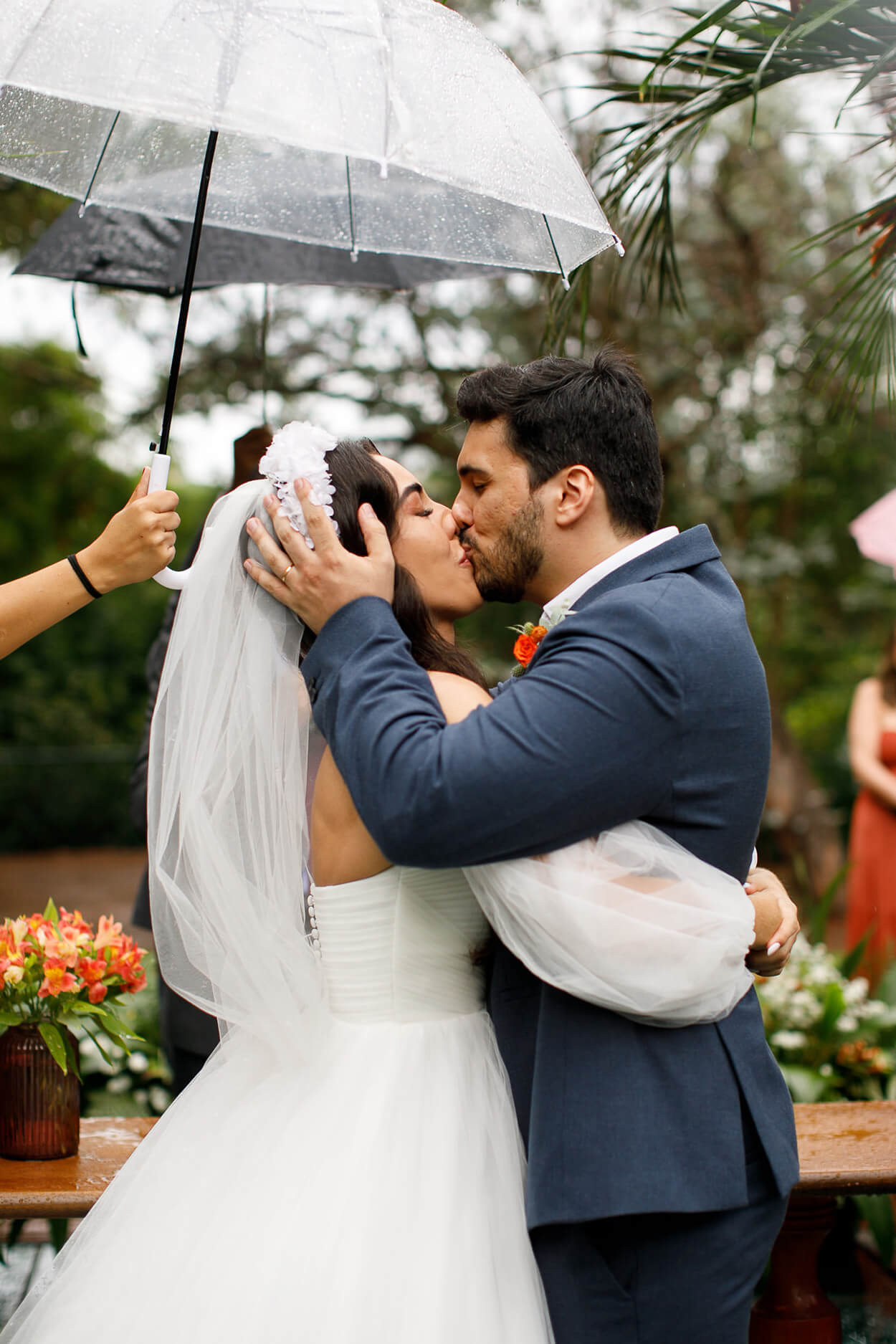 É lógico que o altar também quebraria expectativas. A disposição das cadeiras em círculo em volta do altar trazem aquela sensação intimista, sabe? Sempre recomendamos um plano b, principalmente uma tenda para os casamentos que acontecerão nas épocas mais chuvosas. Mas adoramos ver os guarda-chuvas em cena!