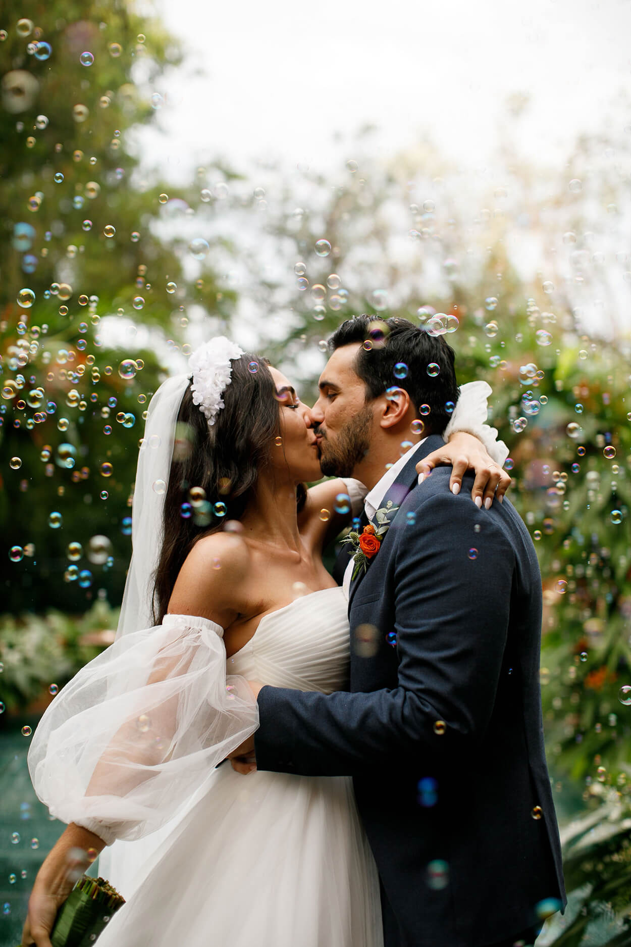 Apostamos que até os convidados ficaram surpresos com essa saída dos noivos! E não é para menos, bem em um dia nublado, as bolhas de sabão deram um toque leve e mágico àquele momento. Sem contar que rendeu fotos encantadoras.