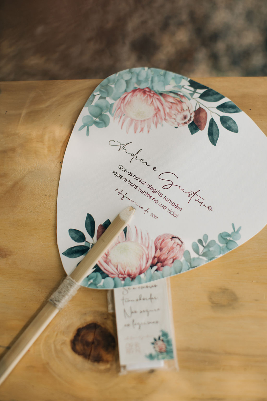 A papelaria também foi por conta da Dea: ela Ilustrou a fazenda e as flores do convite (proteas e eucaliptos) que também seriam as flores do seu buquê. Fez um buquê de teste também para ver se iria dar certo. Fez os leques e seu pai colocou os cabos de bamboo. Comprou inclusive as forminhas do doces que vão na mesa e os acessórios da pista de dança.