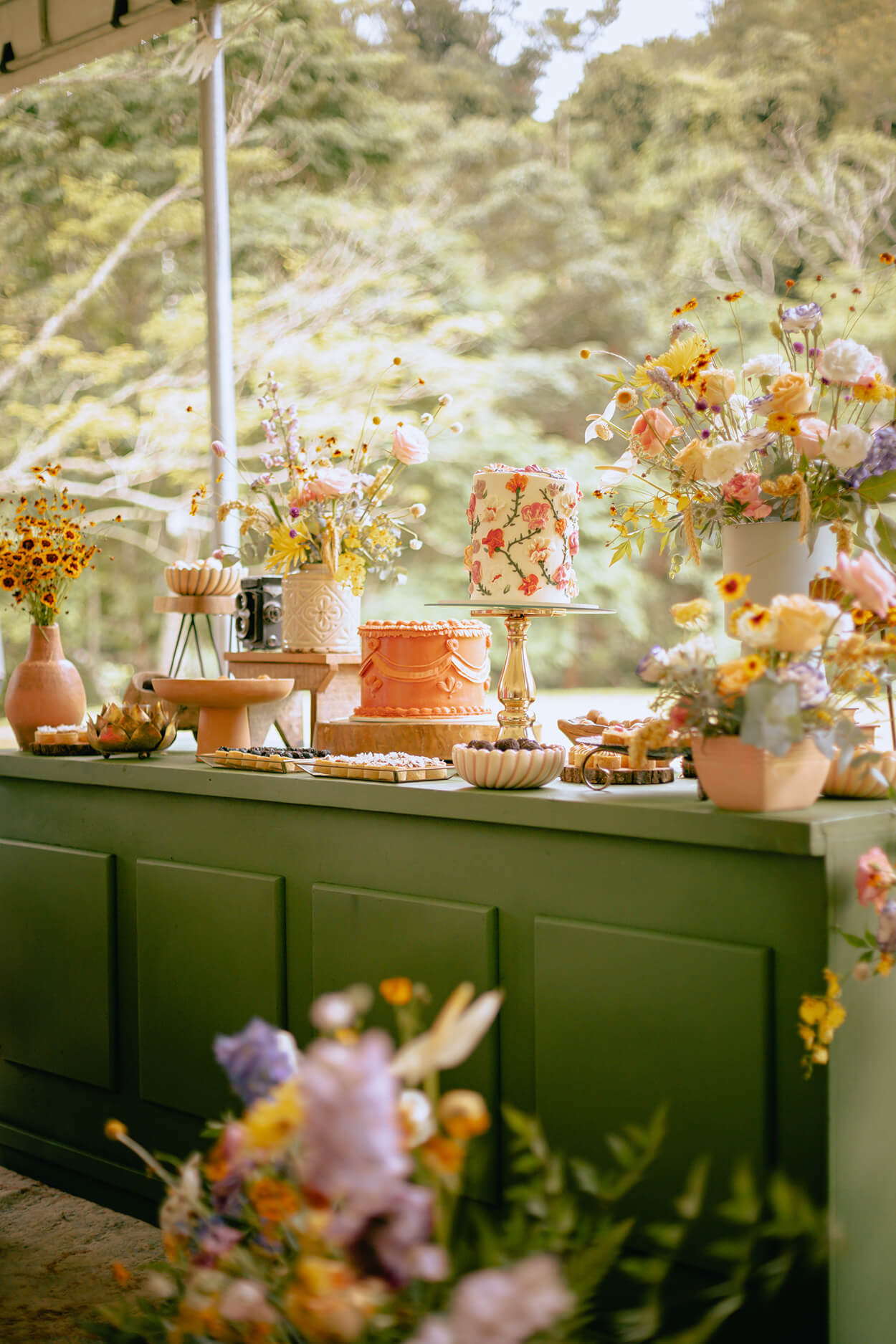 A decoradora traduziu esse espírito em elementos clássicos, flores do campo e tons terrosos combinados com verde claro e azul bebê. O resultado foi um projeto rústico, romântico e cheio de poesia para celebrar uma data tão especial.