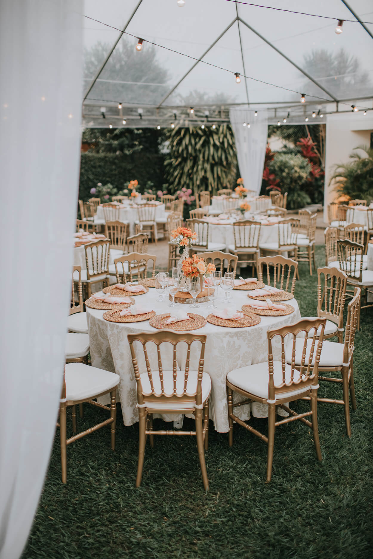 A recepção aconteceu em uma chácara perfeita para a proposta rústica e romântica da decor. Como era de se esperar, a paleta é composta por diferentes tons de laranja e rosa, além do verde oliva.