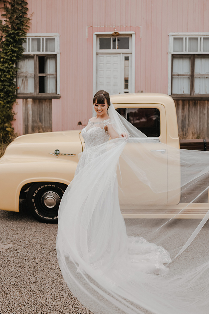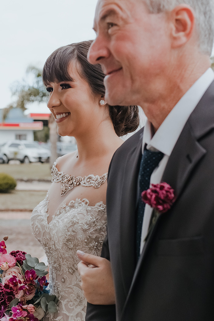 “Durante esse tempo, meu pai se incomodava por eu não mostrar fotos, não entendia porque não podia ver. Então no dia, combinei dele me buscar uns minutos antes no salão em que me arrumei e tudo já estava planejado e esperando por ele, foi emoção pura!
