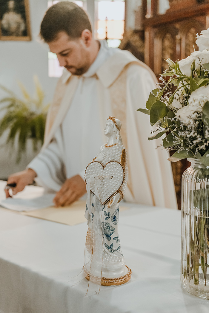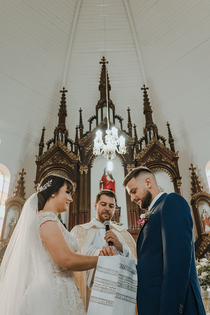 A cerimônia também foi muito especial e era um dos momentos mais aguardados pelo casal. “Ver a família, os amigos, todos felizes e emocionados junto com a linda mensagem que o padre passou, vai ficar guardado para sempre em nossos corações”.