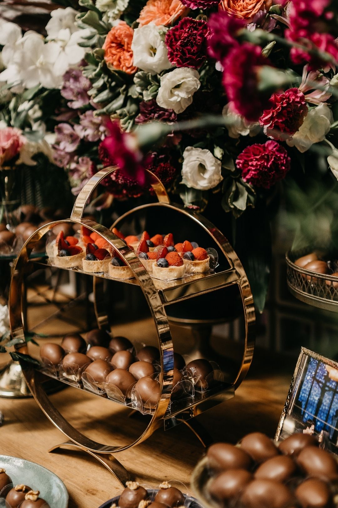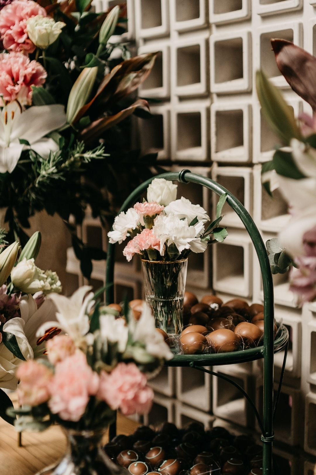 Seguindo as cores do santuário, toda a papelaria do casamento foi com os vitrais azuis da igreja. Logo, a decoração teve toques de azul e flores predominantemente marsala, rosa, verde, lilás, laranja, branco.