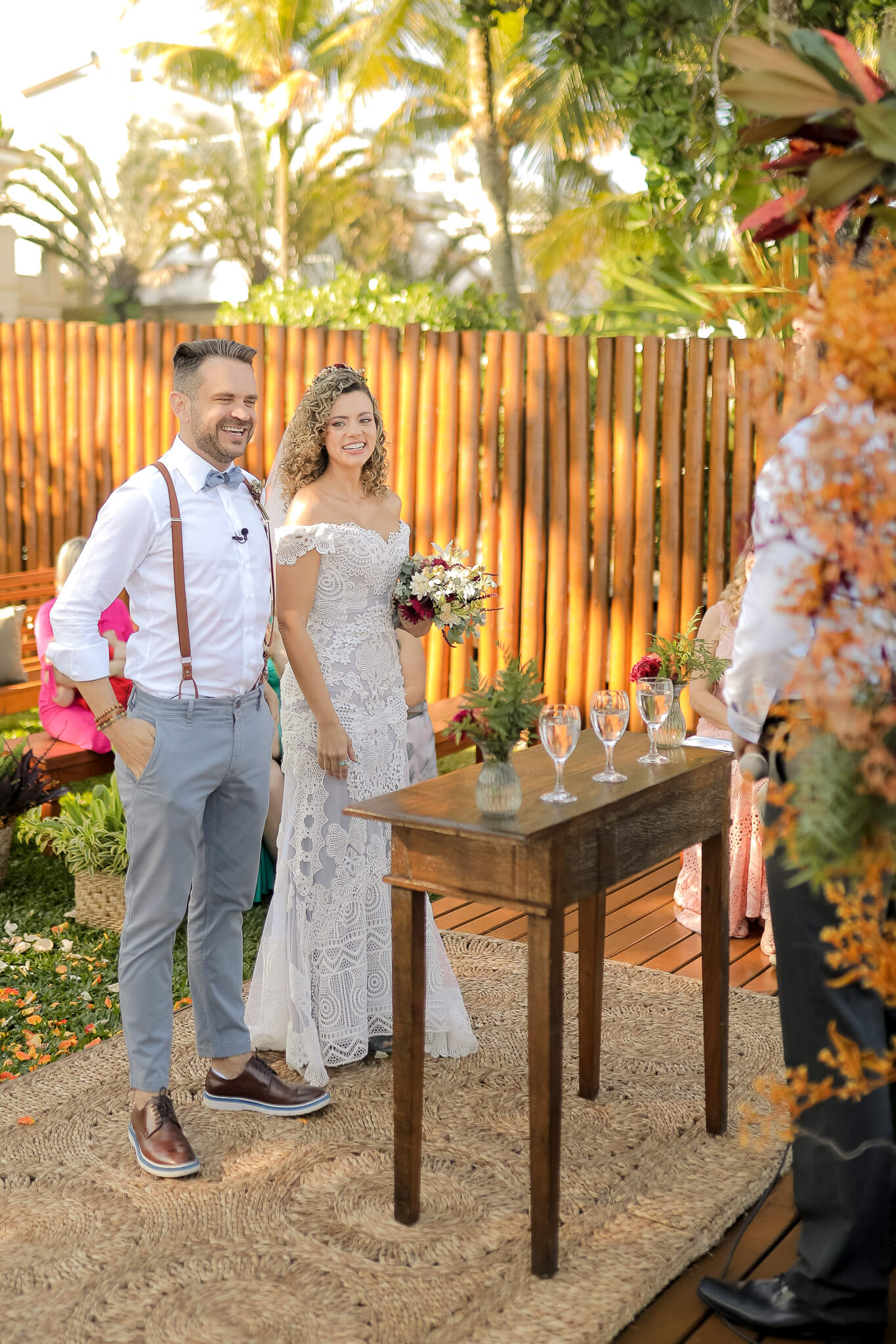 “O clima estava perfeito, essa foi a única data que tivemos nossos cachorrinhos Happy e Life conosco, nesse meio tempo tivemos a oportunidade de convidar nosso querido amigo e Terapeuta Wagner Thiele para ser o celebrante, o lugar não poderia ter sido mais perfeito, a cantora que queríamos muito teve disponibilidade e como está escrito no nosso convite: “Quando as coisas são de Deus, fluem como água cristalina” e foi exatamente assim”.