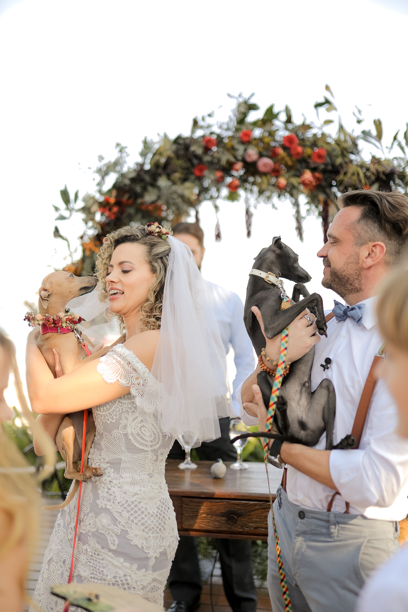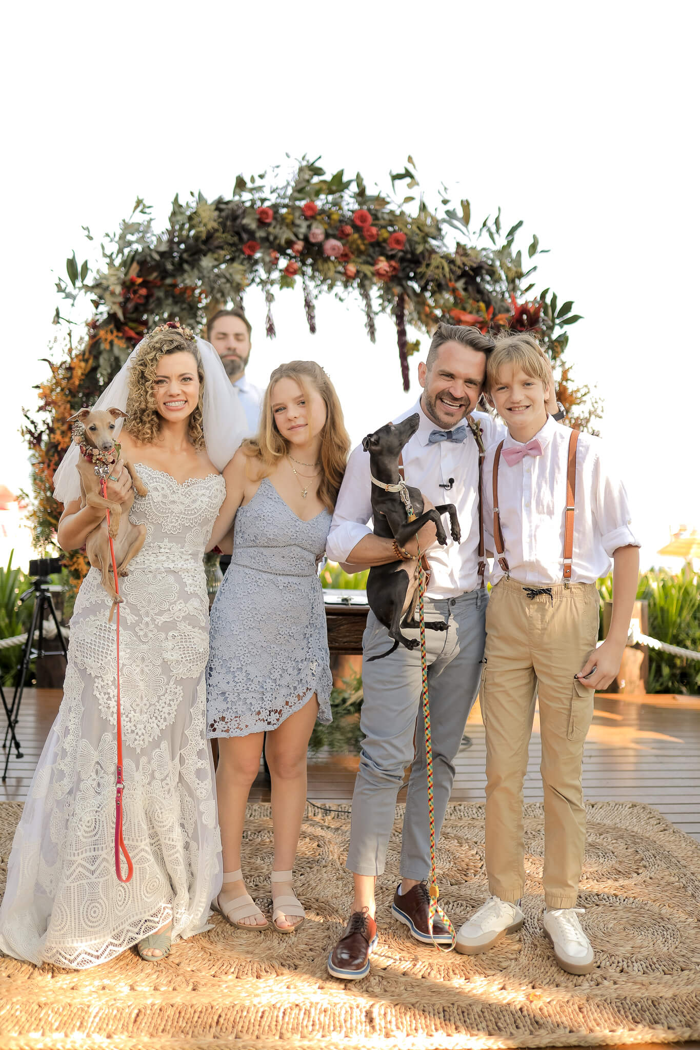 Ela ficou super feliz em saber que seu avô, de 97 anos, estava assistindo ao casamento online. Ainda os cachorros entrando com os sobrinhos levando as alianças foi um show de fofura.