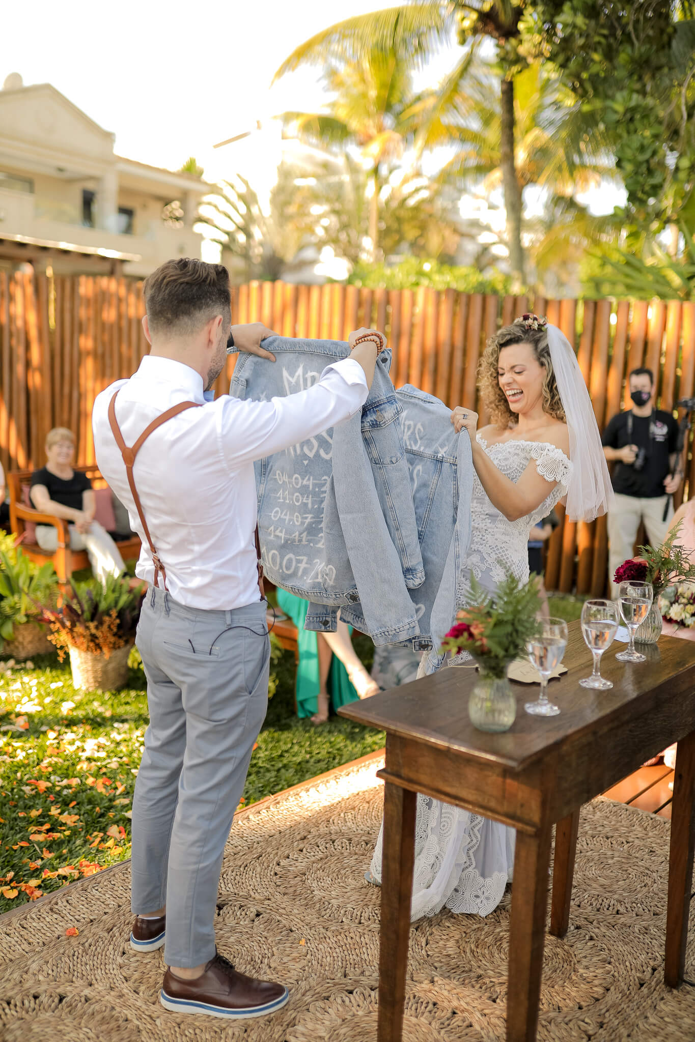 E para marcar ainda mais essa data, o noivo surpreendeu cinco horas antes do casamento, com um pedido oficial dele, ajoelhado, com anel de noivado. A noiva surpreendeu com a entrega das jaquetas jeans, com datas que foram adiadas e que viralizaram na internet.