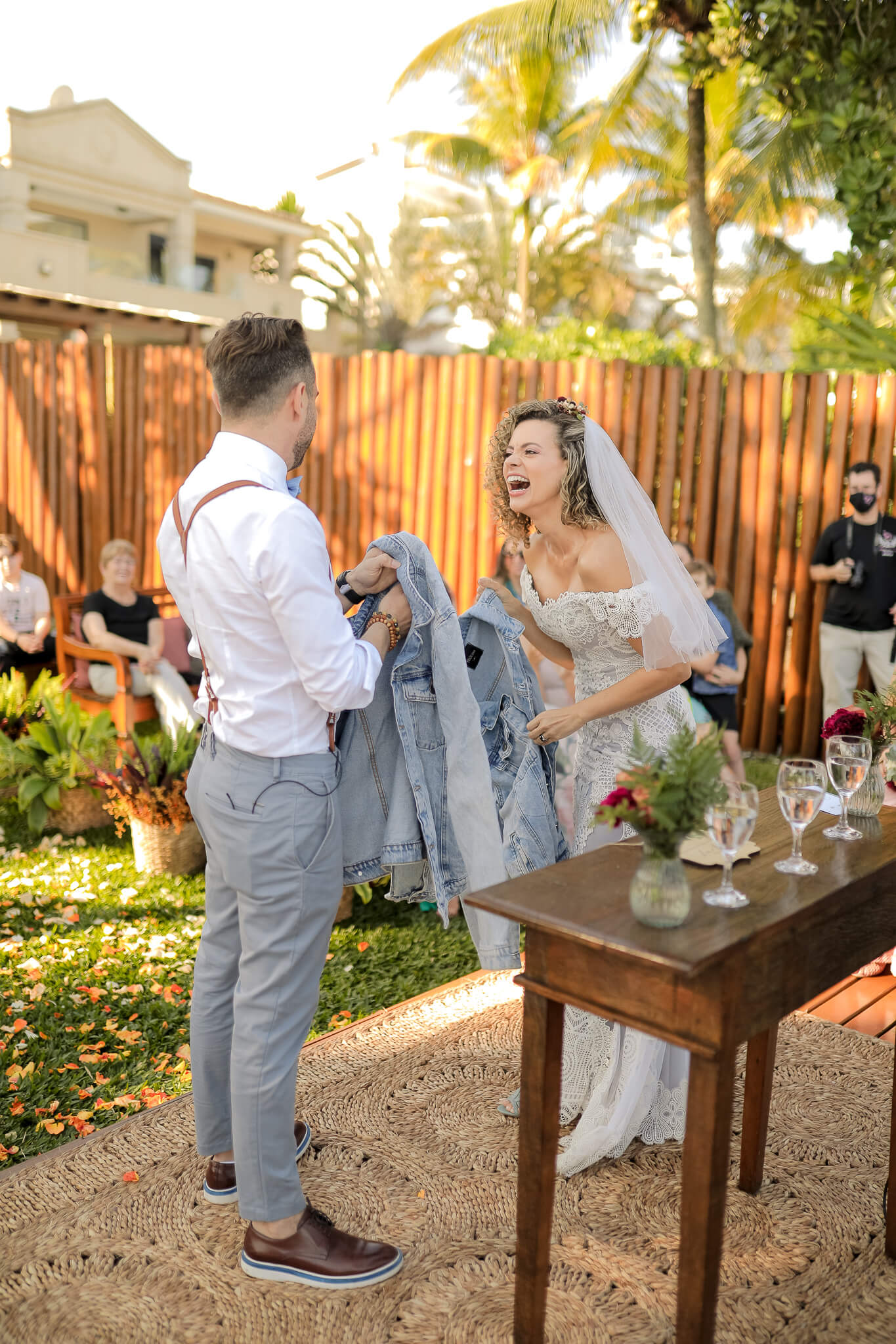 A Liv fez o design das havaianas com ilustrações de beijos, que remete ao sobrenome “Kiss”. Ainda teve a ideia da jaqueta jeans com as datas adiadas, que foram confeccionadas um dia antes de viajar para a praia, onde aconteceu a cerimônia.