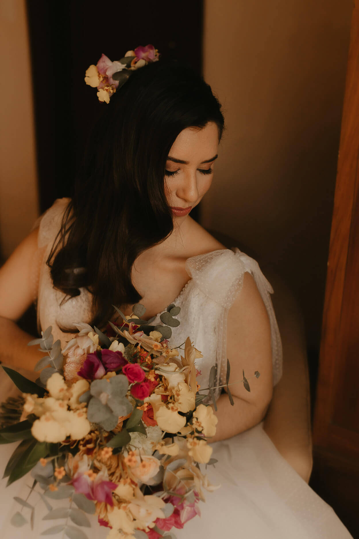 O vestido todo trabalhado em tule entregou um visual super delicado para a Alice, mas também gerou muita tensão “estava difícil de achar um vestido que eu gostasse. Experimentei o escolhido só dois dias antes do casamento, o modelo veio de Barcelona”.
