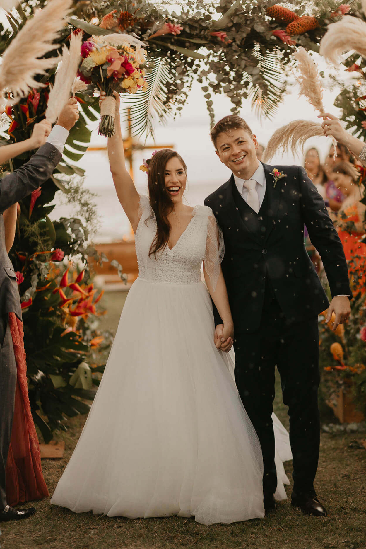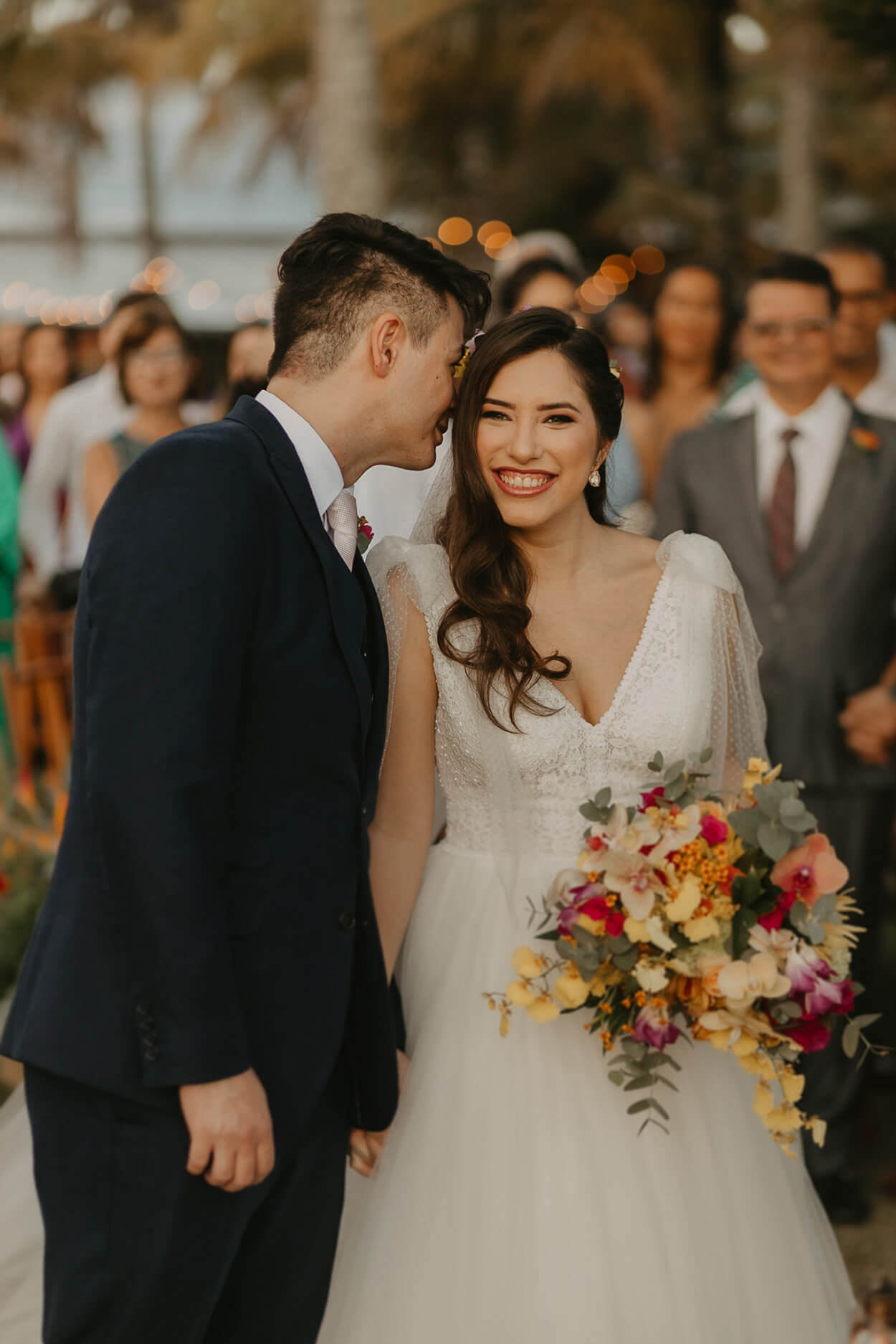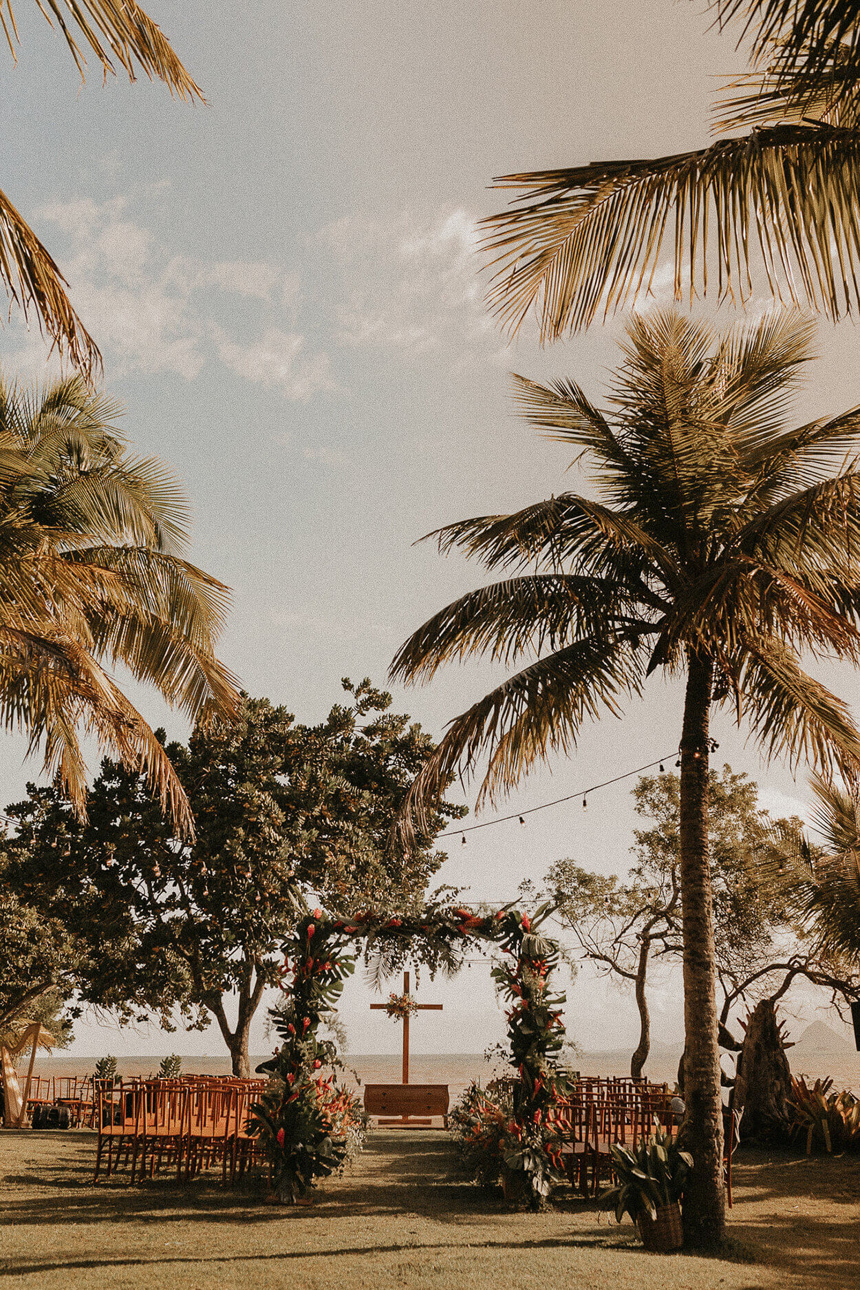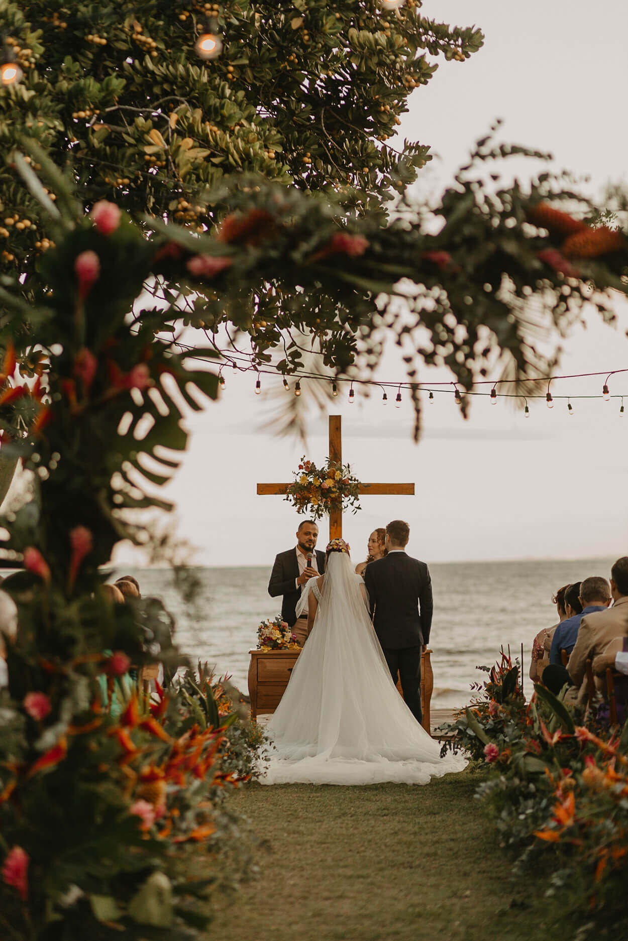 Esse casal se apaixonou à moda antiga, conversando por cartas, acredita? E é claro que o casamento também não seria nada convencional, por isso, eles apostaram na decoração tropical para uma linda celebração em frente ao mar.