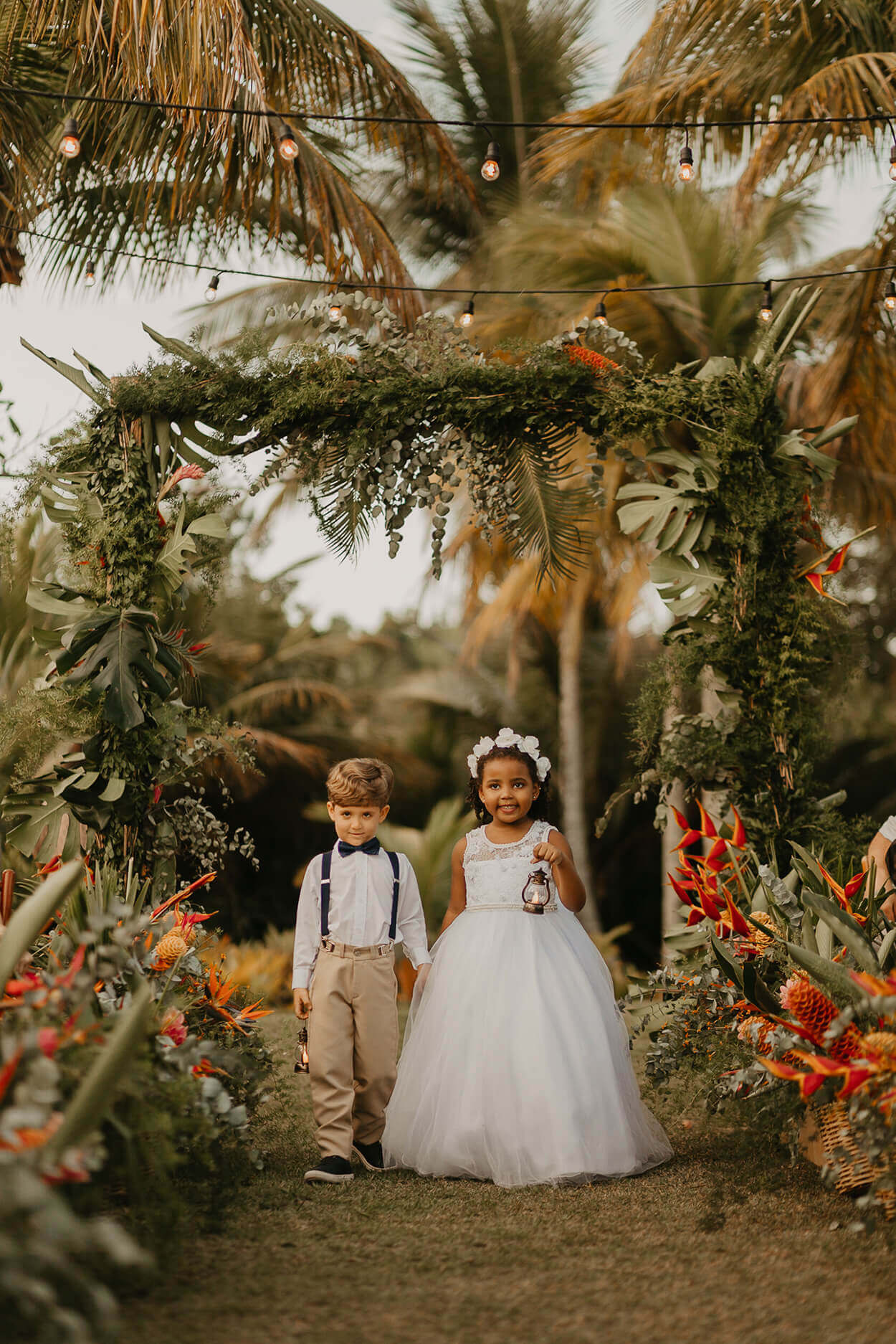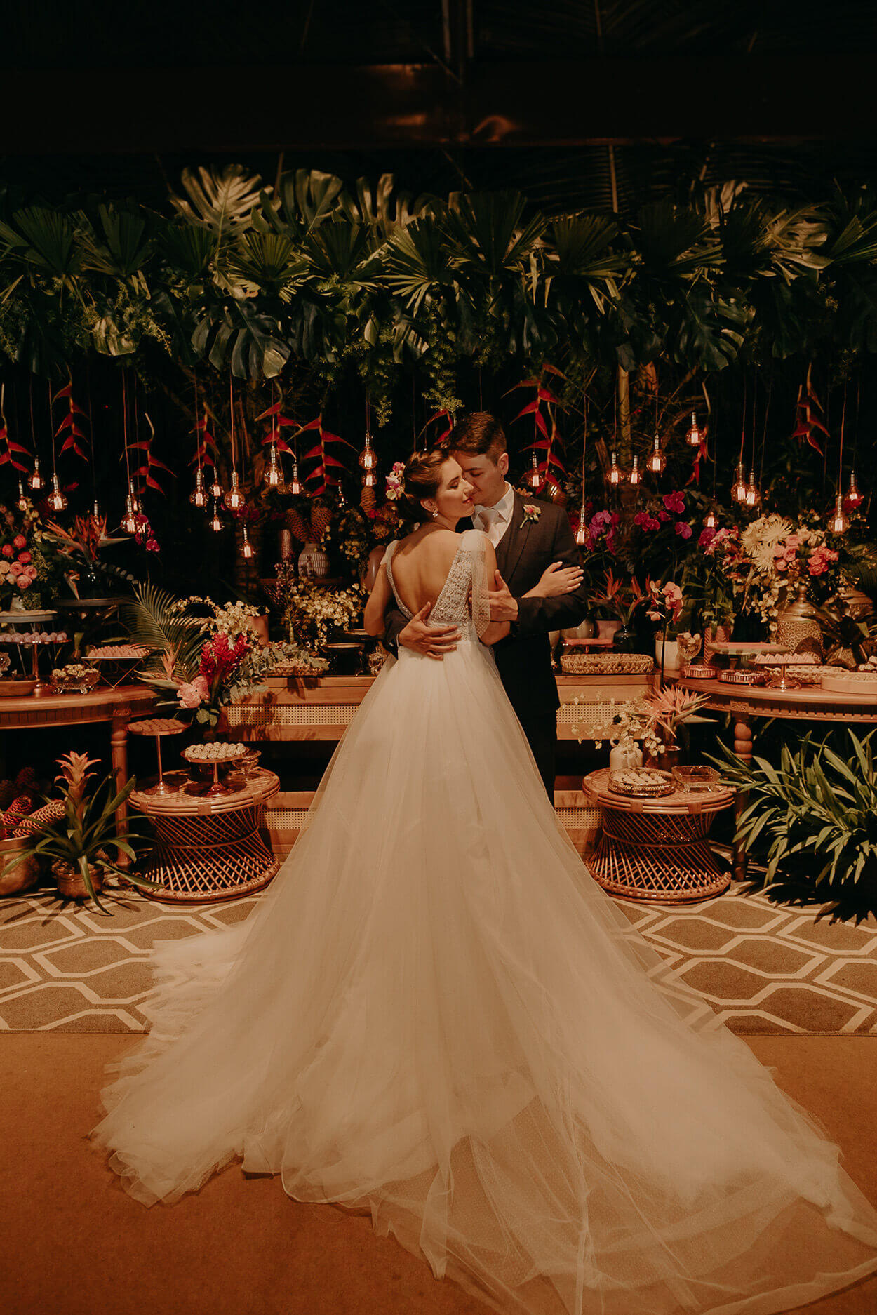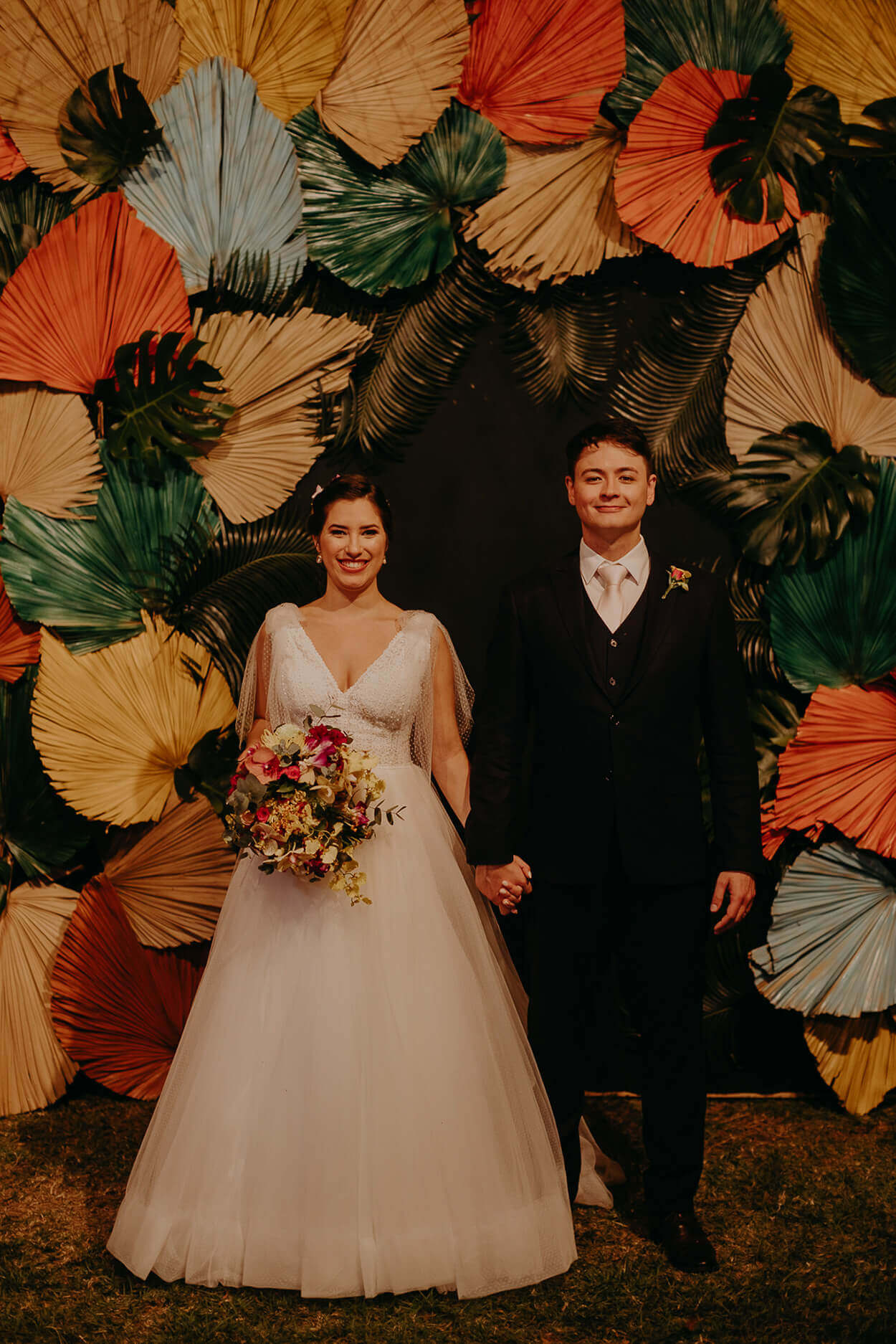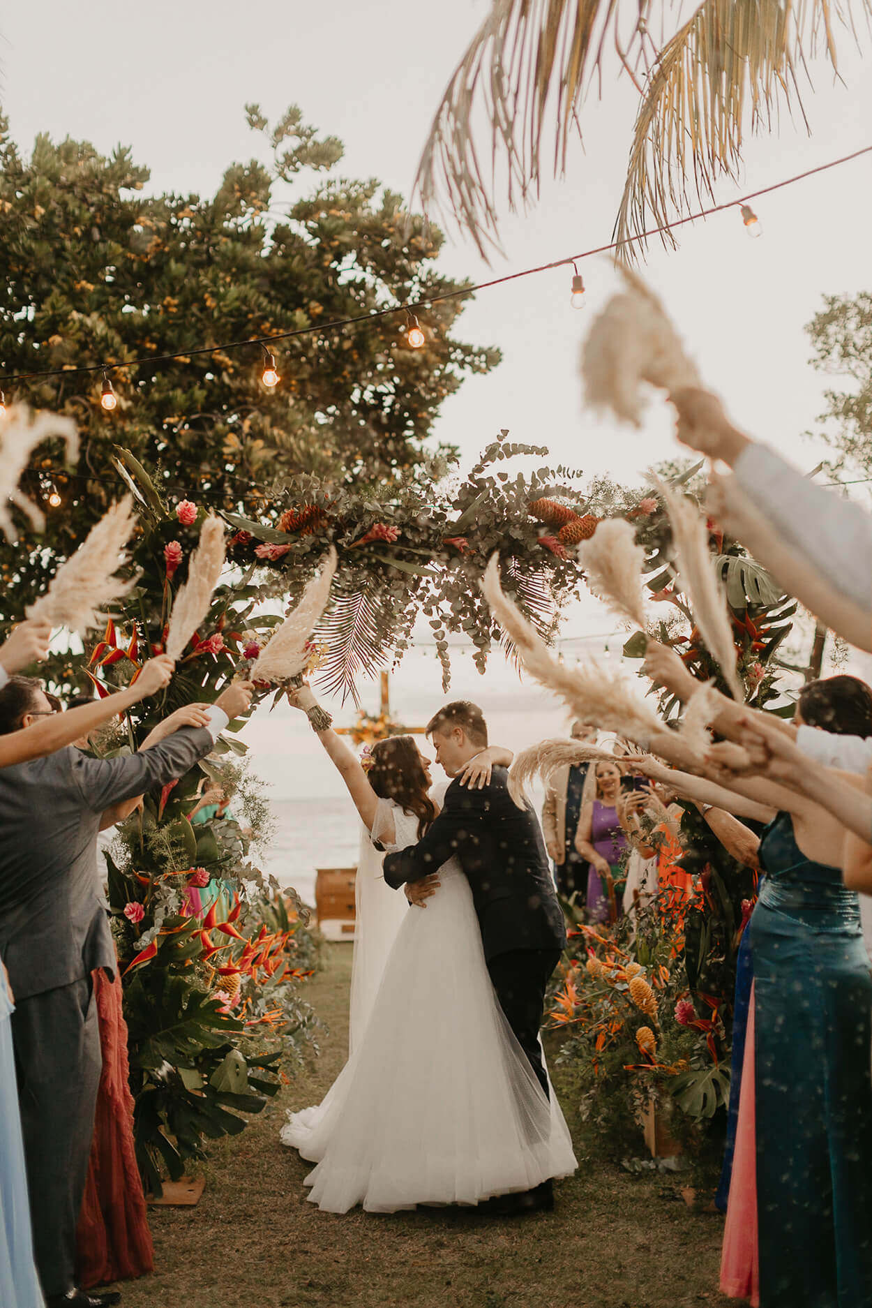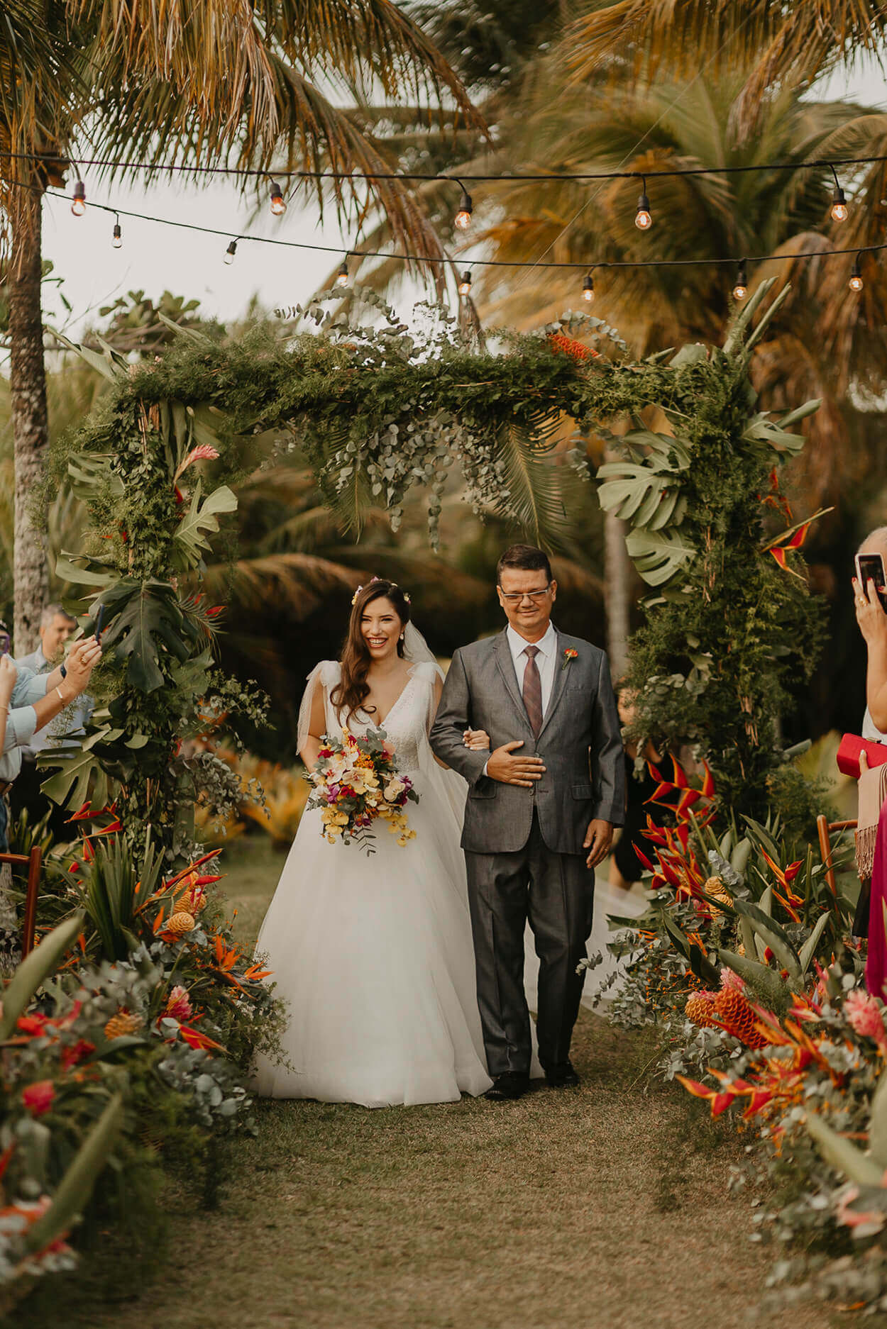 Esse casal se apaixonou à moda antiga, conversando por cartas, acredita? E é claro que o casamento também não seria nada convencional, por isso, eles apostaram na decoração tropical para uma linda celebração em frente ao mar.