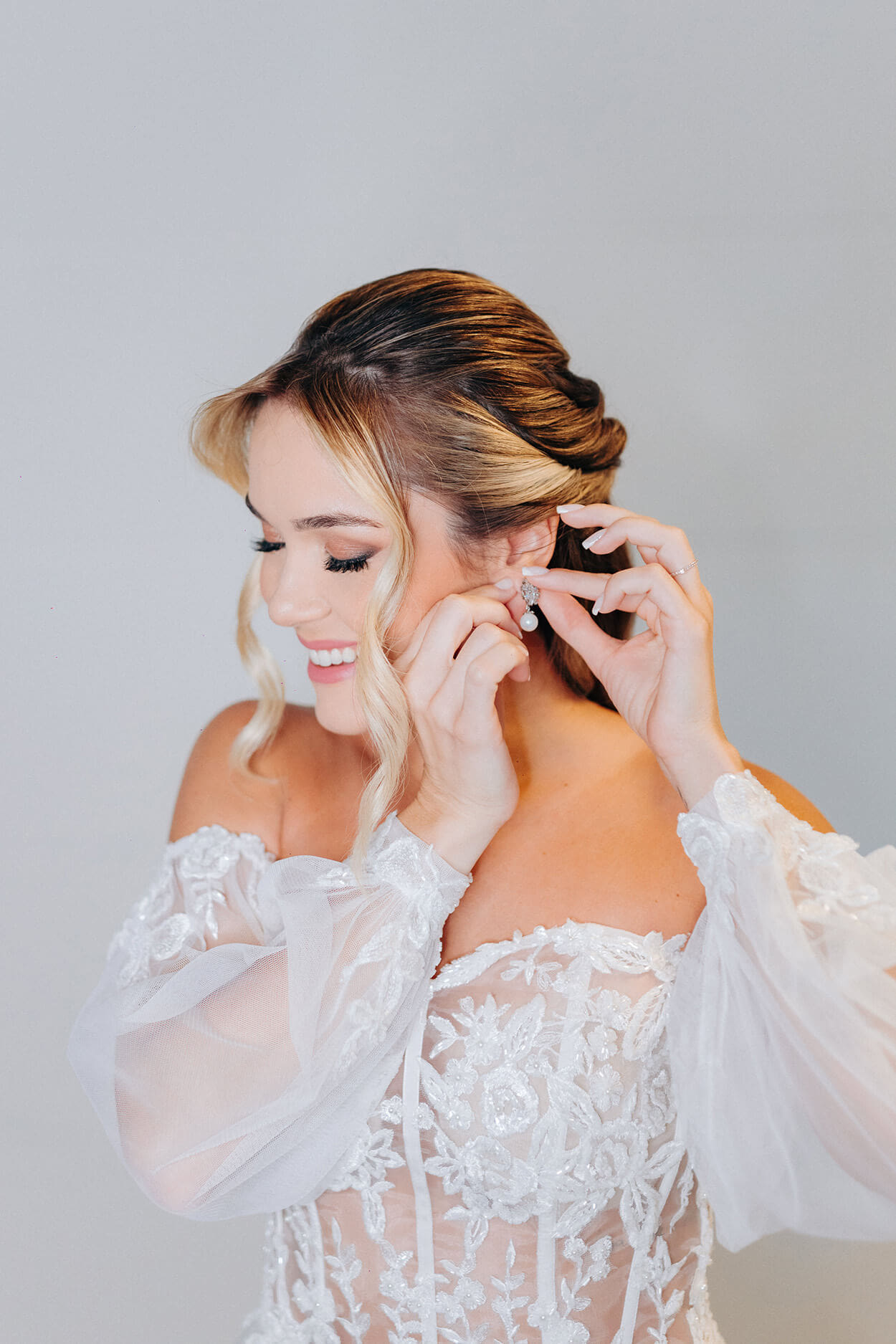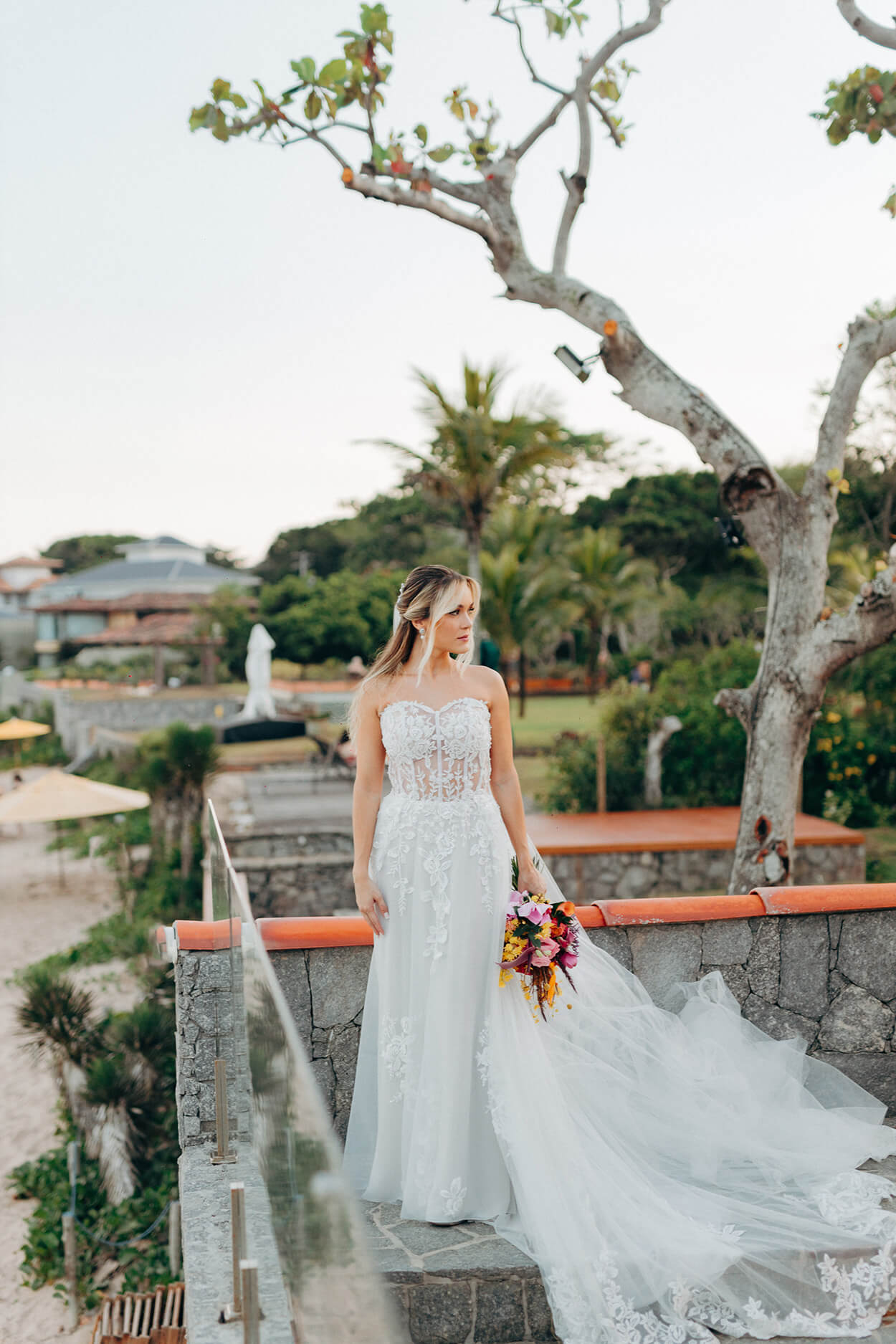Agora entra em cena a noiva com seu vestido todo trabalhado no bordado floral. Faz algum tempo que temos visto que os modelos tipo corset vêm conquistando espaço. Apesar de lindo, esse ainda não é look final dela, e abaixo você verá como o visual se transforma com as mangas removíveis.