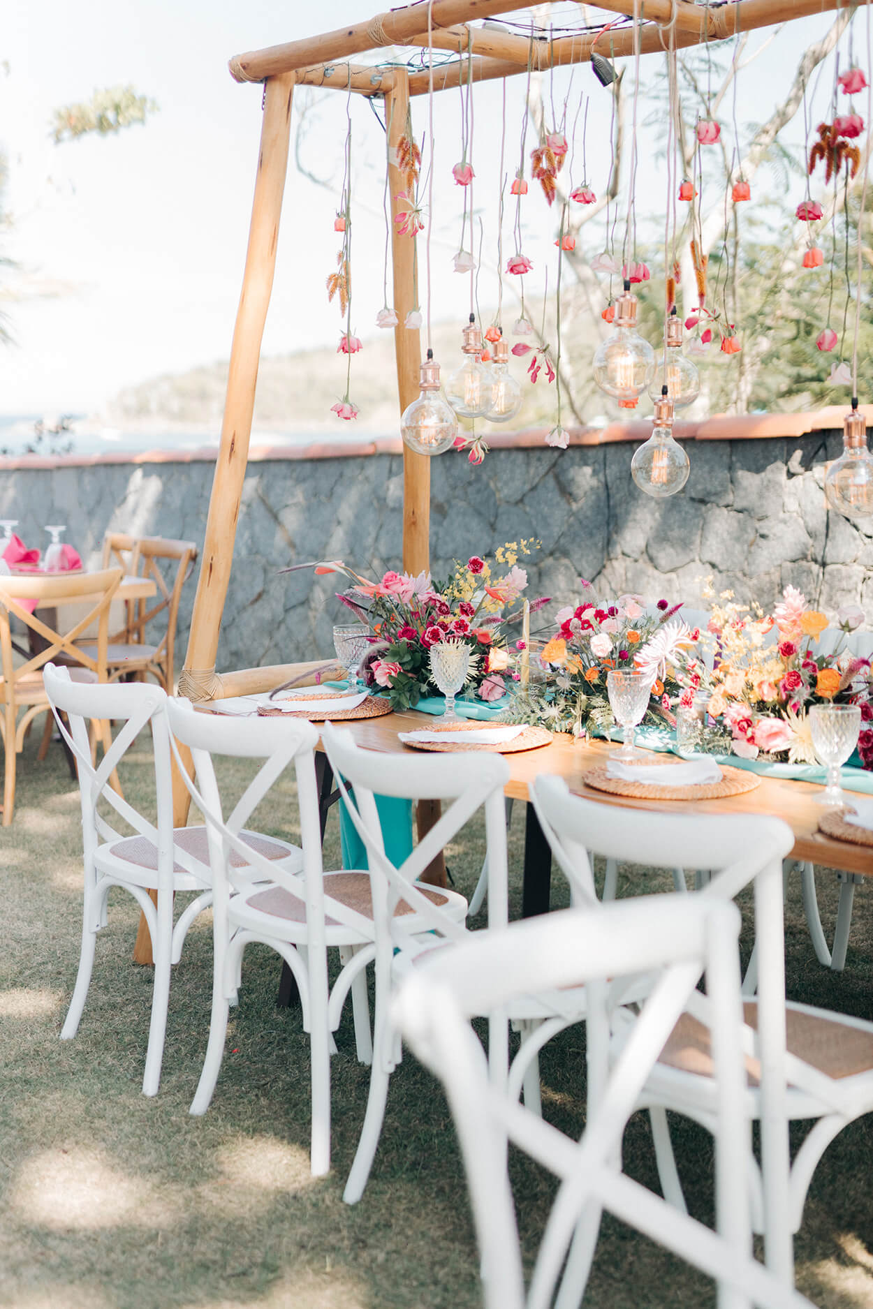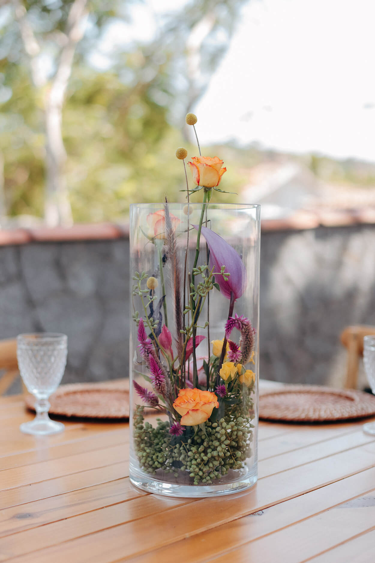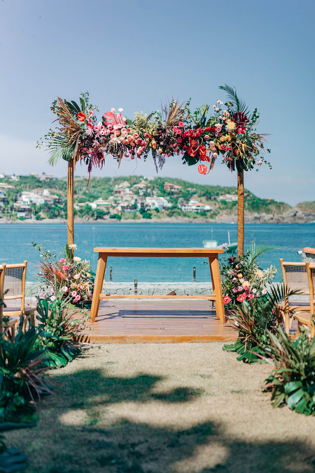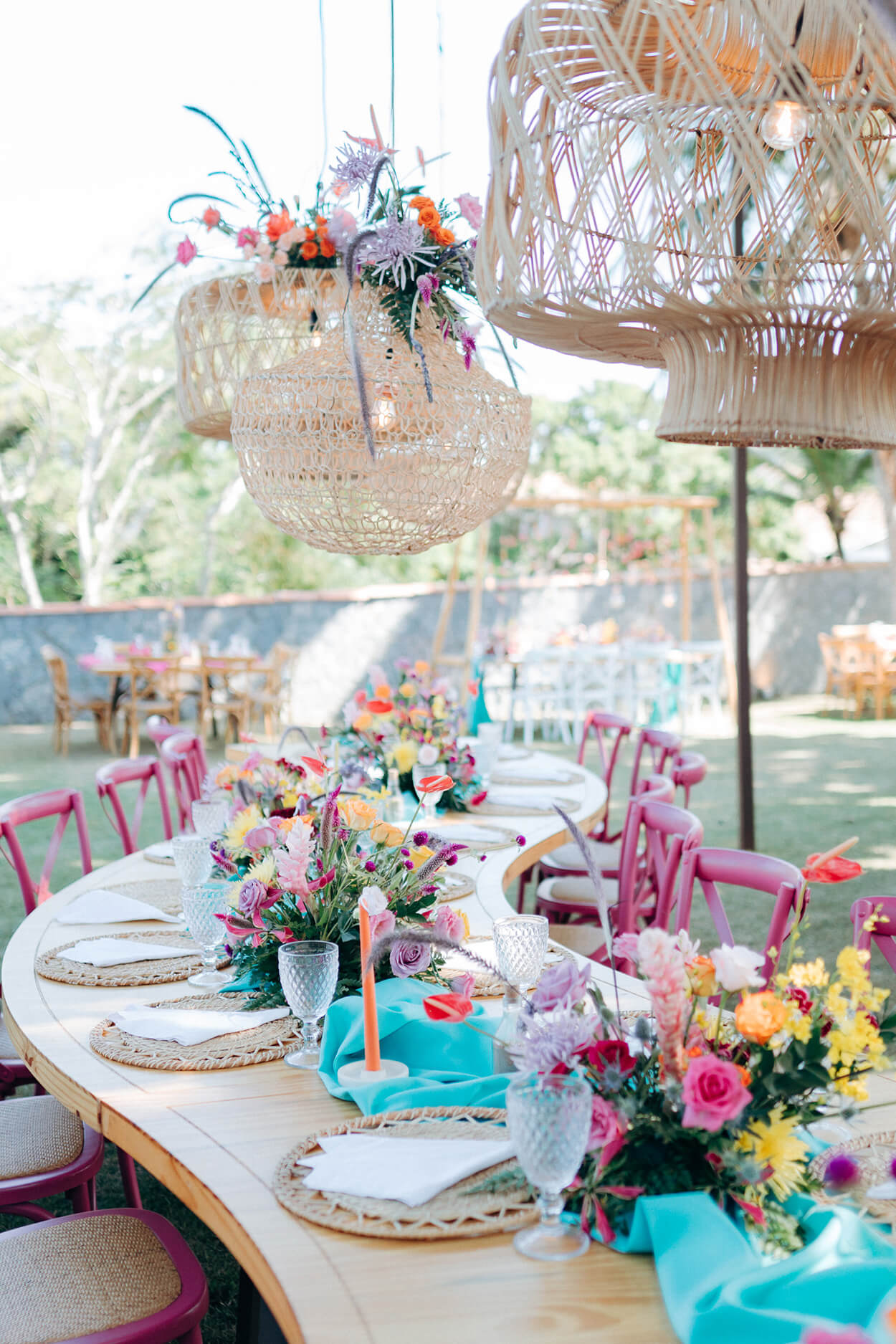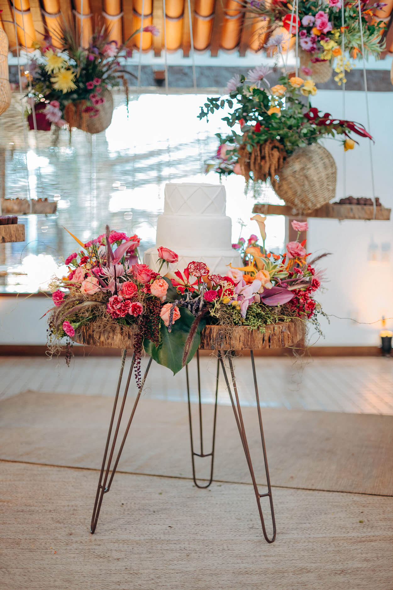 Outro ponto de destaque são as flores coloridas naturais misturadas às espécies desidratadas e pintadas. Ainda tem as folhagens para dar aquela cara tropical mas, ao mesmo tempo, moderna e autoral.