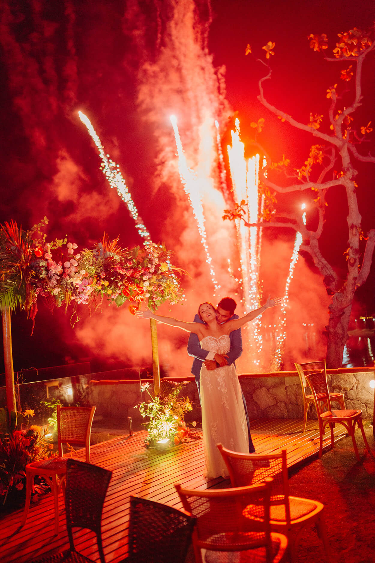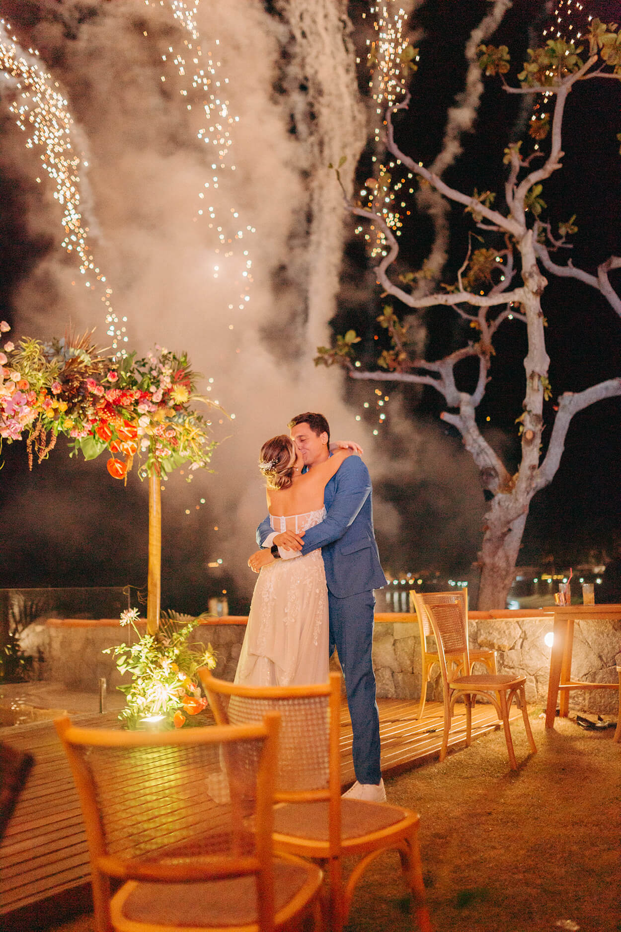 Quer saída mais marcante do que essa? Podemos dizer que o momento foi dividido em três partes: a primeira logo após o primeiro beijo, que ganhou bolhas de sabão. A caminhada com os padrinhos contou com a magia dos sparkles e, para finalizar a noite, o casal curtiu um mini show de fogos de artifício.