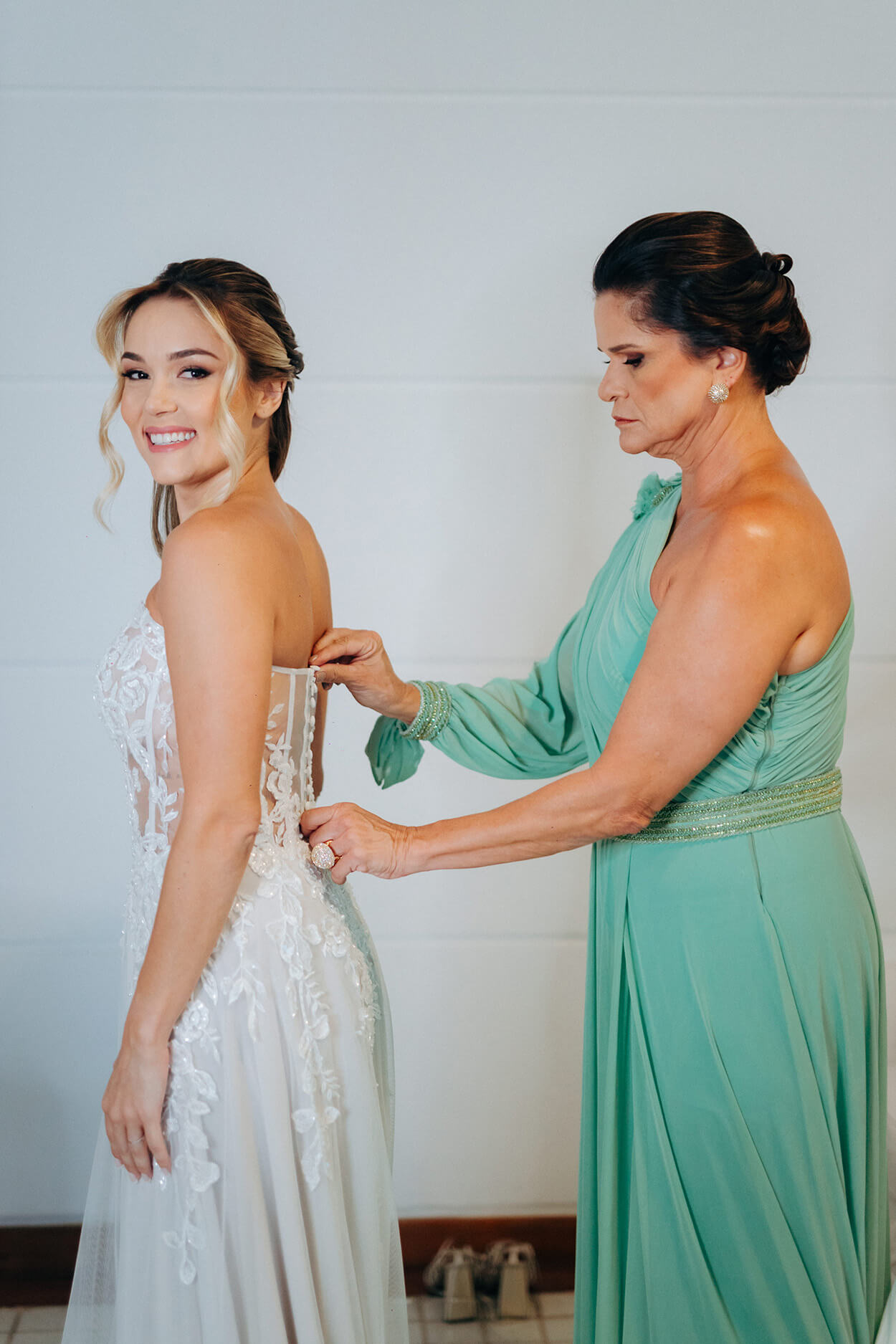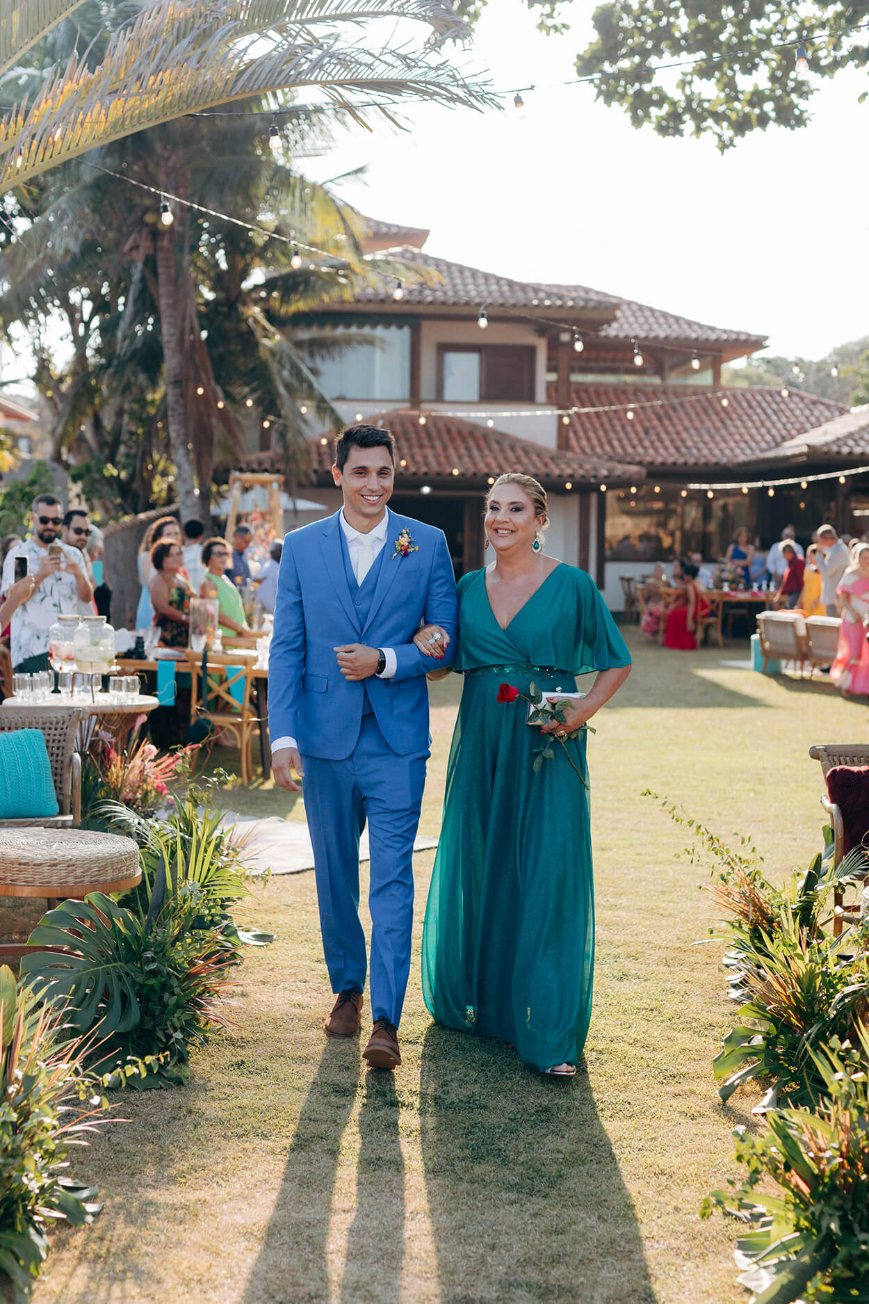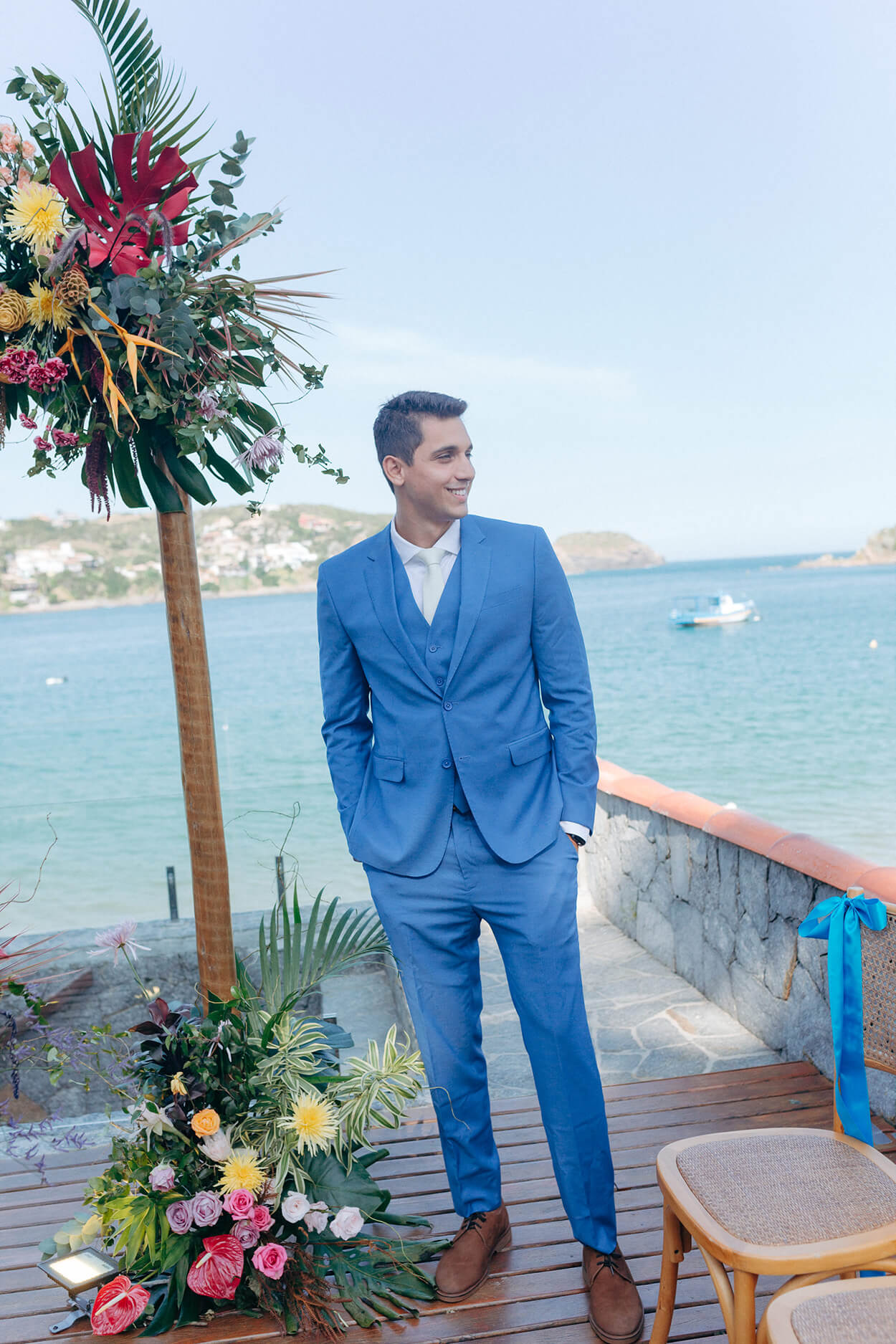 O azul marca presença tanto no visual do noivo quanto dos padrinhos. E o tão esperado vestido das mães continua dentro da paleta, só que com tons mais próximos do tuquesa e do verde água.