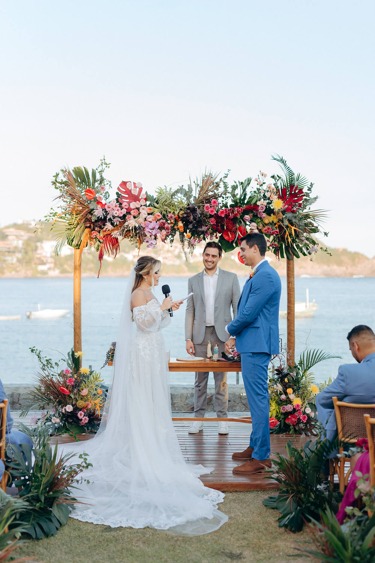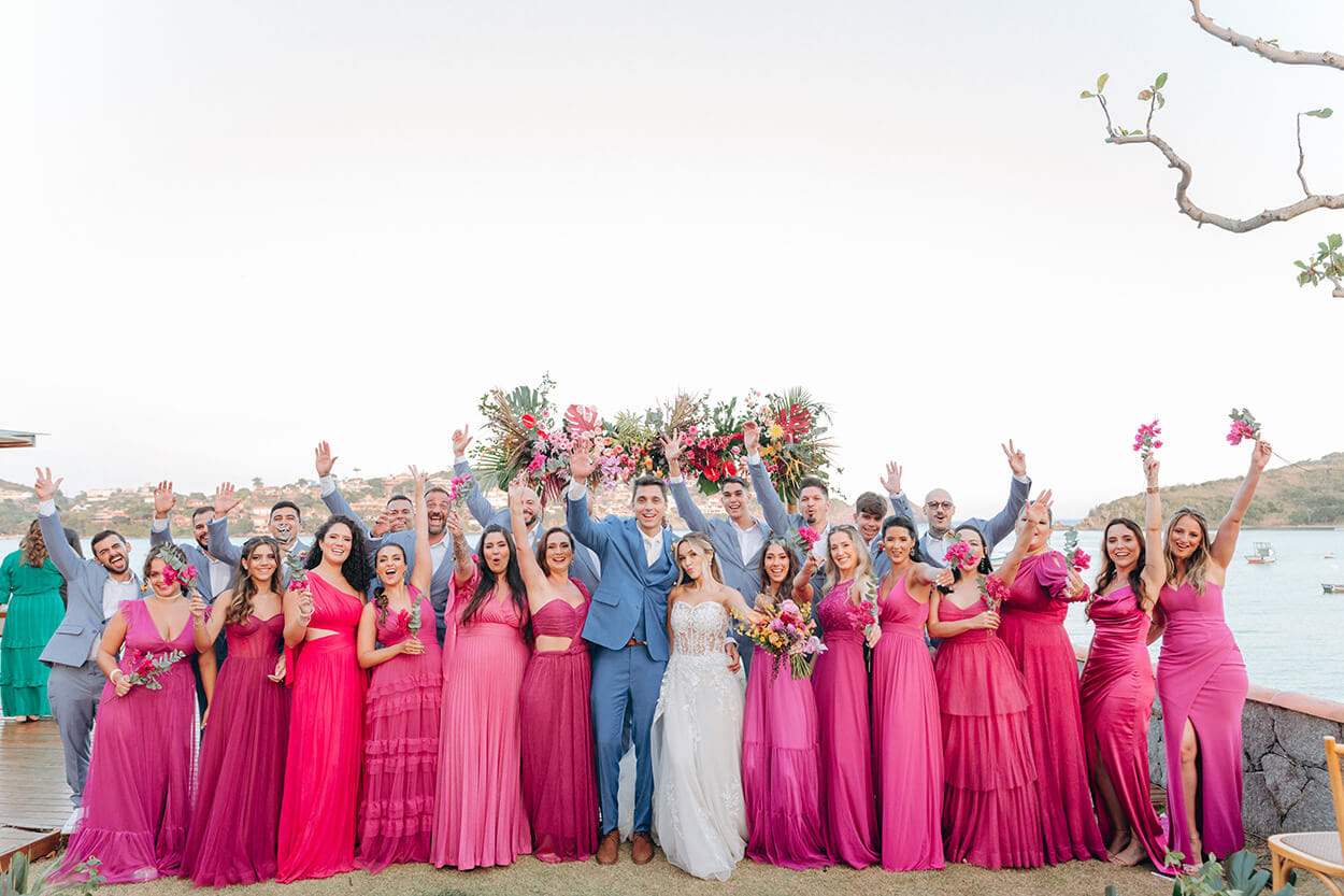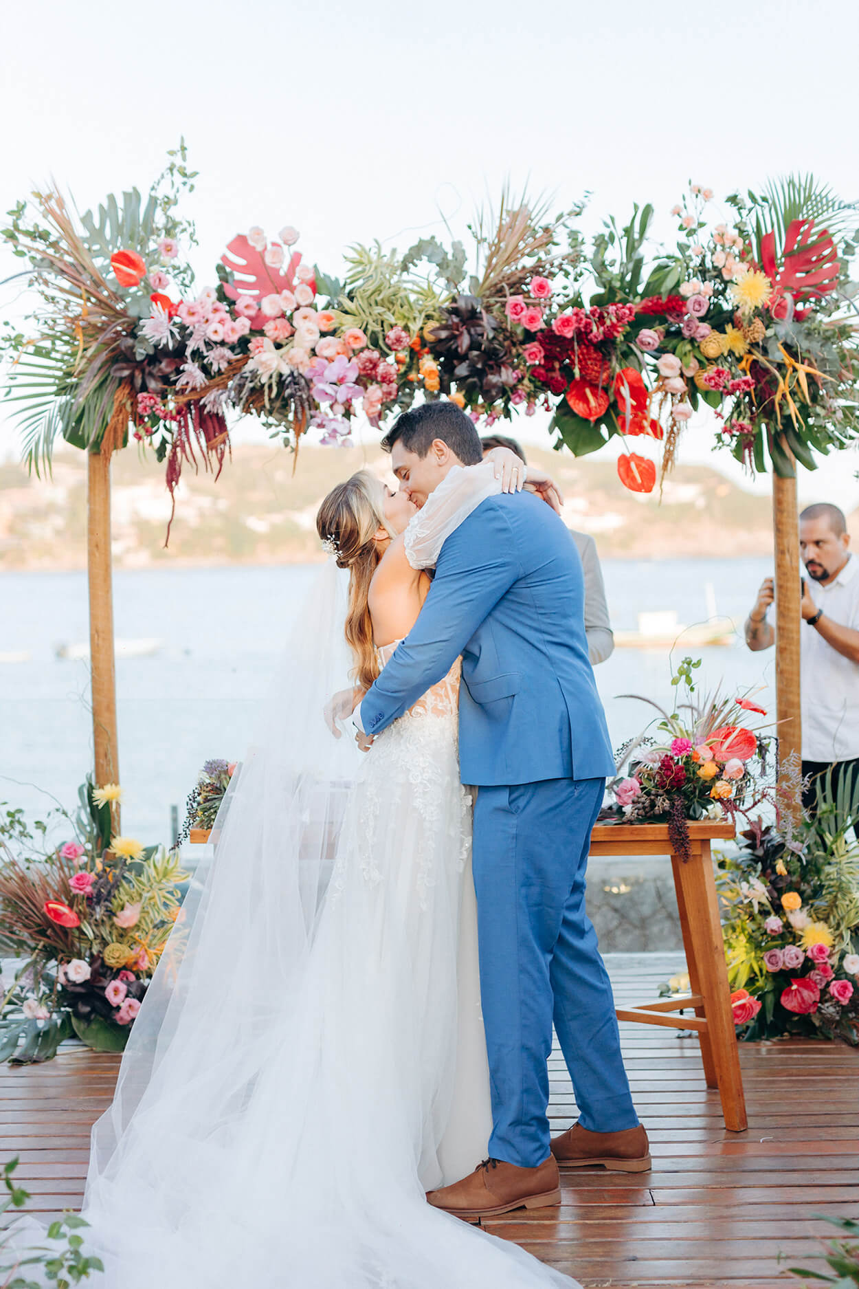 O azul marca presença tanto no visual do noivo quanto dos padrinhos. E o tão esperado vestido das mães continua dentro da paleta, só que com tons mais próximos do tuquesa e do verde água.