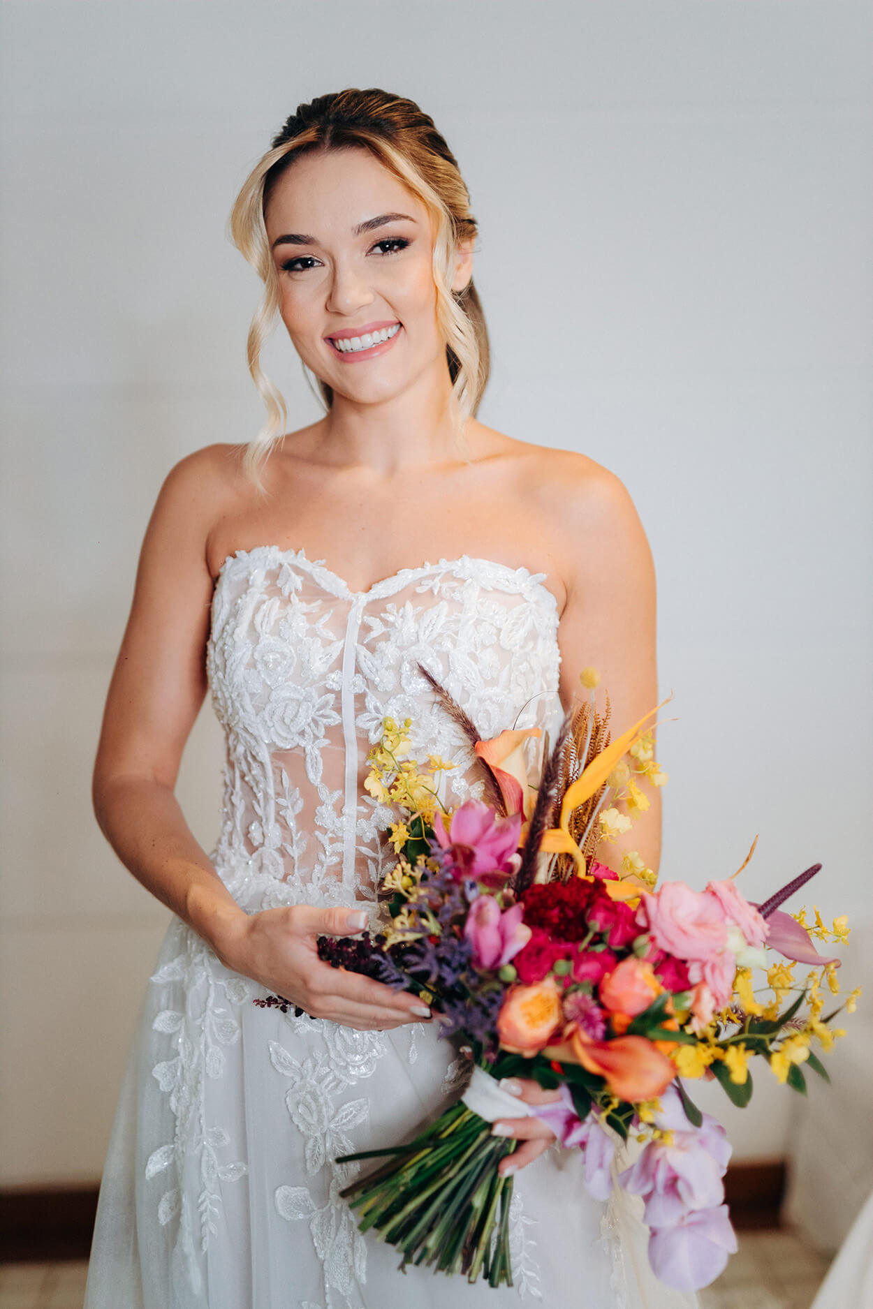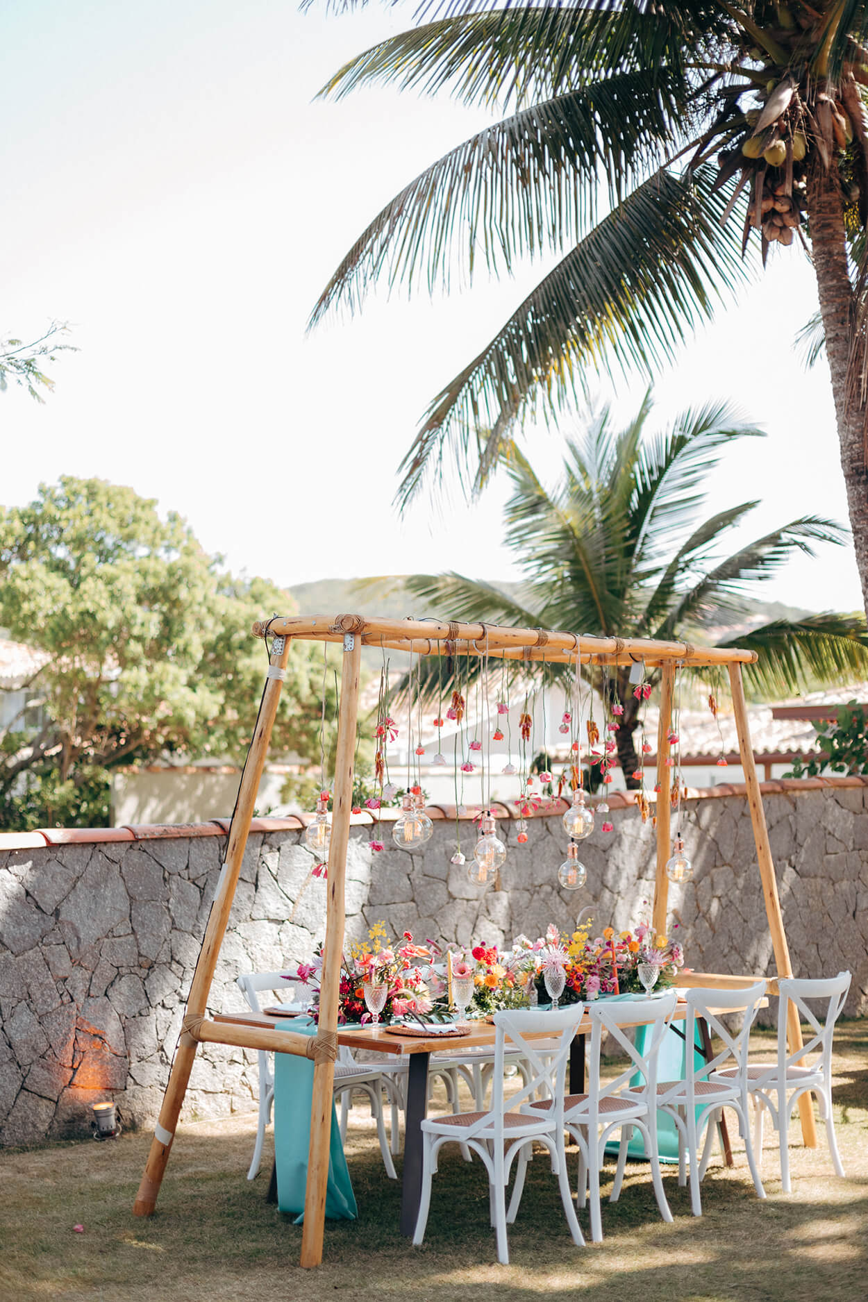 Outro ponto de destaque são as flores coloridas naturais misturadas às espécies desidratadas e pintadas. Ainda tem as folhagens para dar aquela cara tropical mas, ao mesmo tempo, moderna e autoral.