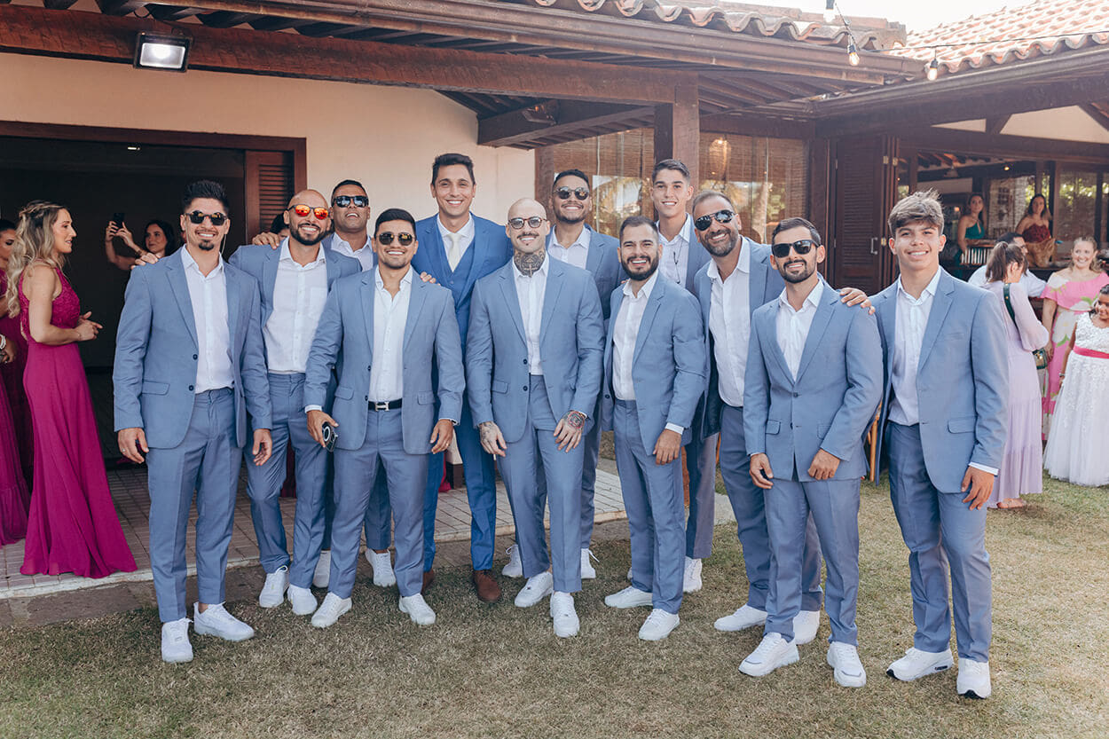 O azul marca presença tanto no visual do noivo quanto dos padrinhos. E o tão esperado vestido das mães continua dentro da paleta, só que com tons mais próximos do tuquesa e do verde água.