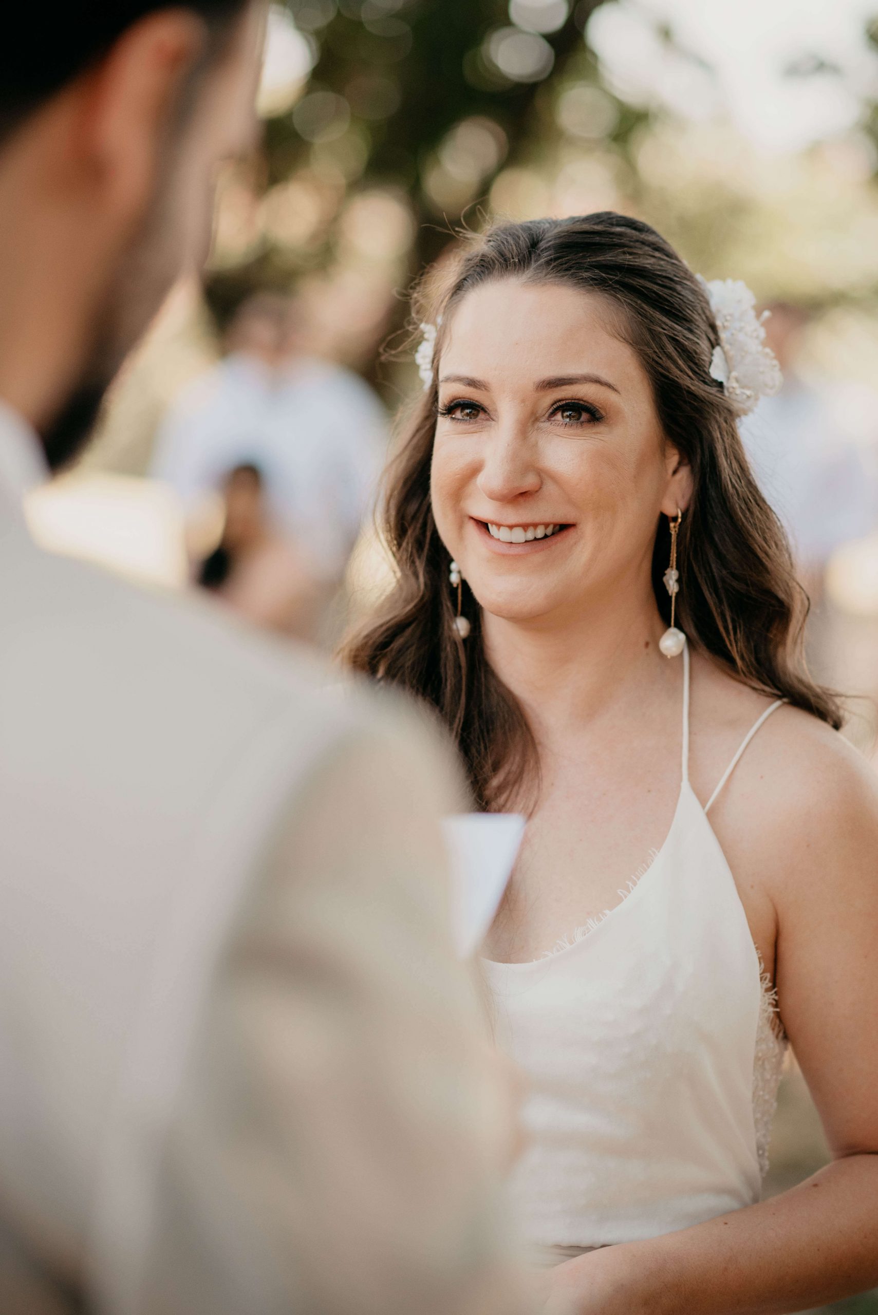 Da cerimônia com votos surpresa, da noiva de tênis até a saída dos noivos com fumaça colorida, o casal expressou toda sua personalidade em detalhes que amamos. Achamos super fofo ela usar o acessório de cabelo, o mesmo arranjo que a sogra se casou, em julho de 1985.