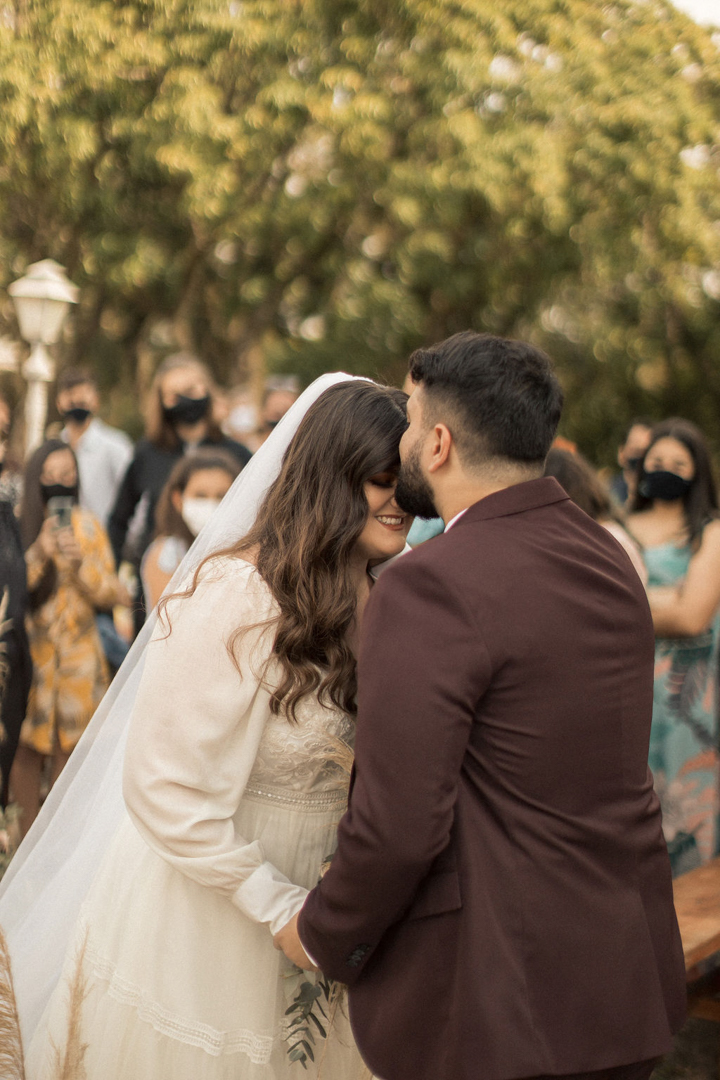 A troca das alianças, os noivos chamaram dois amigos para cantar. “Não deu pra conter o choro, era um choro de gratidão extrema”. E como a mãe da noiva é cerimonialista, ela preparou o buquê. “Na manhã que estávamos nos arrumando no salão, ela me presenteou com o buquê, era lindo, me emocionei ainda mais porque veio dela”.