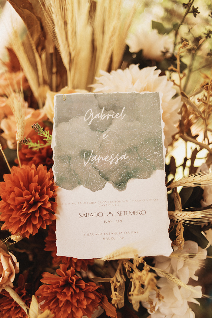 Vanessa e Gabriel são um casal pura sintonia e escolheram o interior de São de Paulo para selar sua união. Eles colocaram a mão na massa para fazer desde o convite, a papelaria do dia e as lembrancinhas.