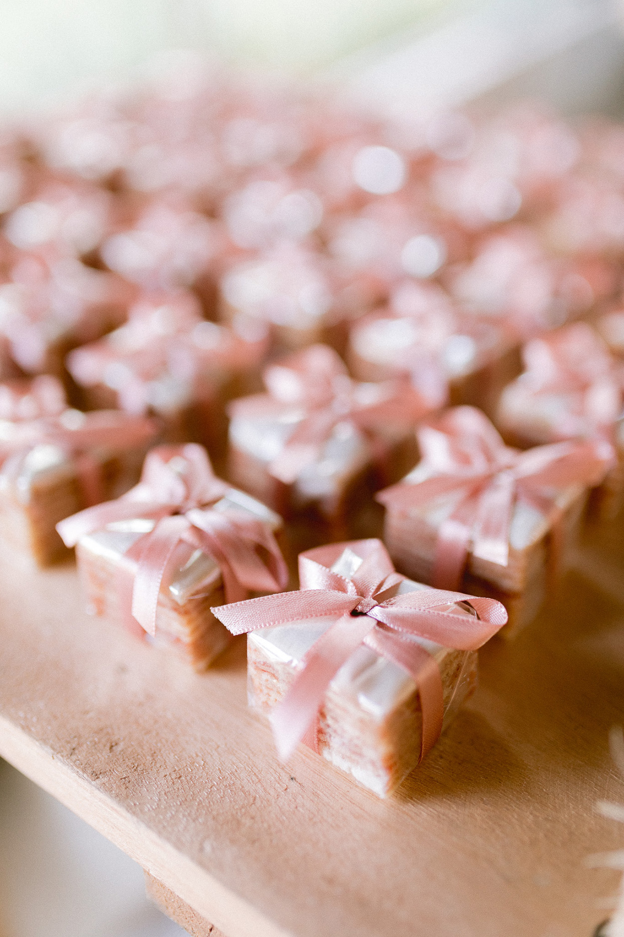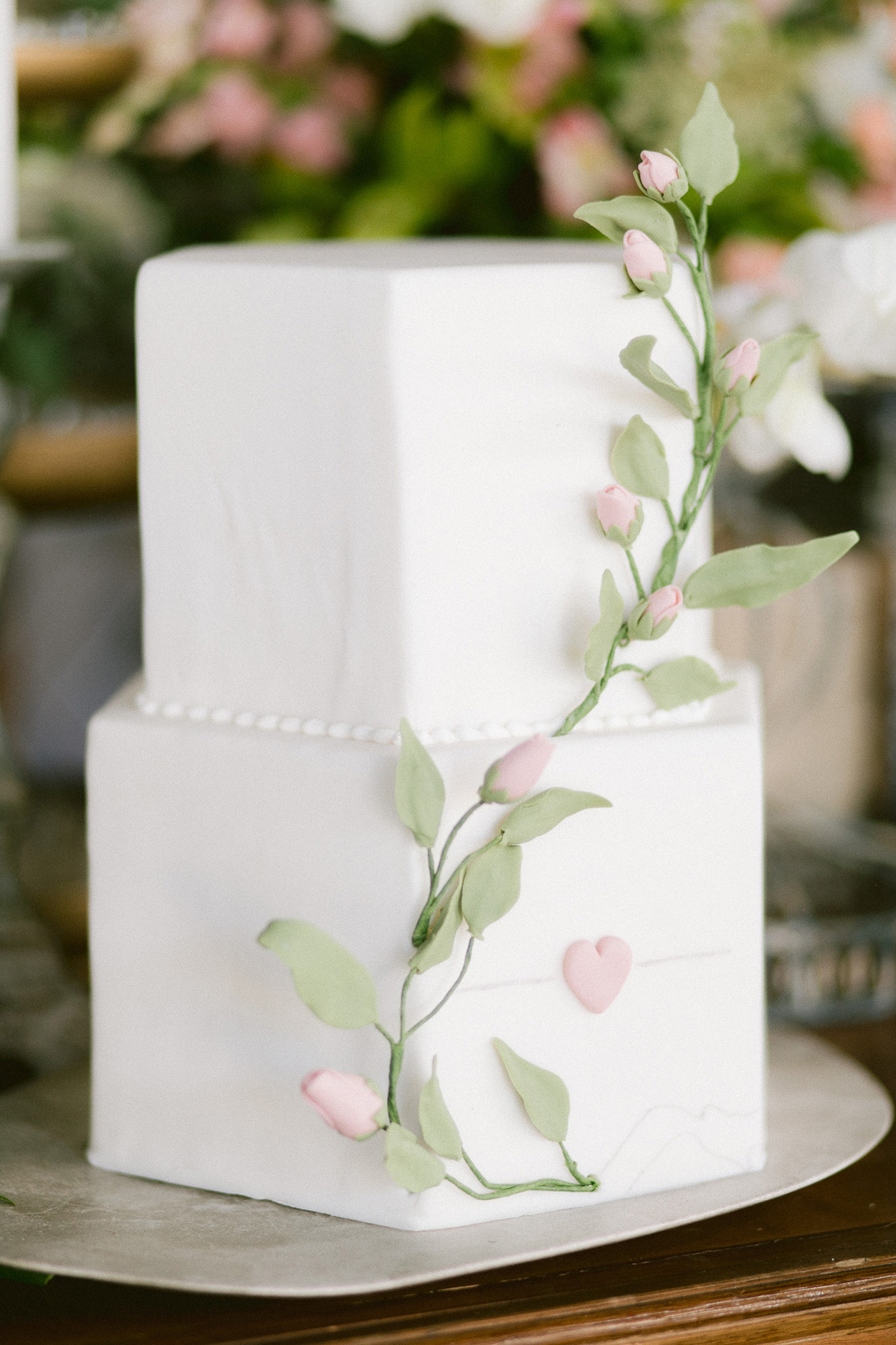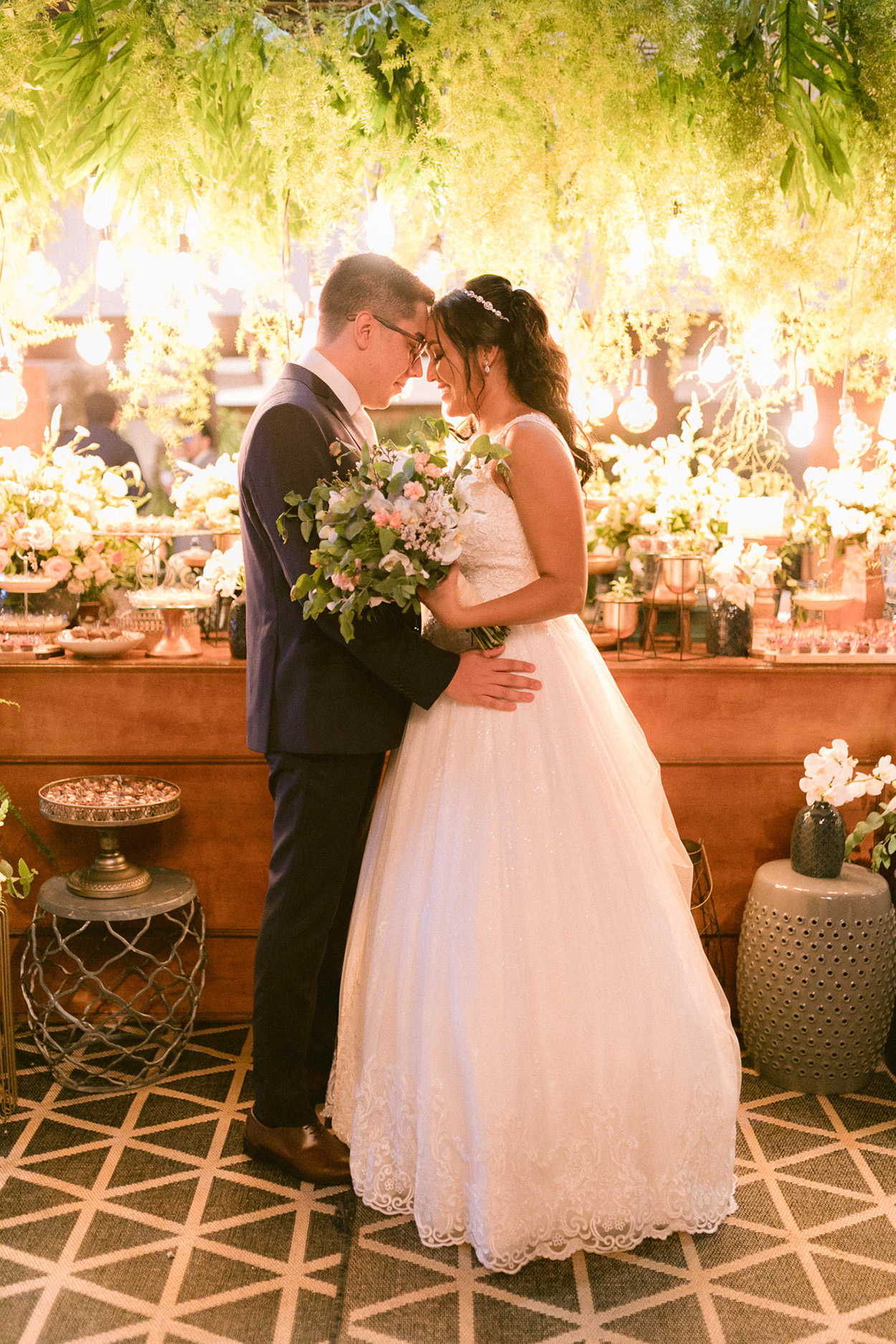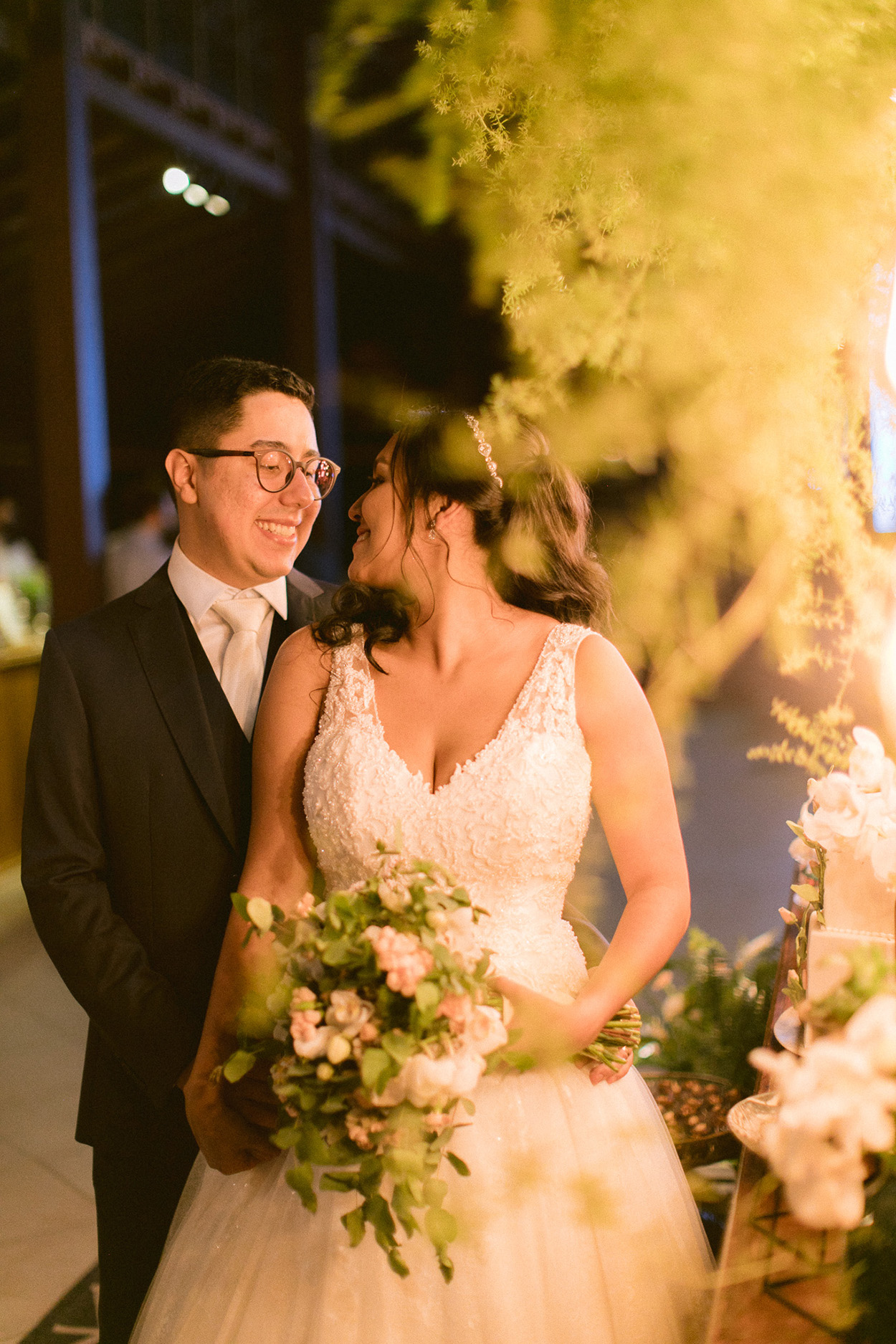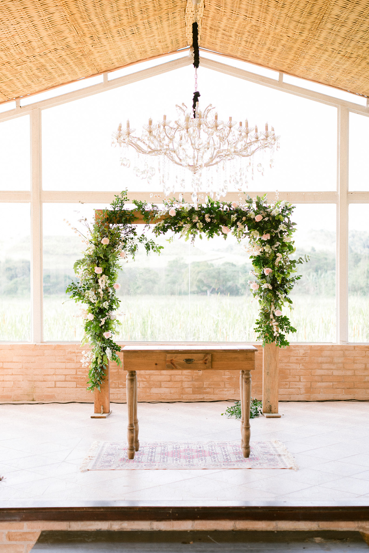 A decoração no estilo romântico em tons de branco, toques de rosé e detalhes de marrom das madeiras. A Isabela comentou: “Um detalhe muito legal é que a decoradora desenhou um bolo muito charmoso que continha elementos da identidade visual do casamento”.